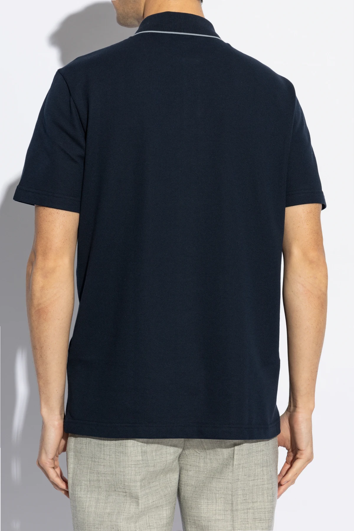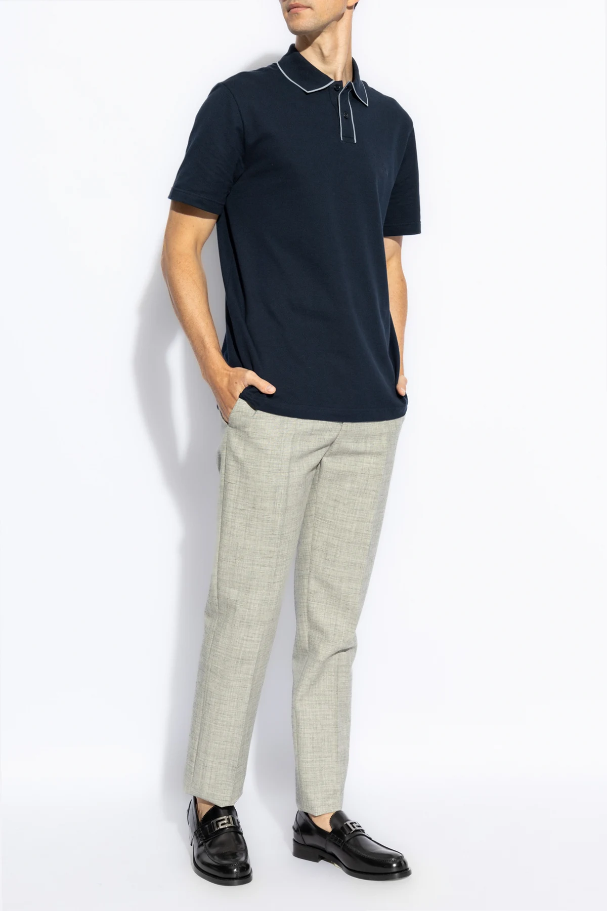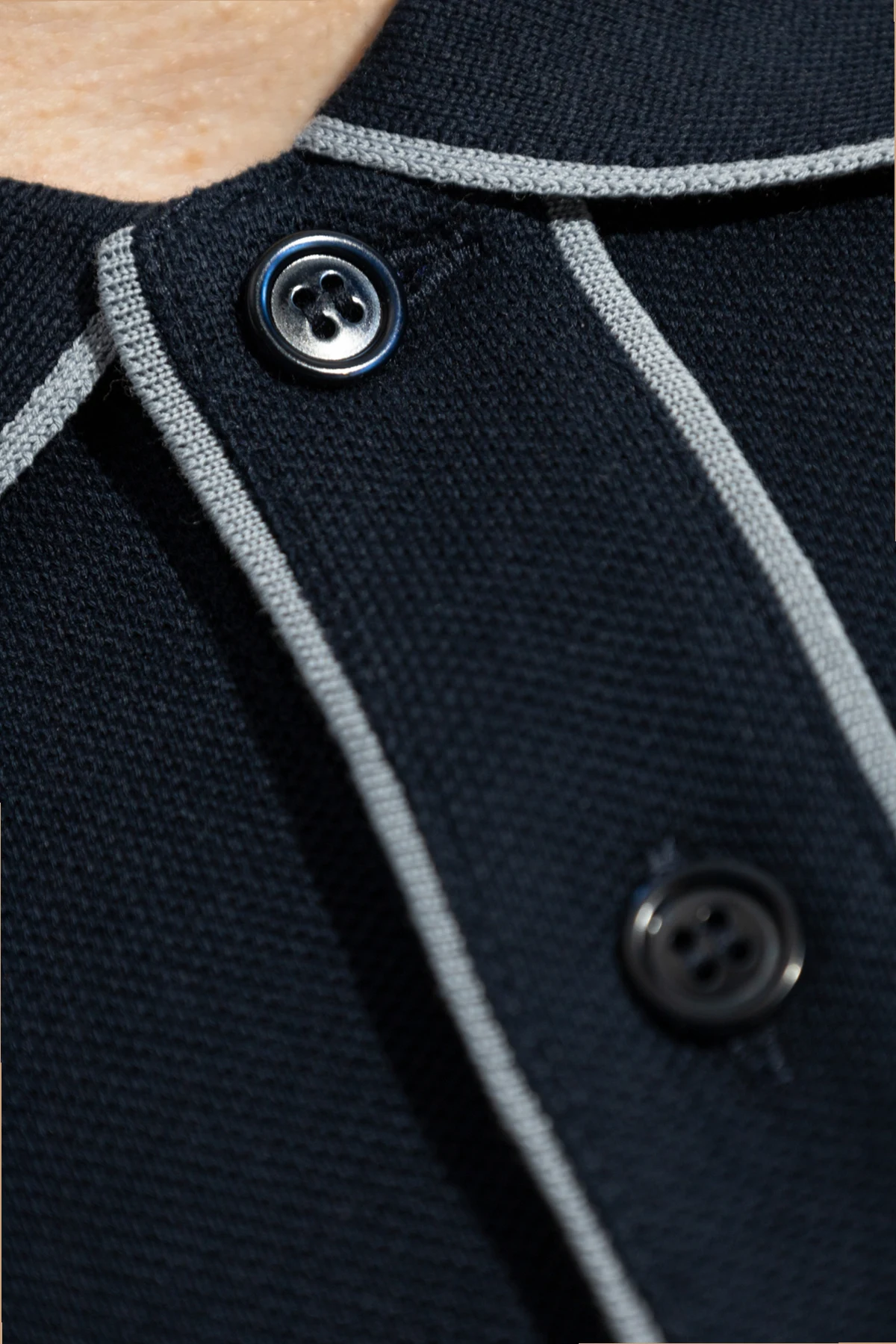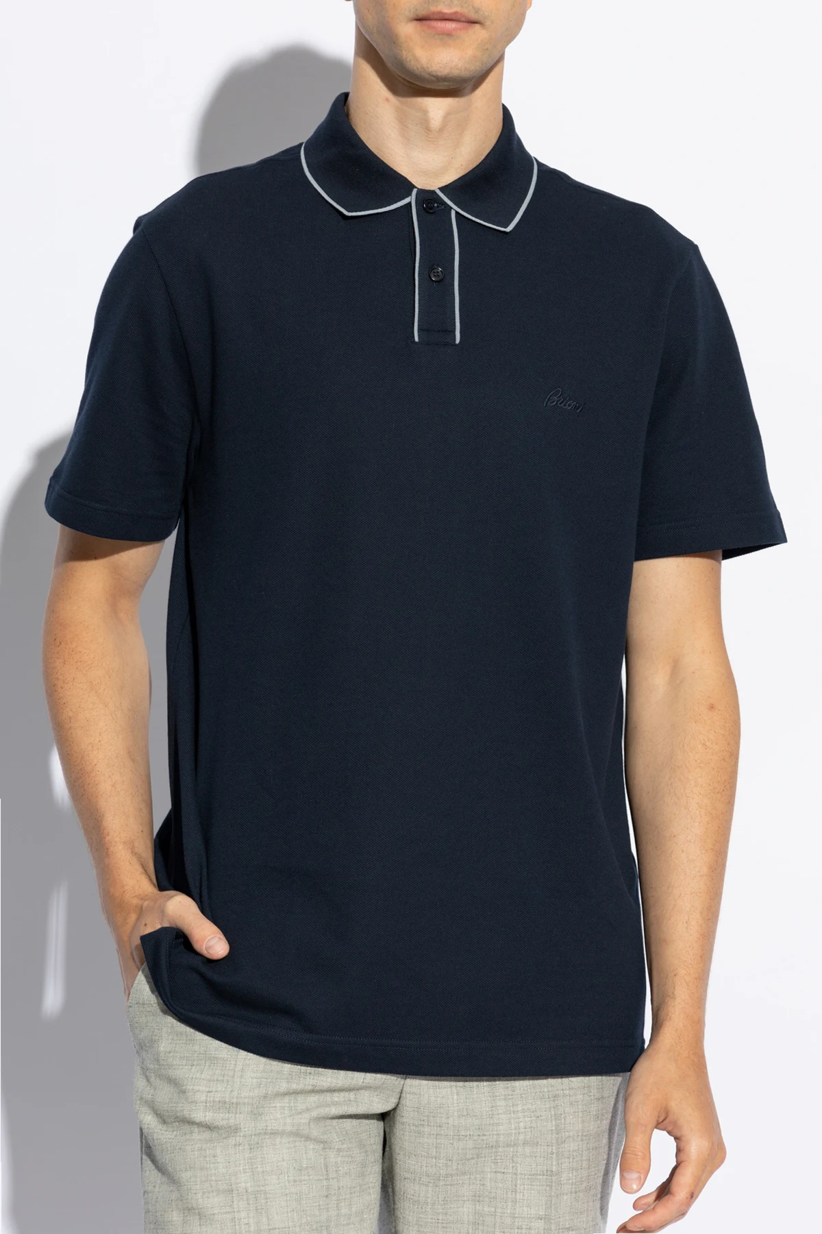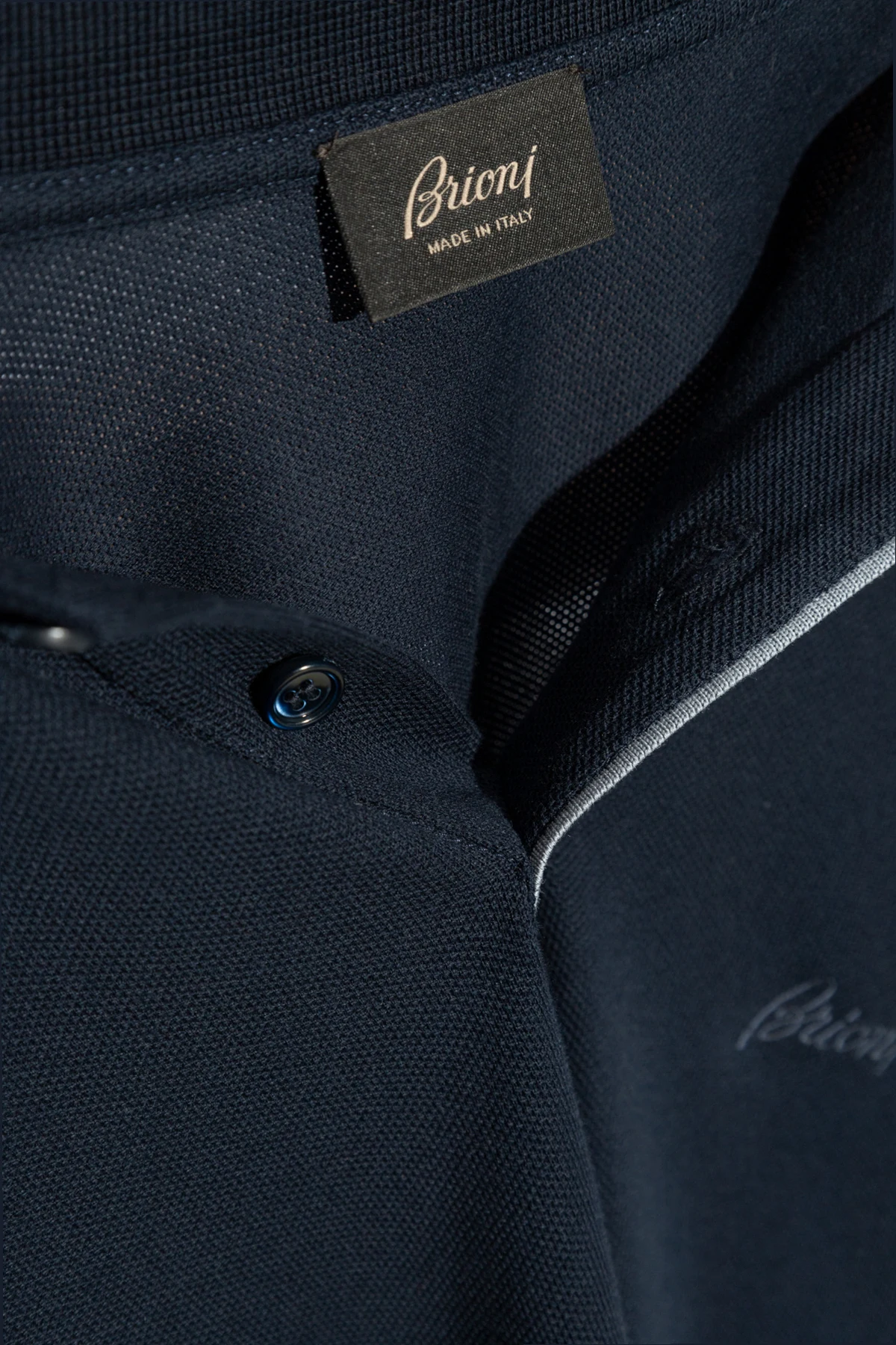 Koszulka charakteryzuje się okrągłym dekoltem z kołnierzykiem zapinanym na guziki, co jest typowym i rozpoznawalnym elementem stylu polo. Dodatkowo, na lewej piersi umieszczono dyskretne logo Brioni , będące symbolem luksusu i ekskluzywności. Precyzyjnie wykonane szwy oraz kolorystycznie dopasowane guziki świadczą o nieskazitelnej dbałości o detale, która jest znakiem rozpoznawczym marki.