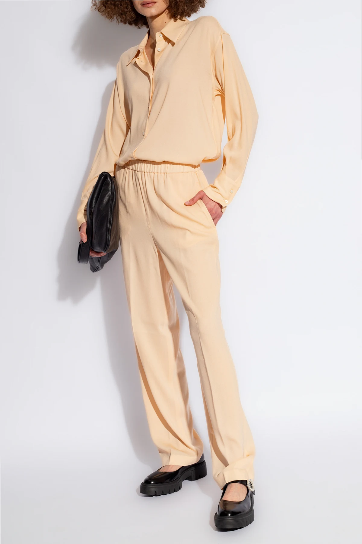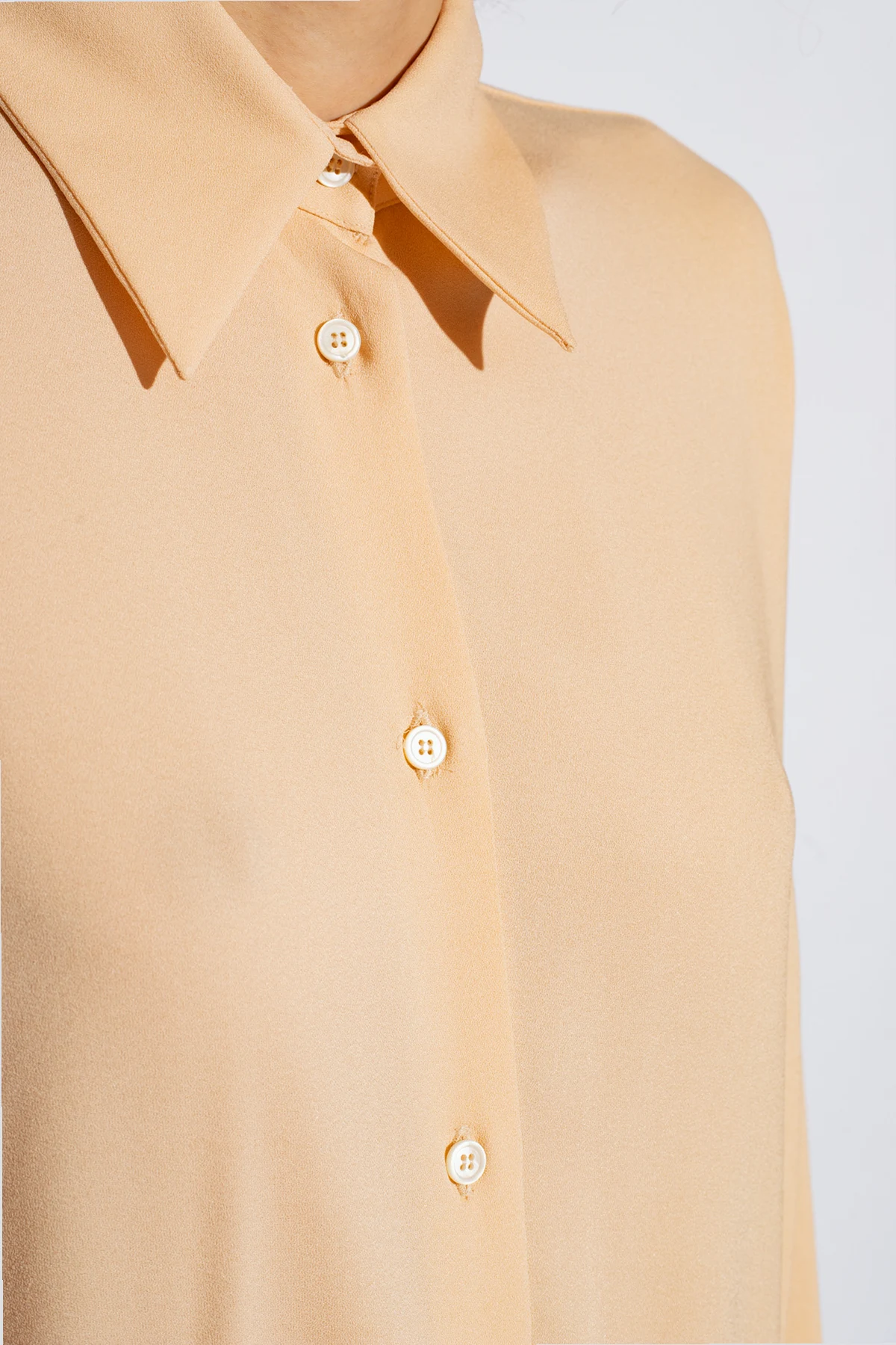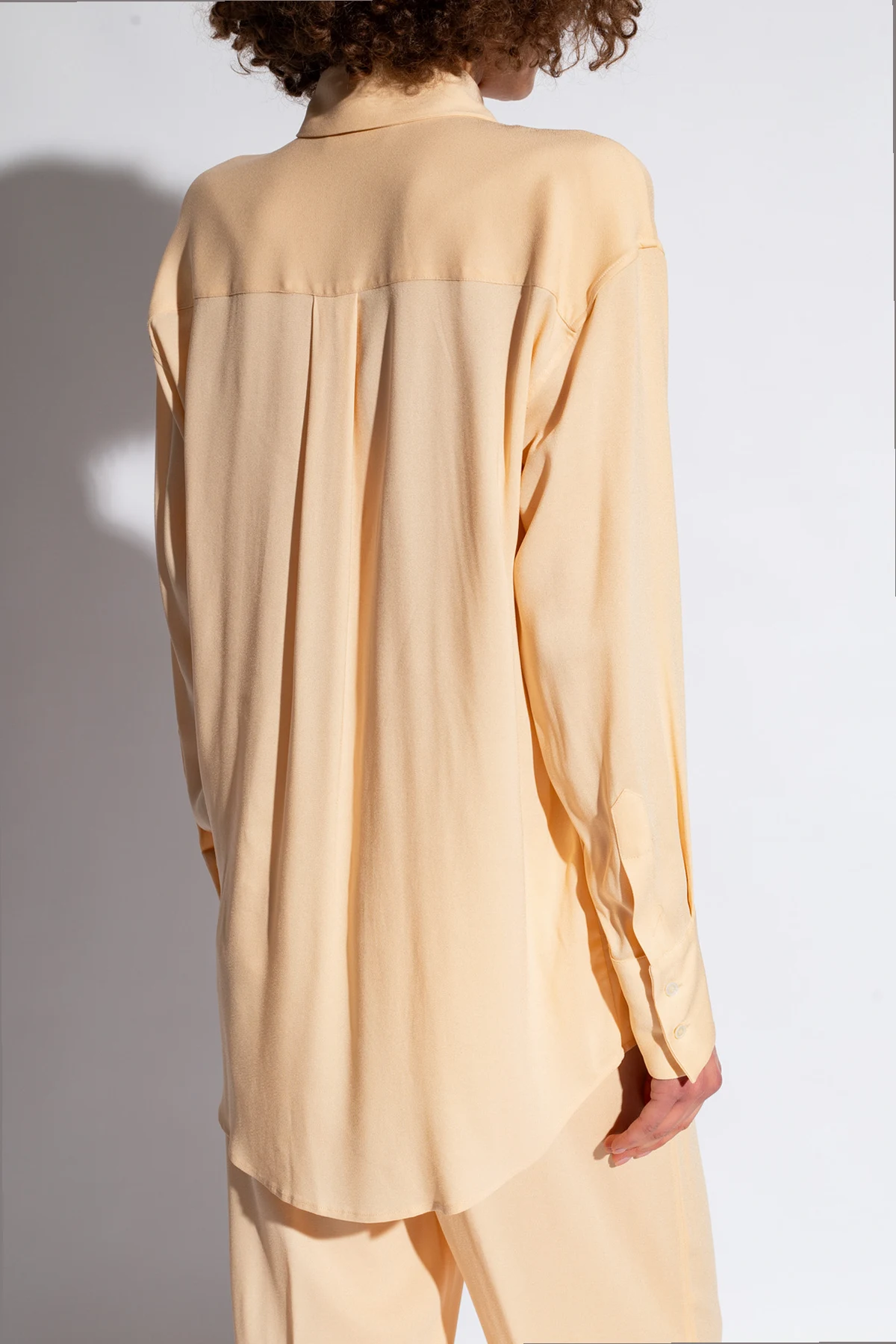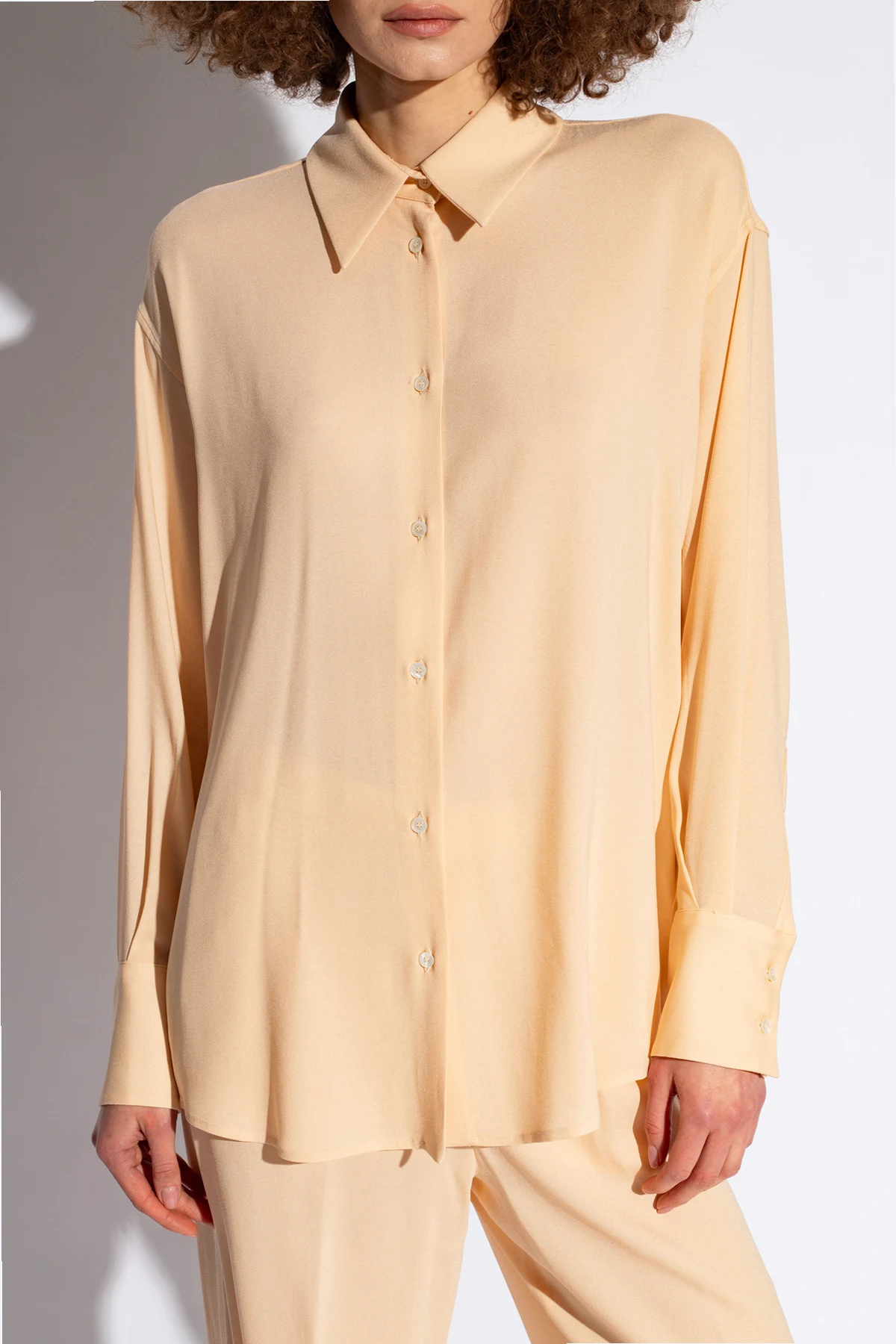Beżowa koszula o luźnym kroju Fabiana Filippi. Zapinana na guziki. Dekolt wykończony kołnierzem. Długie rękawy zakończone mankietami zapinanymi na guziki.