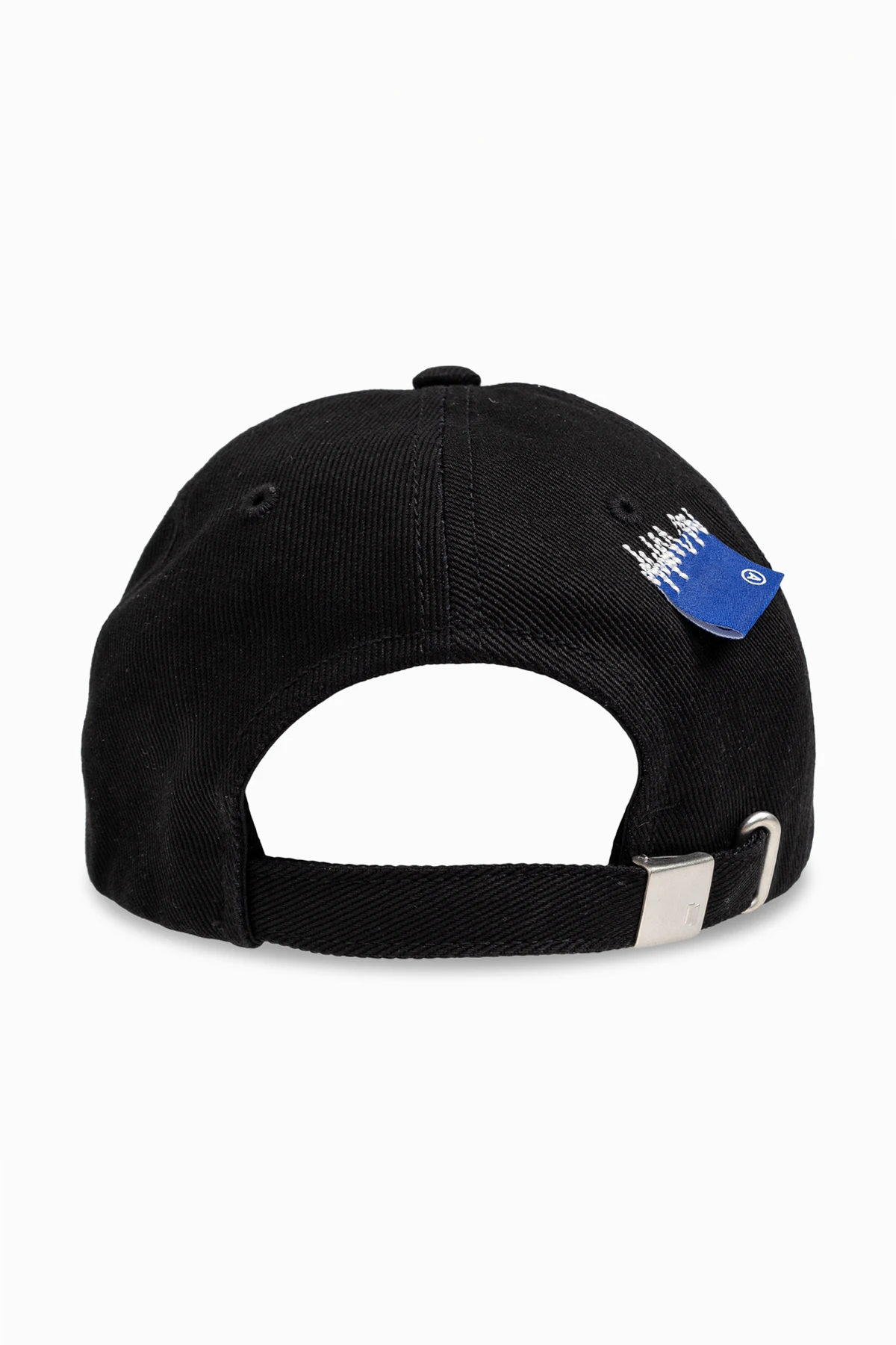 Z tyłu czapki znajduje się regulowany pasek z metalową klamrą, co umożliwia idealne dopasowanie do każdego rozmiaru głowy. Dodatkowo, obok paska umieszczona jest niebieska metka z białym napisem. Starannie wykonane szwy podkreślają wysoką jakość produktu.