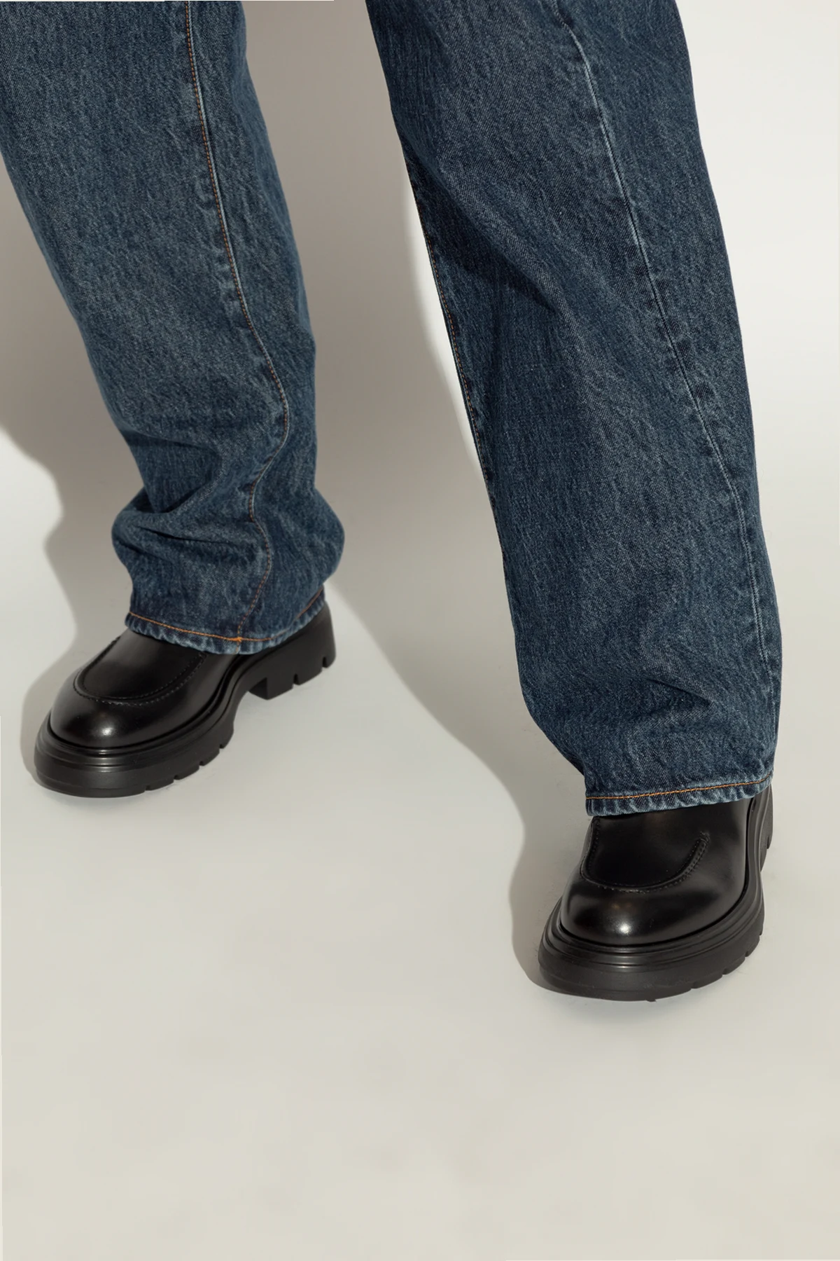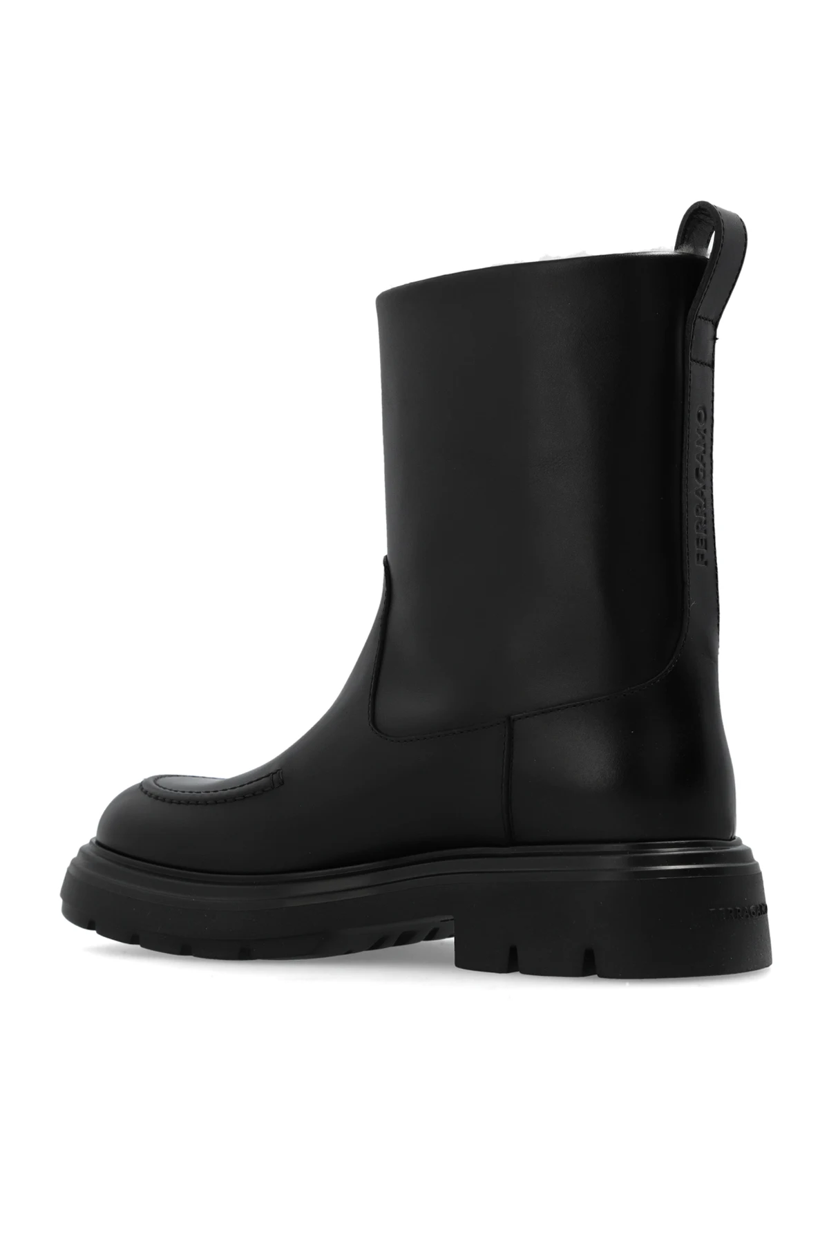 Botki charakteryzują się prostym, uniwersalnym kształtem z zaokrąglonym noskiem oraz średniej wysokości cholewką, która sięga nieco powyżej kostki. Na boku cholewki umieszczono prostokątną naszywkę z wytłoczonym logo marki, co dodaje im wyrafinowanego charakteru.