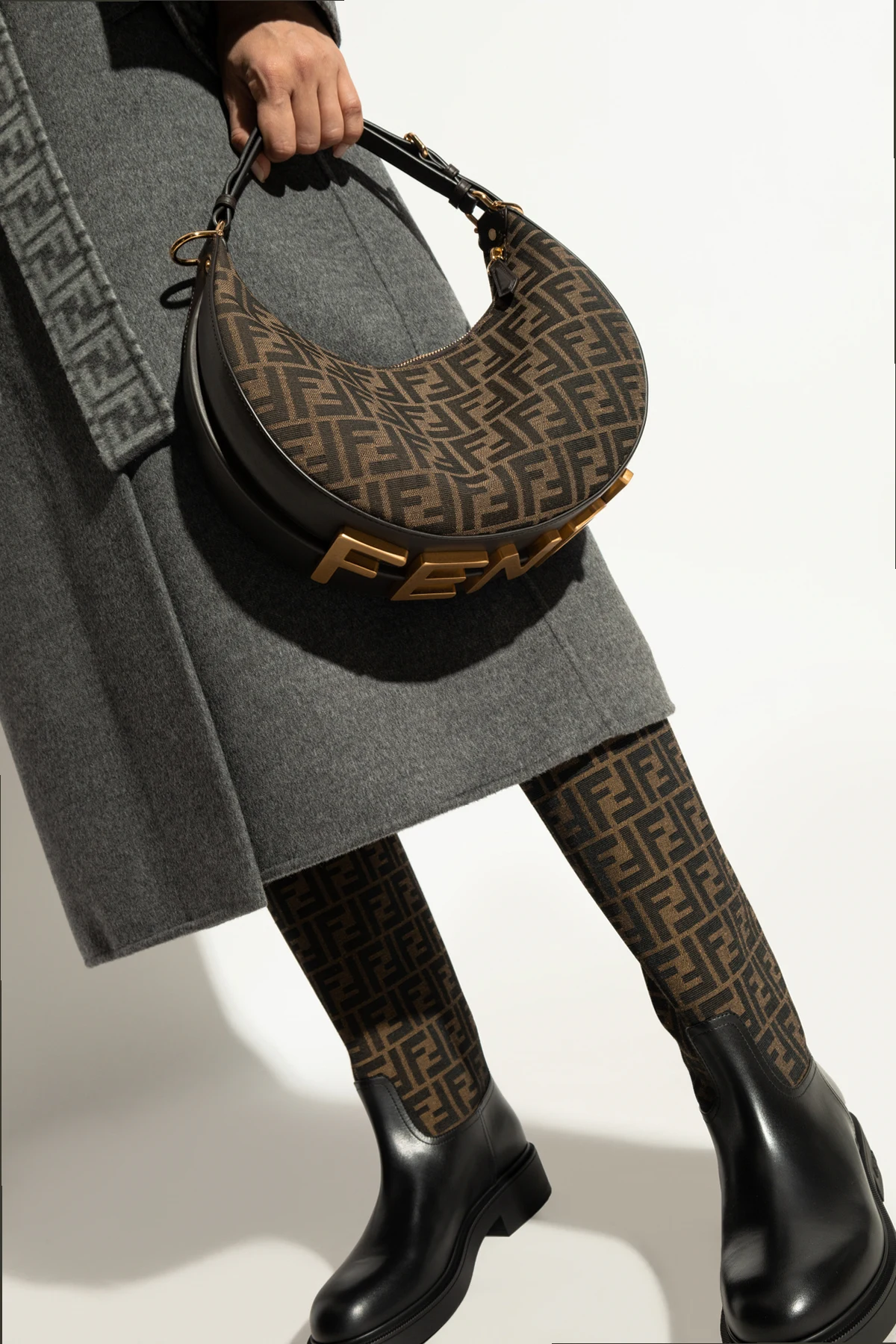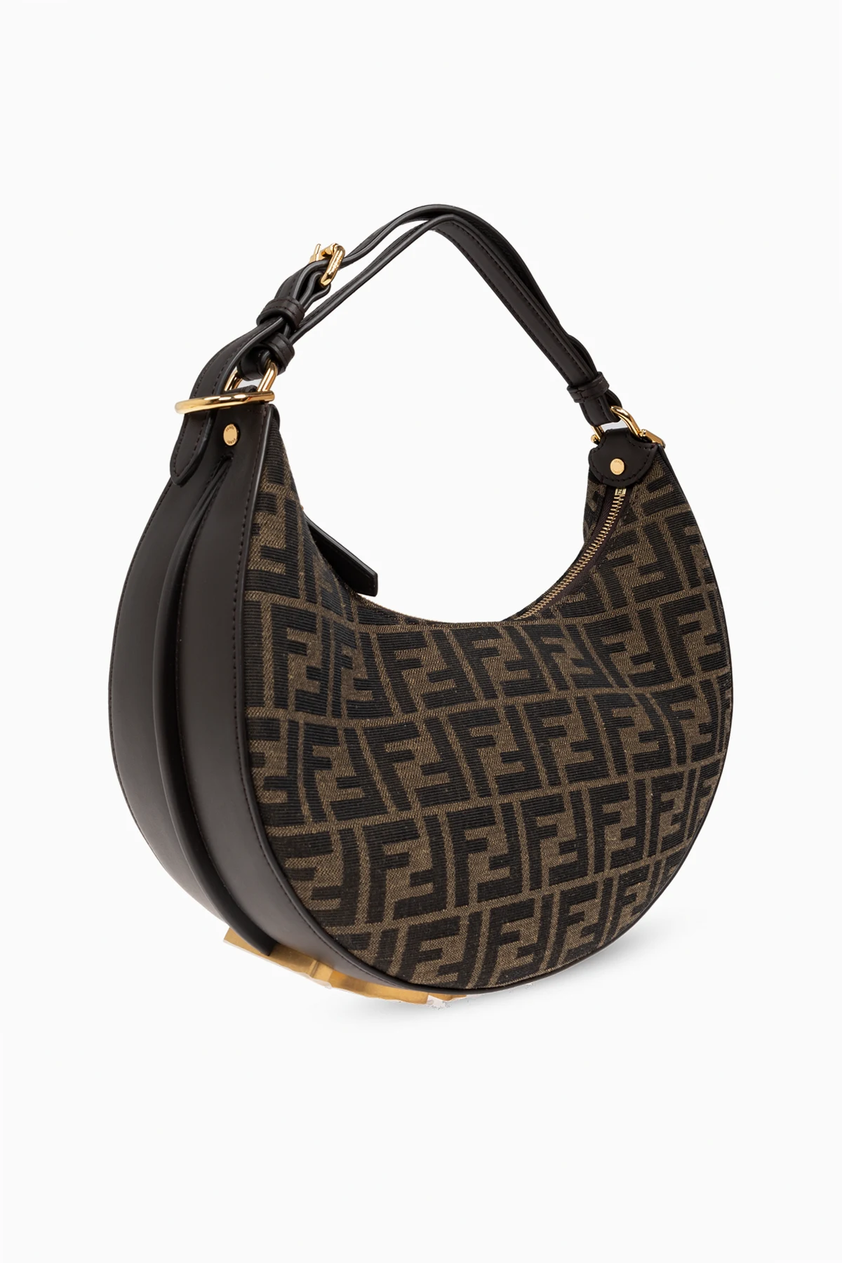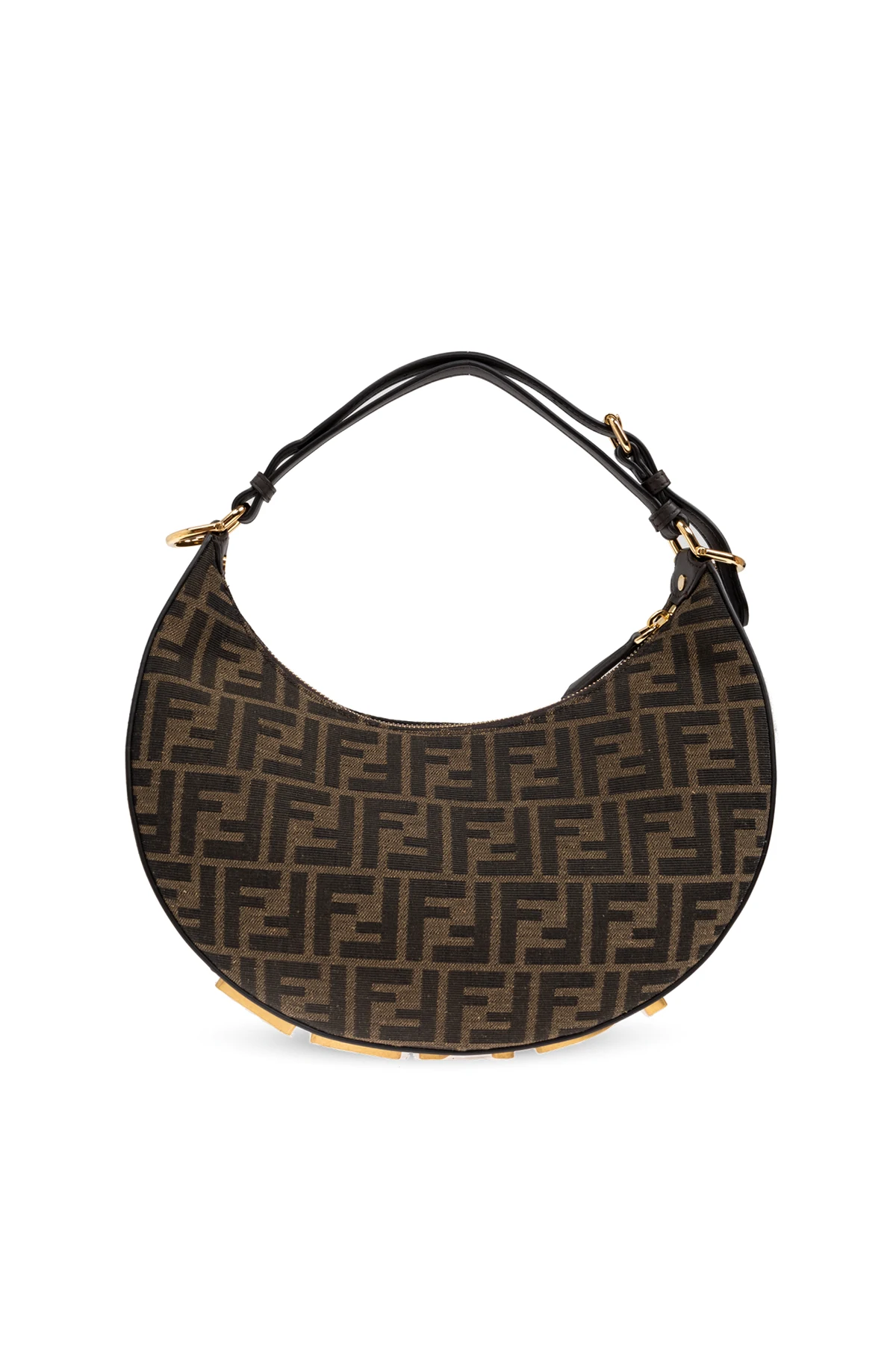 Przedstawiamy torbę na ramię ‘Fendigraphy Small’ z prestiżowej kolekcji domu mody Fendi, będącą uosobieniem luksusu i wyrafinowanego stylu. Jej półokrągła forma, przypominająca księżyc, w połączeniu z klasycznym motywem monogramu „FF” w odcieniach brązu i czerni, przyciąga wzrok i stanowi o jej niepowtarzalności.