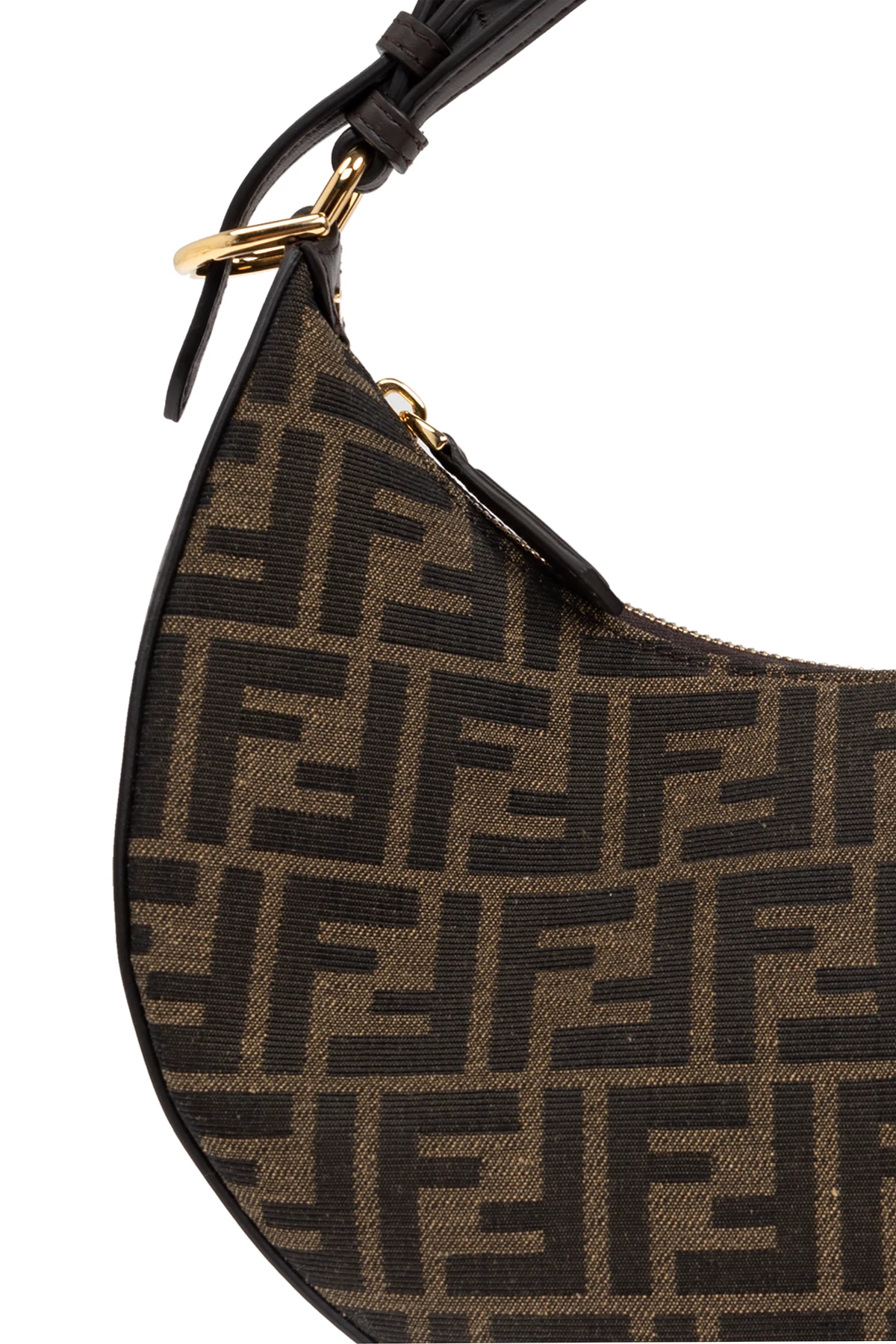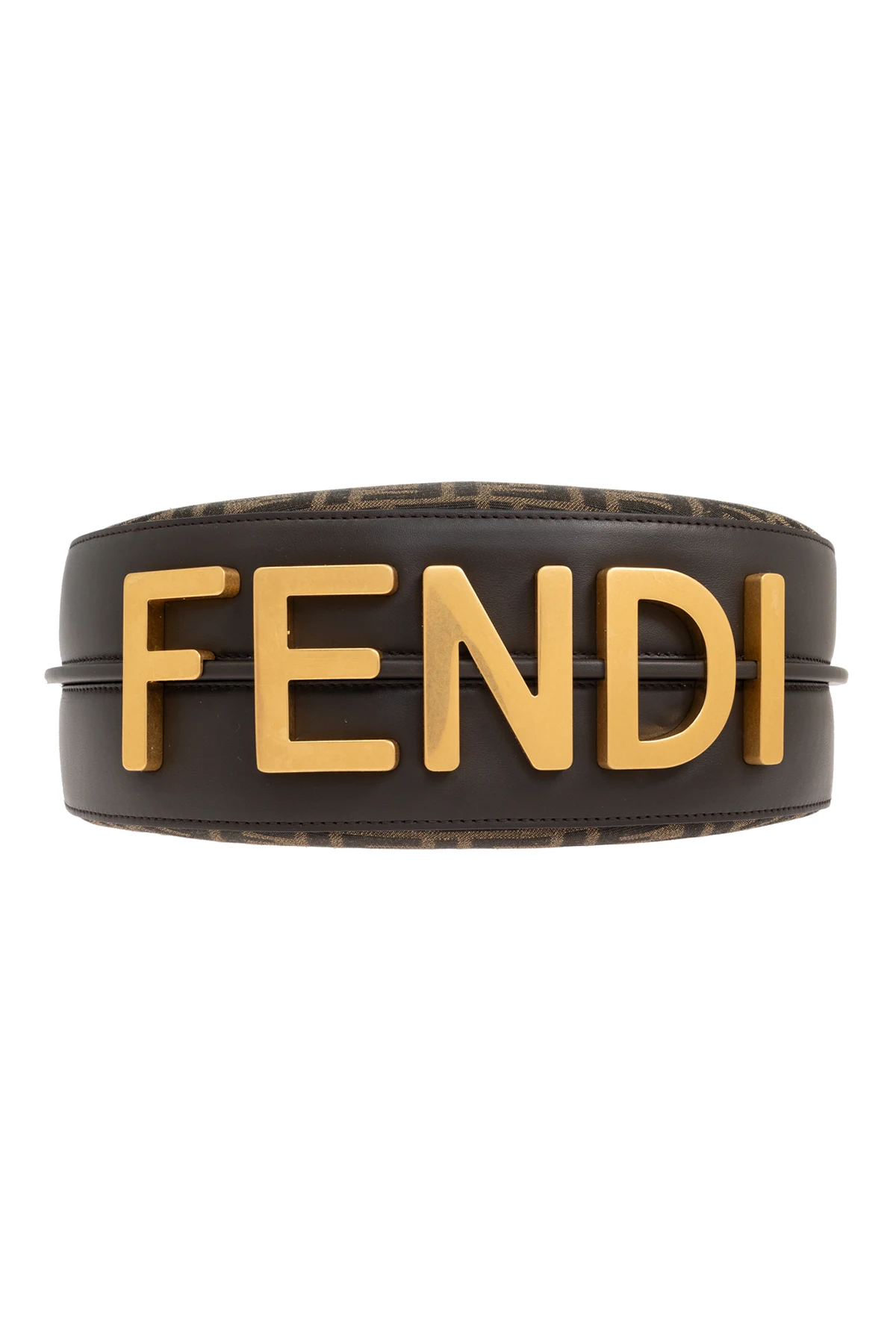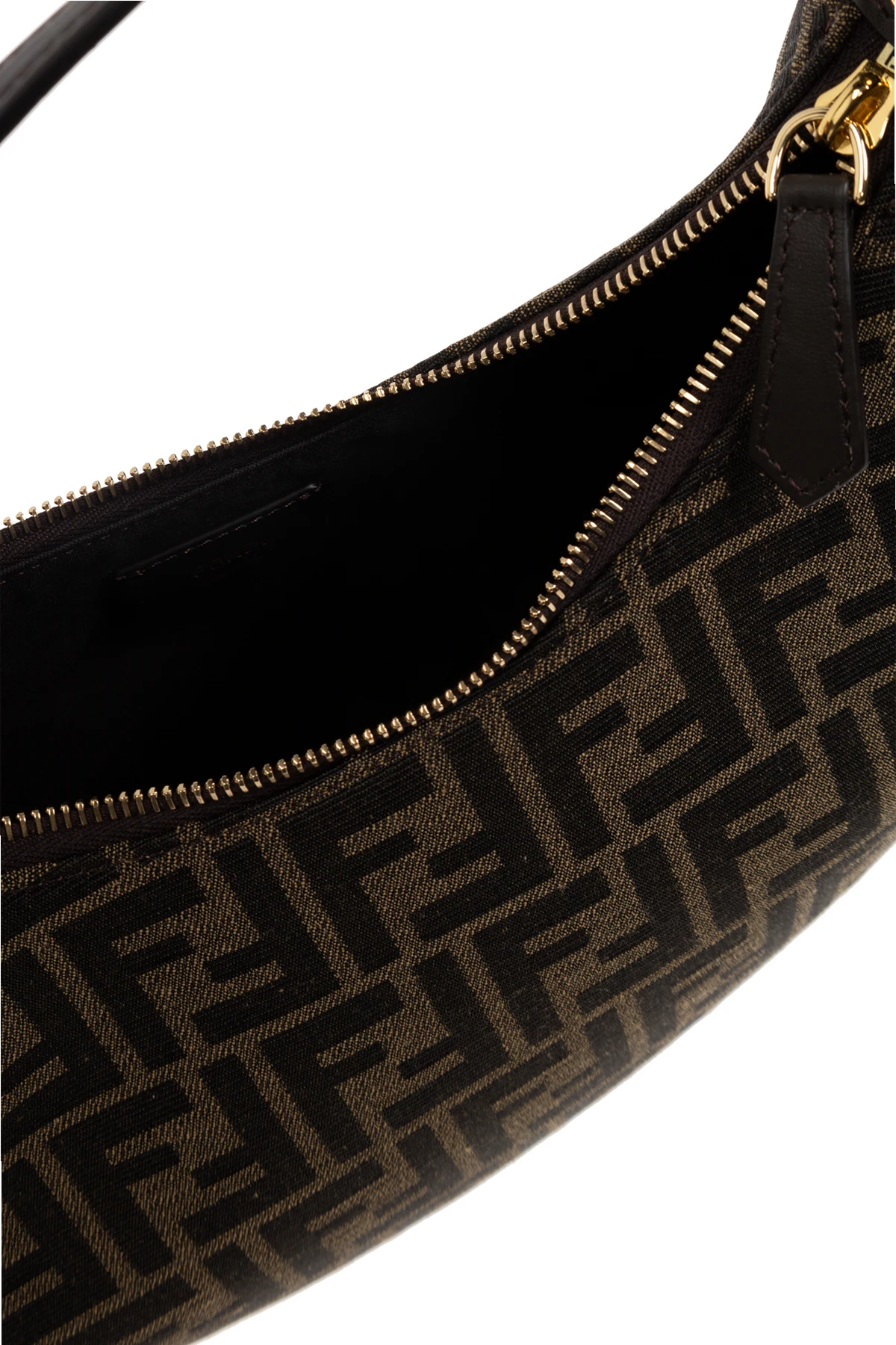 Przedstawiamy torbę na ramię ‘Fendigraphy Small’ z prestiżowej kolekcji domu mody Fendi, będącą uosobieniem luksusu i wyrafinowanego stylu. Jej półokrągła forma, przypominająca księżyc, w połączeniu z klasycznym motywem monogramu „FF” w odcieniach brązu i czerni, przyciąga wzrok i stanowi o jej niepowtarzalności.