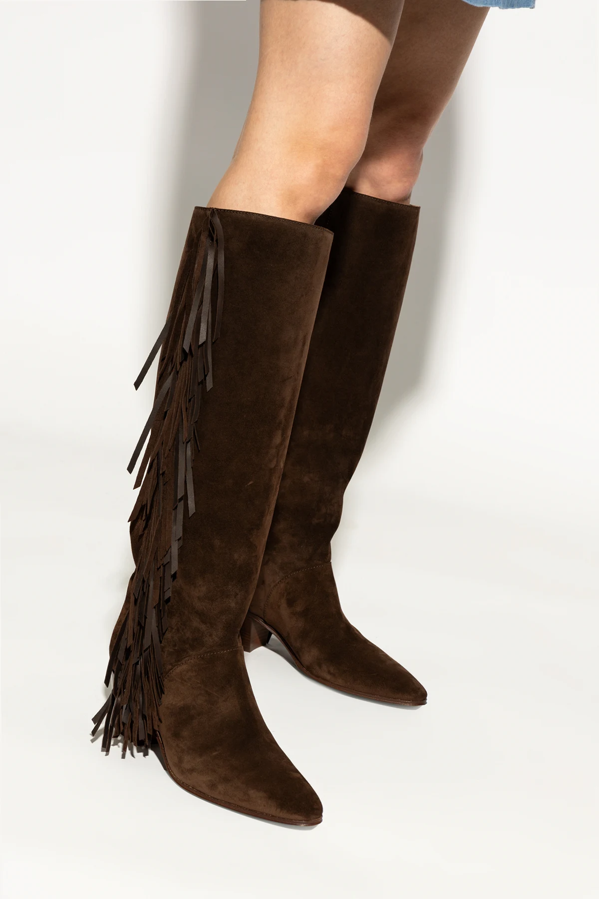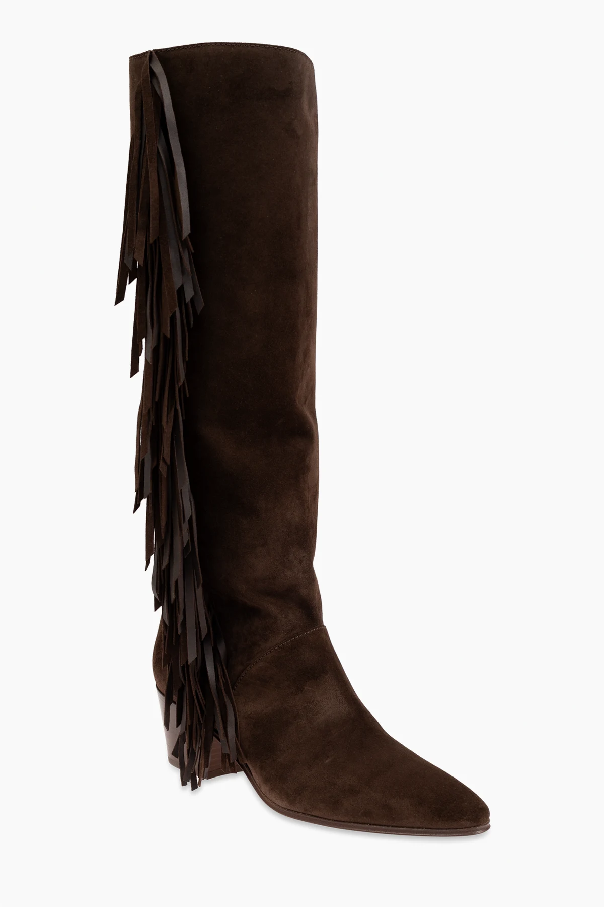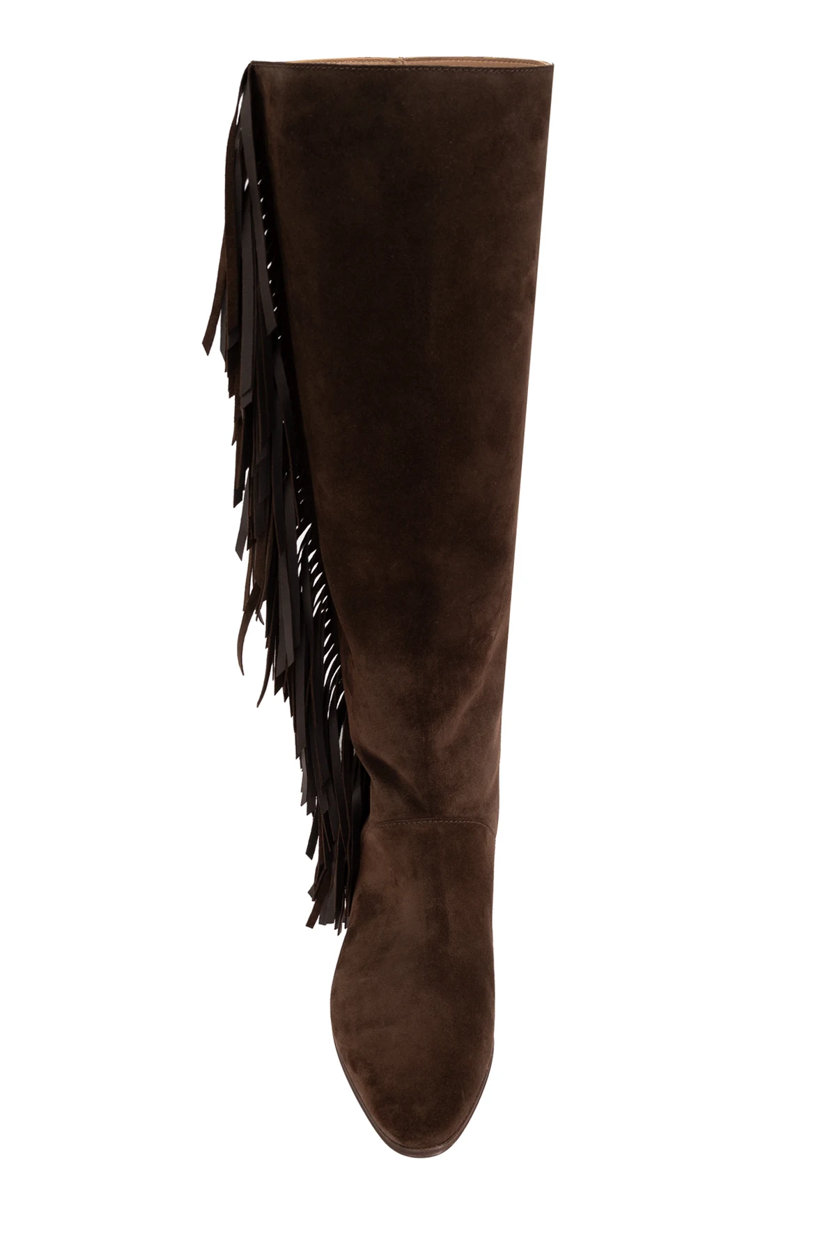 Wykonane z najwyższej jakości zamszu, kozaki te emanują elegancją i miękkością, a ich jednolity, brązowy kolor sprawia, że są uniwersalne i łatwe do dopasowania do różnych stylizacji. Subtelne, zaokrąglone noski dodają im klasy, natomiast ozdobne frędzle po zewnętrznej stronie nadają unikalny i modowy charakter, który przyciąga wzrok.