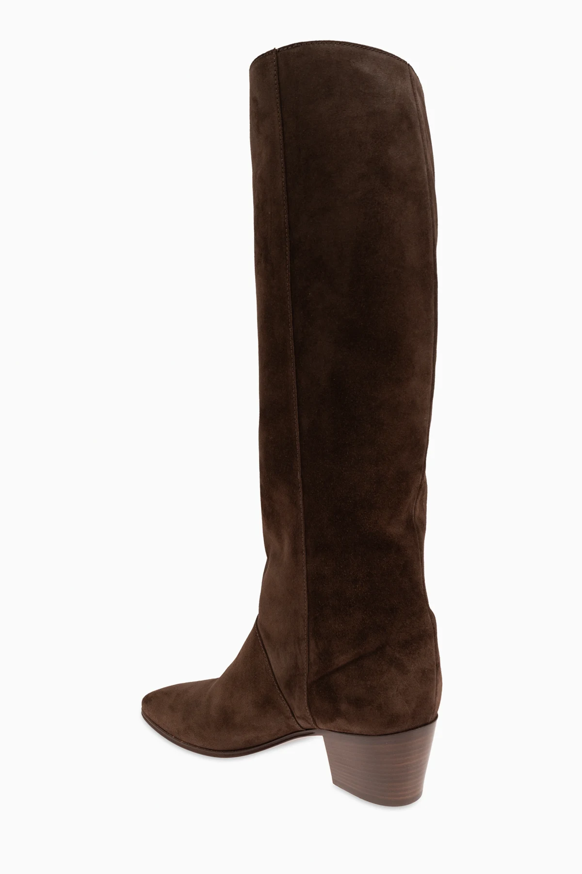 Przedstawiamy Państwu zamszowe kozaki z ekskluzywnej kolekcji marki Casadei . Te wyjątkowe buty charakteryzują się klasycznym, wysokim fasonem, sięgającym poniżej kolana, oraz średniej wysokości, szerokim obcasem, który zapewnia stabilność i wygodę.