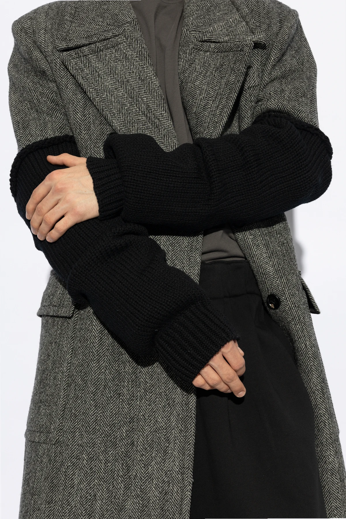 Prezentowane na modelu w połączeniu z szarym płaszczem, rękawy rewelacyjnie komponują się z różnorodnymi stylami, odświeżając i dodając oryginalności tradycyjnym outfitom.