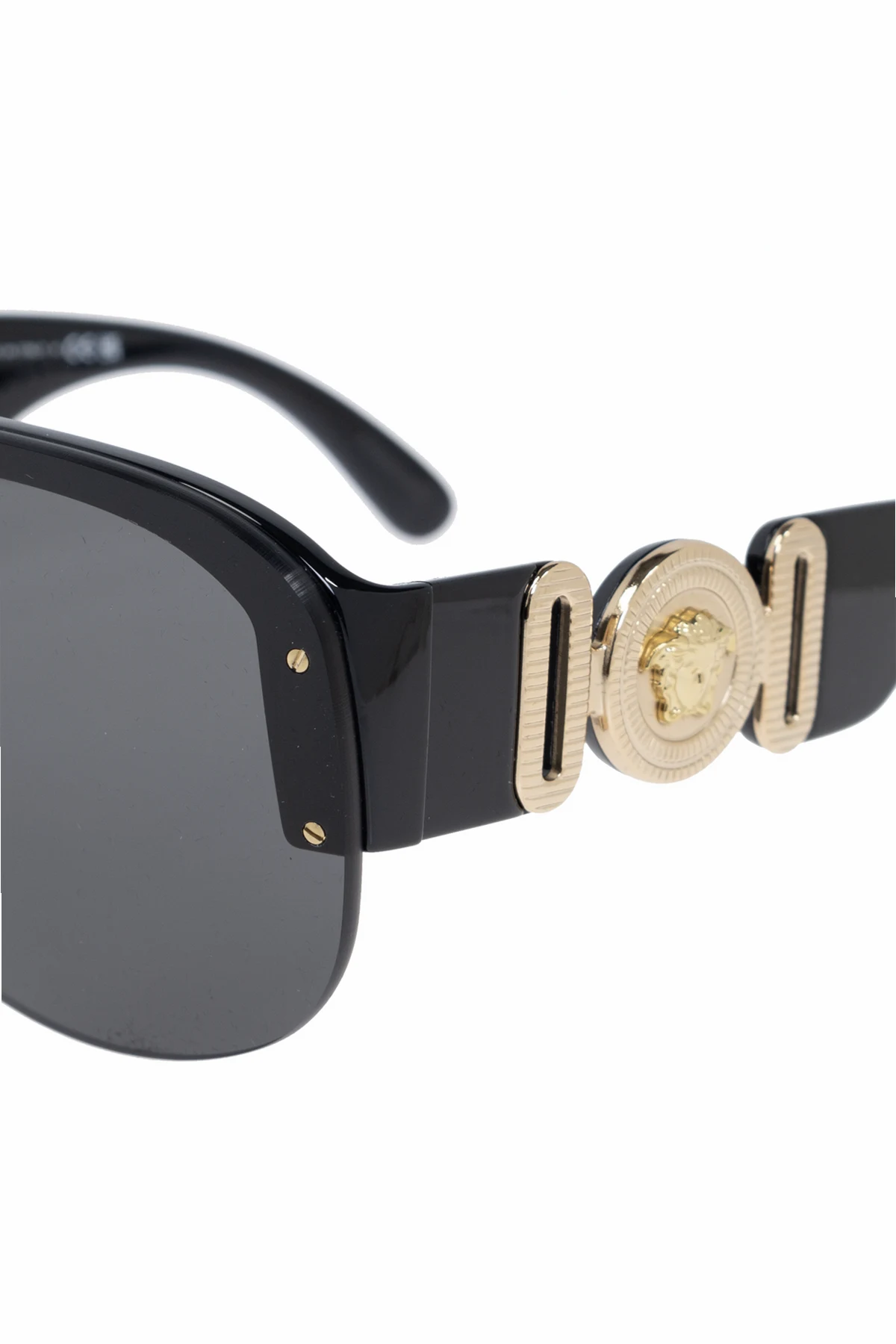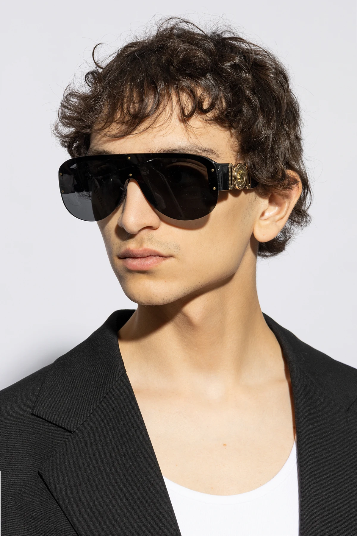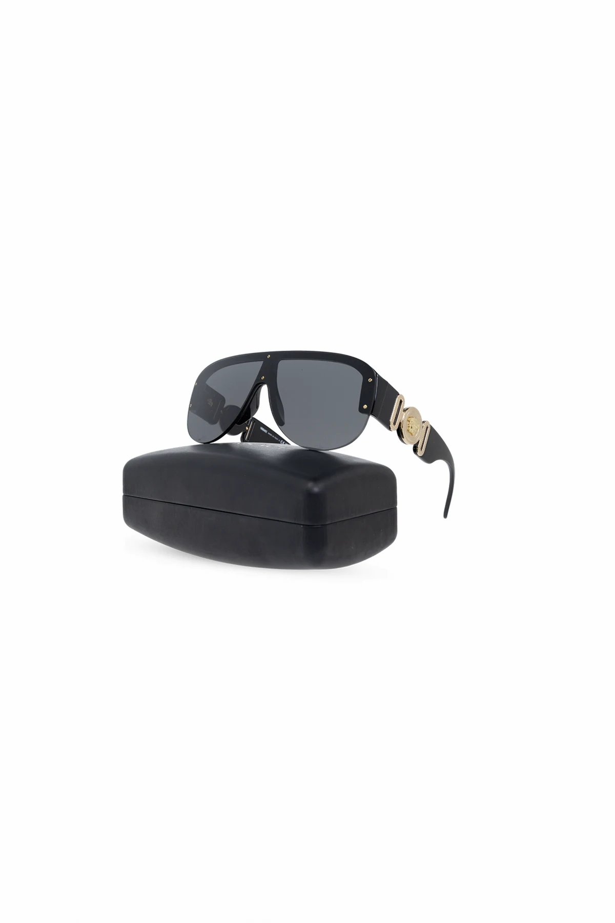 Przedstawiamy Państwu okulary przeciwsłoneczne od Versace , kwintesencję luksusu i nowoczesnego designu. Wykonane w całości z acetatu, te imponujące okulary charakteryzują się dużymi, jednoczęściowymi soczewkami z gradientowym ciemnieniem, które subtelnym przejściem od ciemniejszej góry do jaśniejszego dołu ochraniają wzrok przed intensywnym światłem słonecznym. Ich czarna oprawka ozdobiona jest złotymi detalami, w tym charakterystycznymi okrągłymi nitami oraz większym logo marki na zausznikach, nadającymi im wyjątkowego charakteru.
