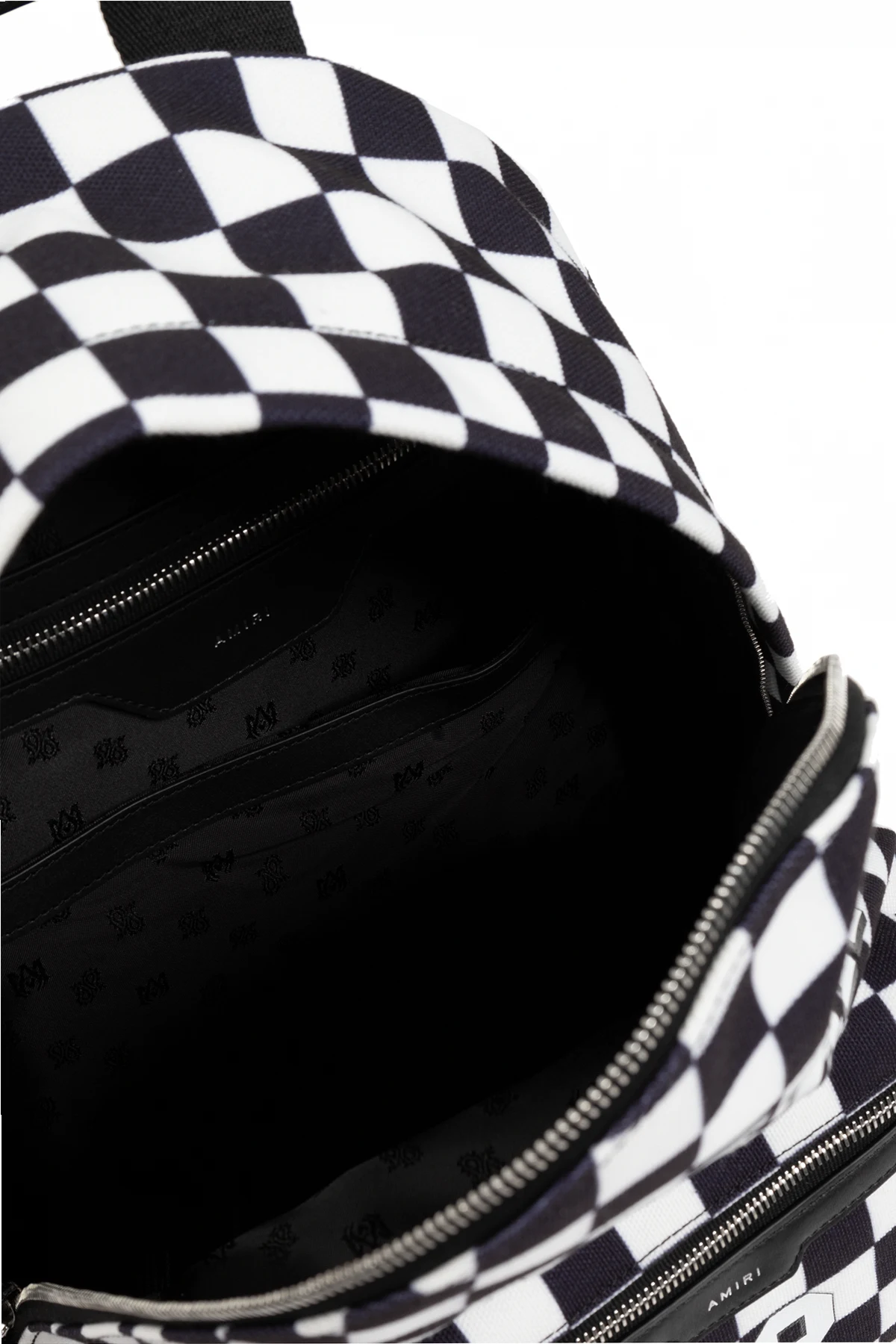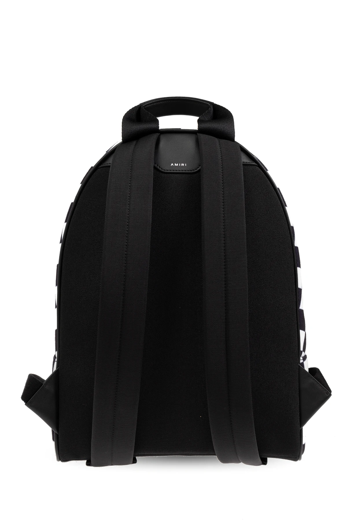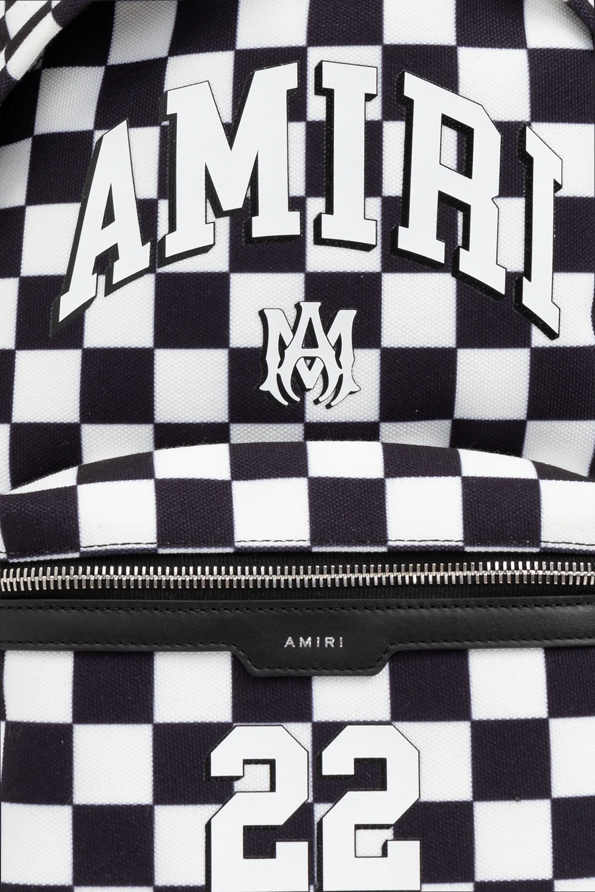 Wykonany z najwyższej jakości nylonu, plecak zapewnia trwałość i wytrzymałość, co jest charakterystyczne dla produktów luksusowych marek. Na przedniej stronie znajduje się duży, biały napis "AMIRI" oraz logo w kształcie litery "M", a także liczba "22" umieszczona na dolnej części frontu.