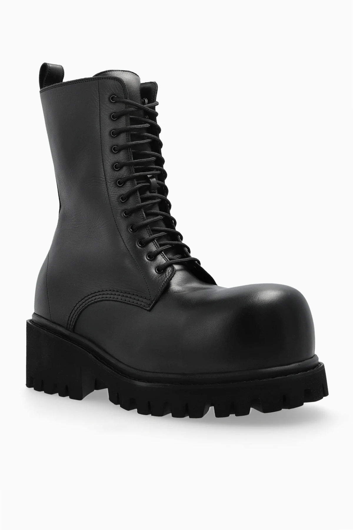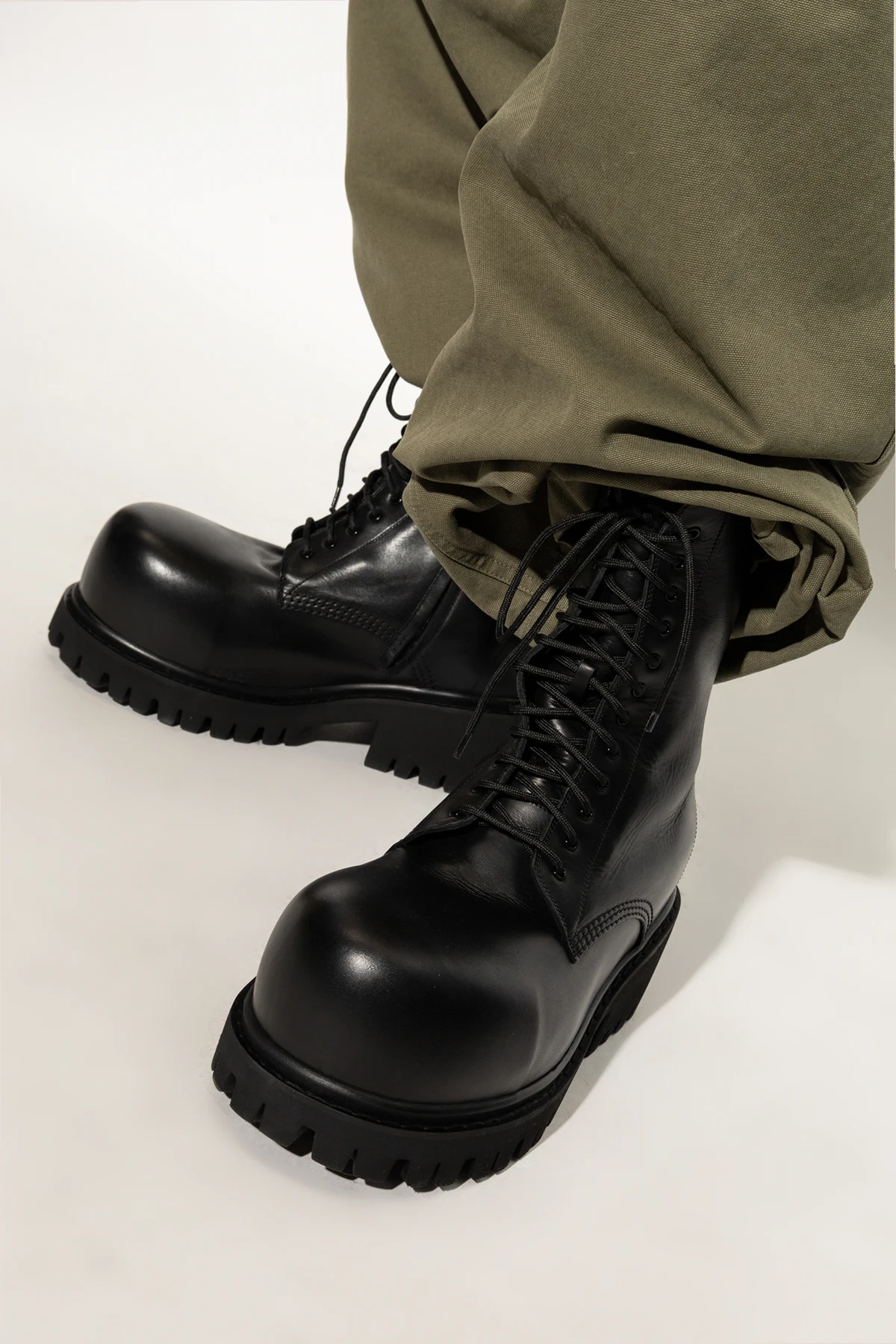 Prezentujemy botki "Stomper" z ekskluzywnej kolekcji niekwestionowanego mistrza haute couture, marki Balenciaga . Te czarne botki emanują elegancją i surowością, dzięki precyzyjnie dobranej, gładkiej skórze, z której zostały wykonane. Ich masywny design, z wyraźnie żłobioną gumową podeszwą, czyni je unikatowym dodatkiem do każdej stylizacji.