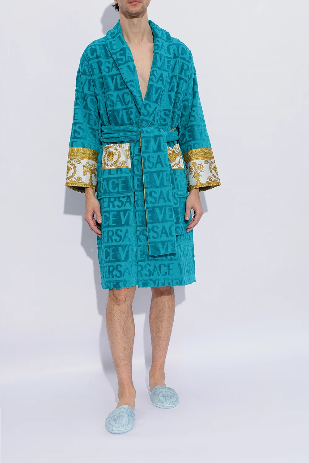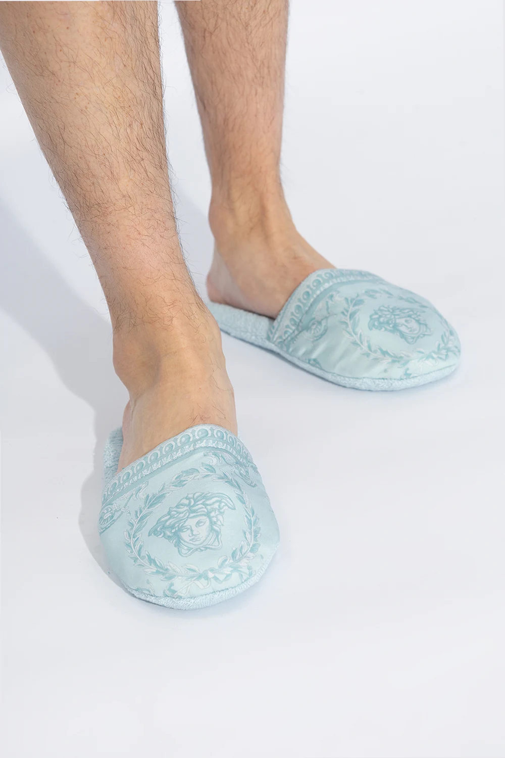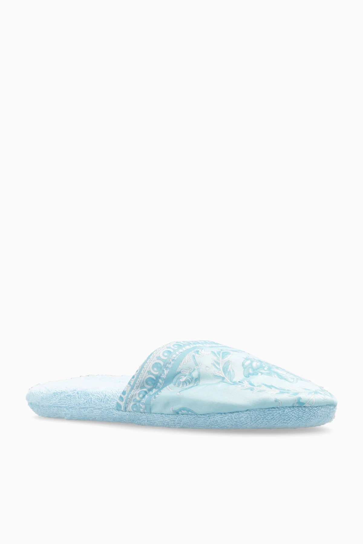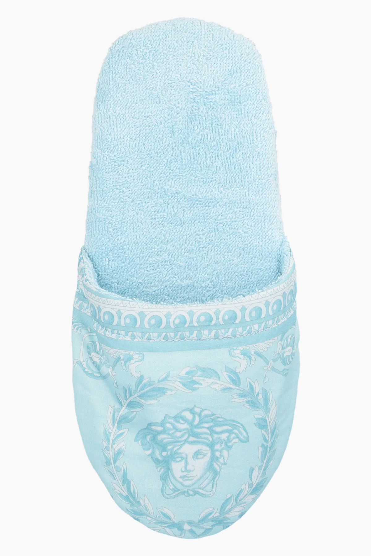 Niebieskie, bawełniane klapki Versace Home. Ozdobione wzorem ‘I Baroque’.