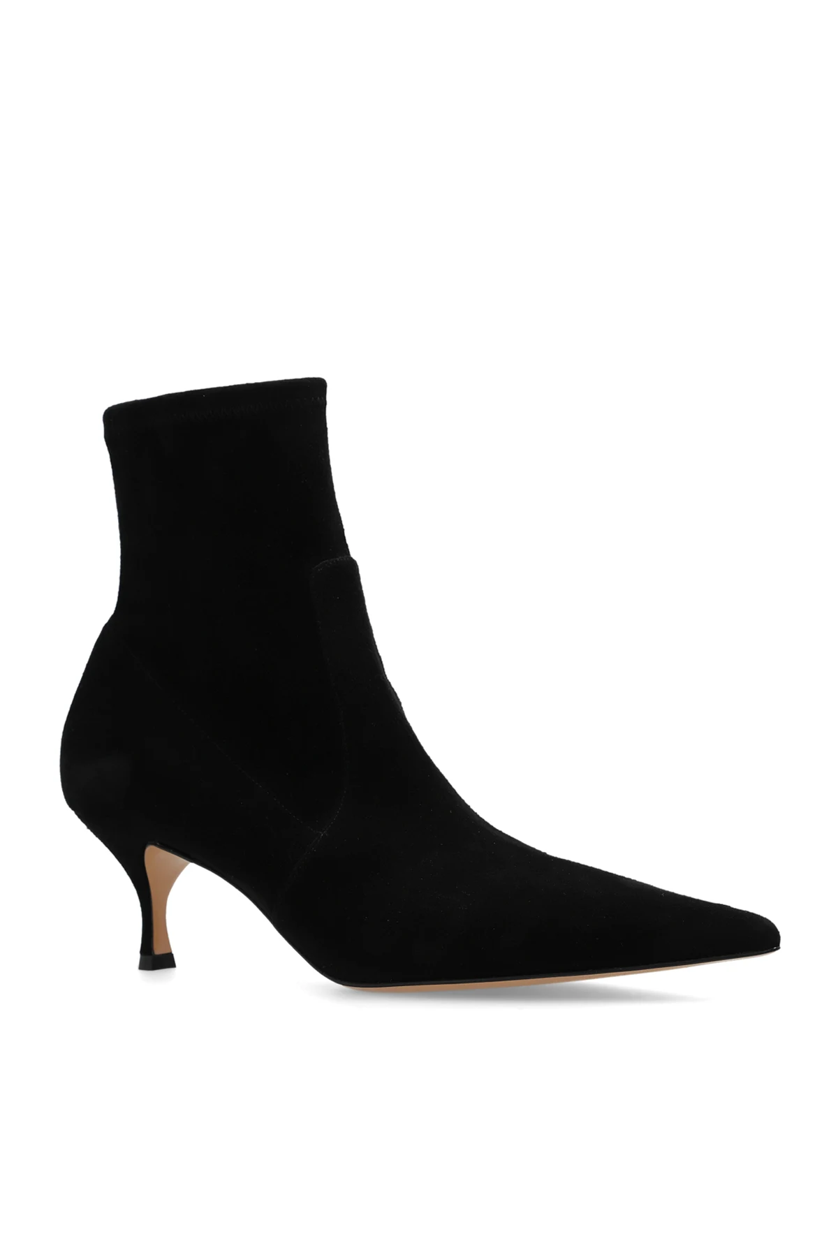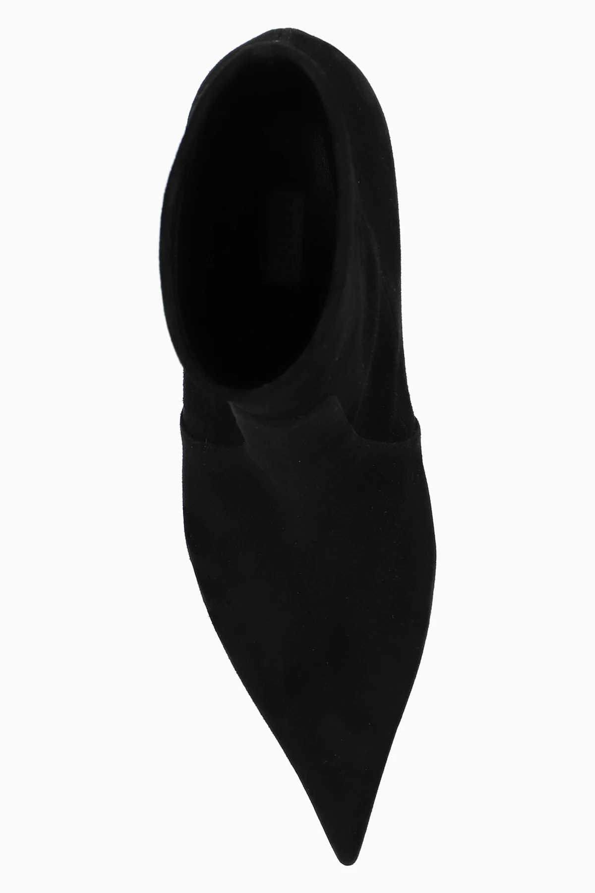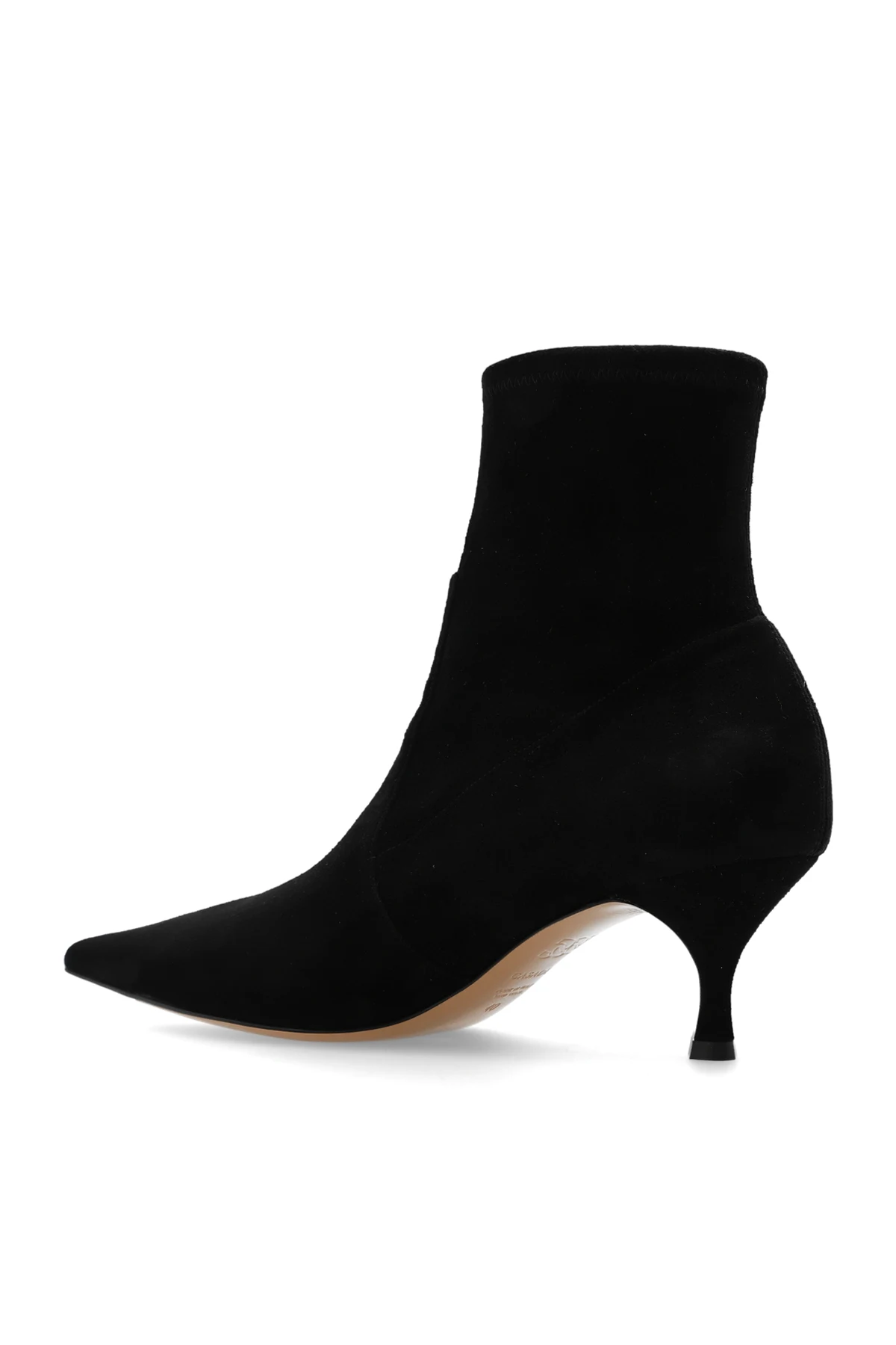 Czarne, wsuwane botki na obcasie Casadei. Wykonane z zamszu. Nosek w szpic. Beżowa, skórzana podeszwa. Wyprodukowano we Włoszech.