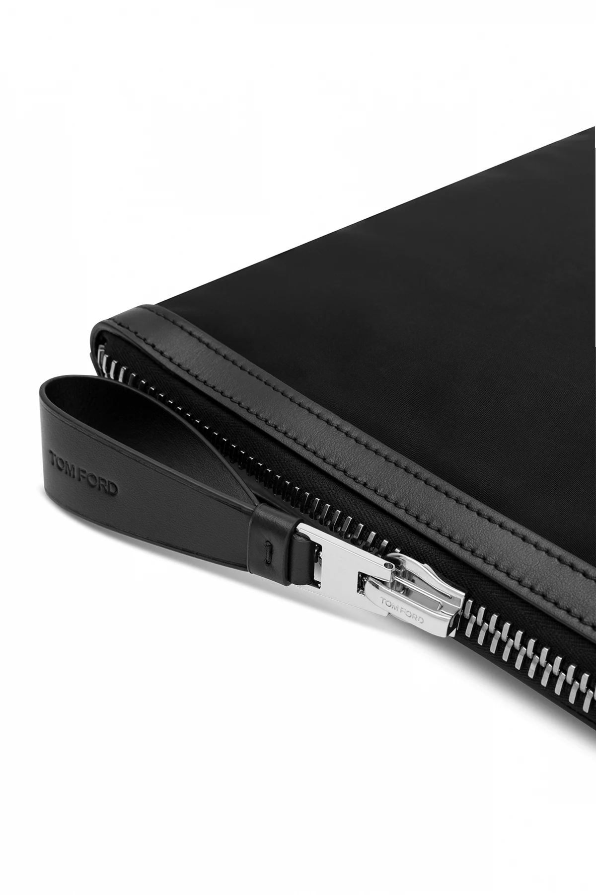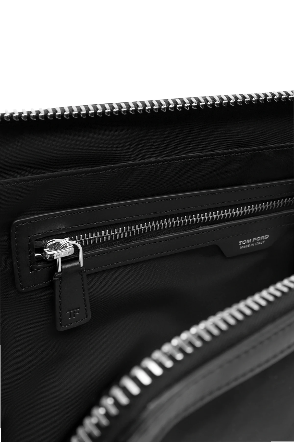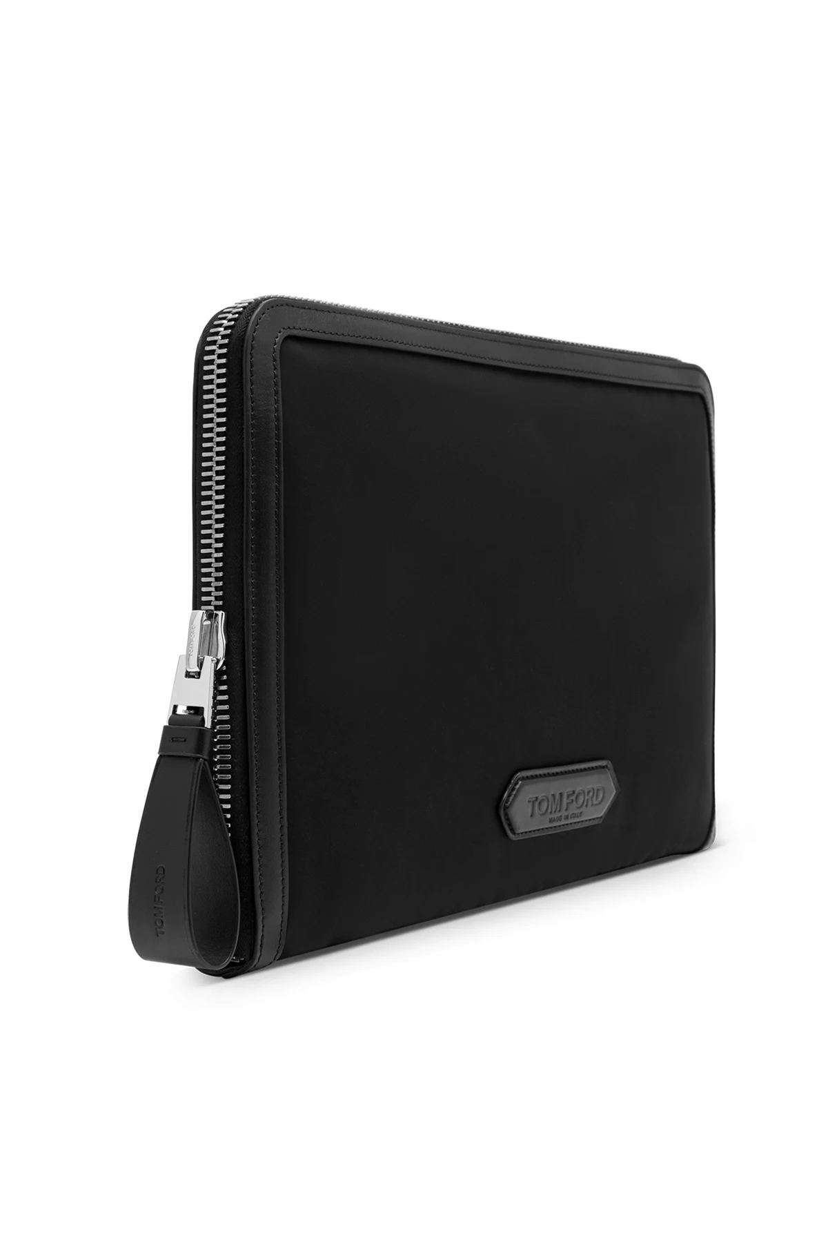 Czarna aktówka Tom Ford. Zamykana na zamek. Ozdobiona aplikacją z logo. Wewnątrz komora, trzy kieszenie: dwie wsuwane i zamykana na zamek, miejsce na długopisy oraz na karty. Metalowe wykończenie w kolorze srebrnym.