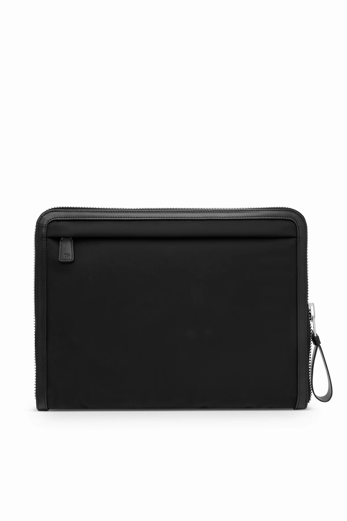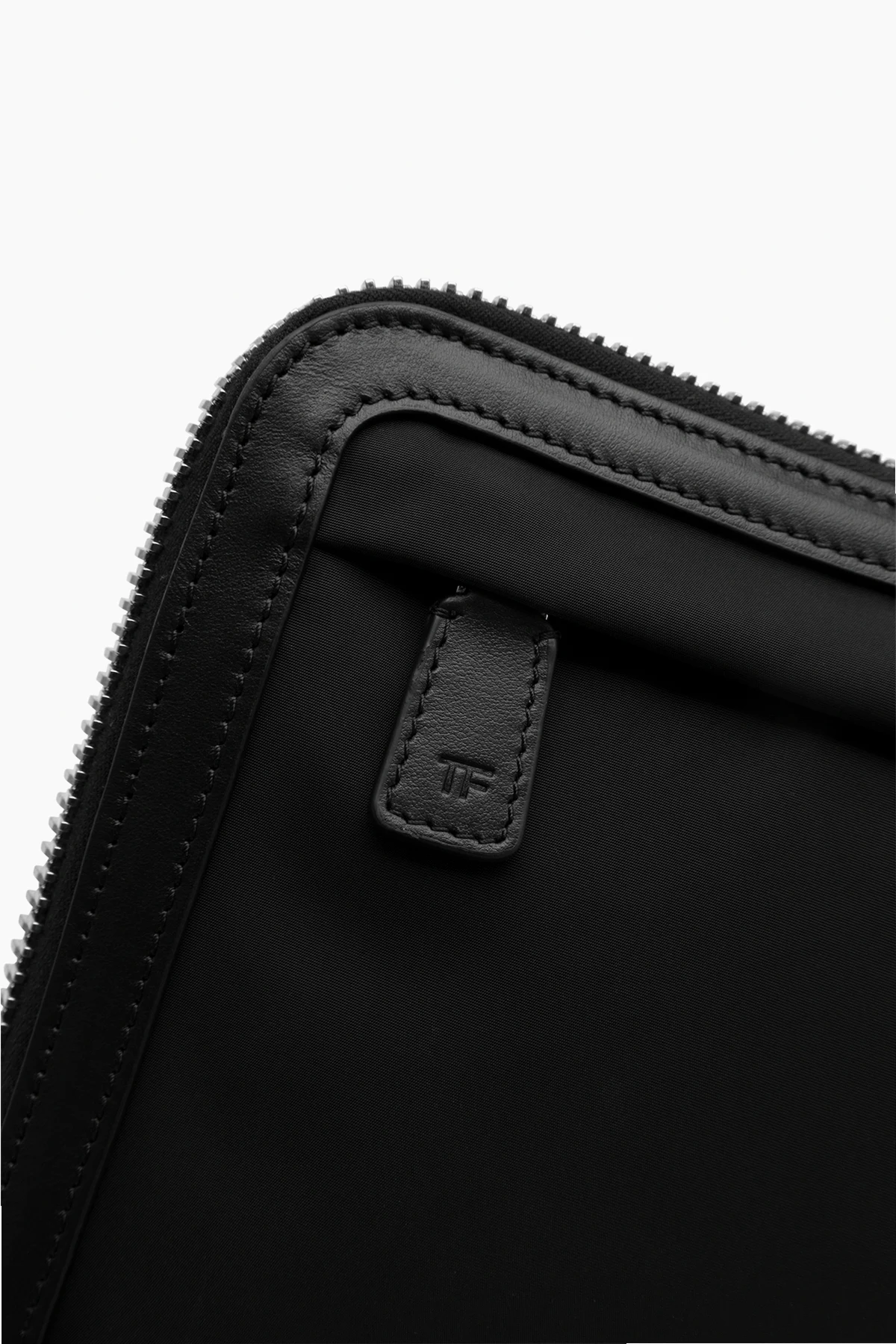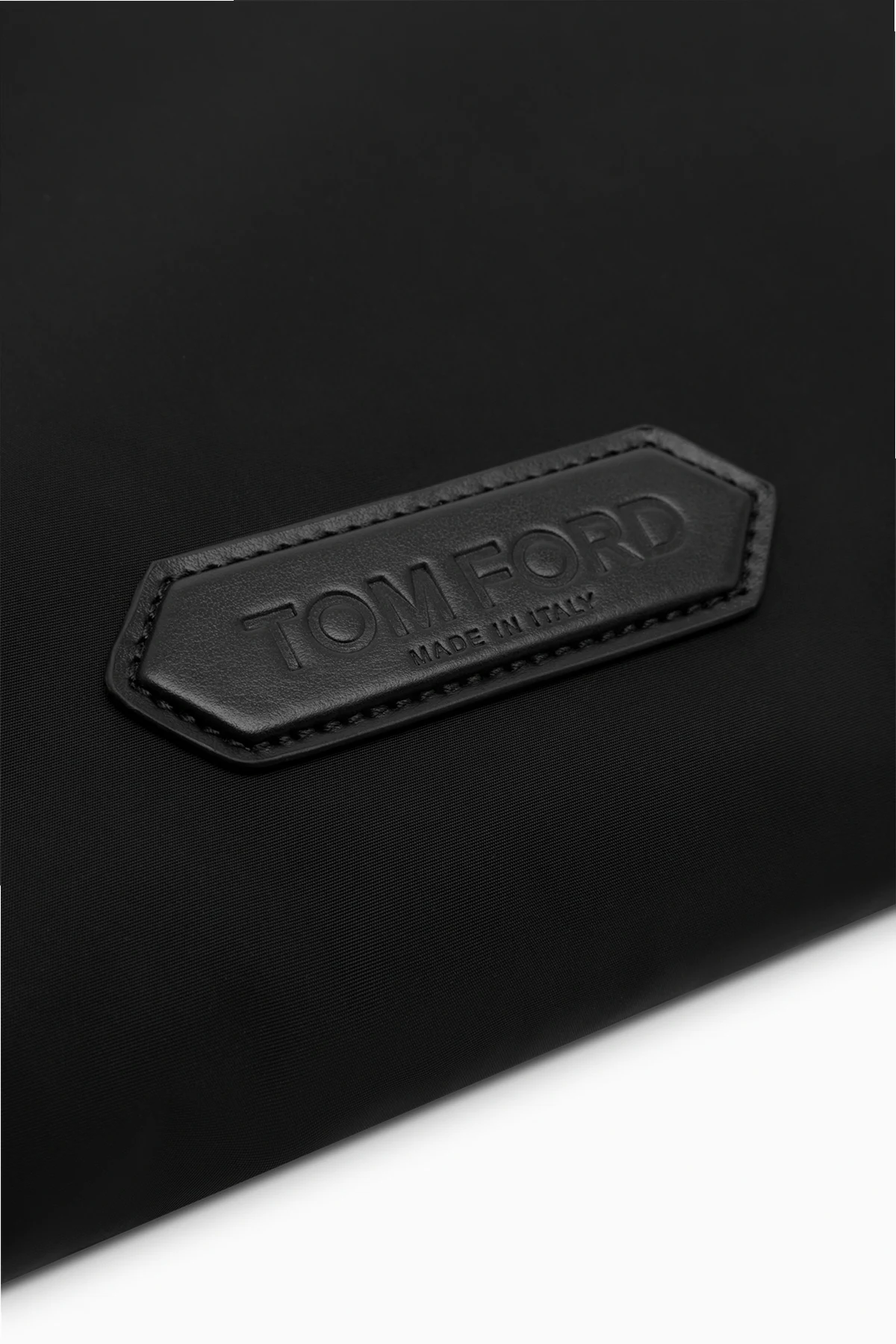 Czarna aktówka Tom Ford. Zamykana na zamek. Ozdobiona aplikacją z logo. Wewnątrz komora, trzy kieszenie: dwie wsuwane i zamykana na zamek, miejsce na długopisy oraz na karty. Metalowe wykończenie w kolorze srebrnym.