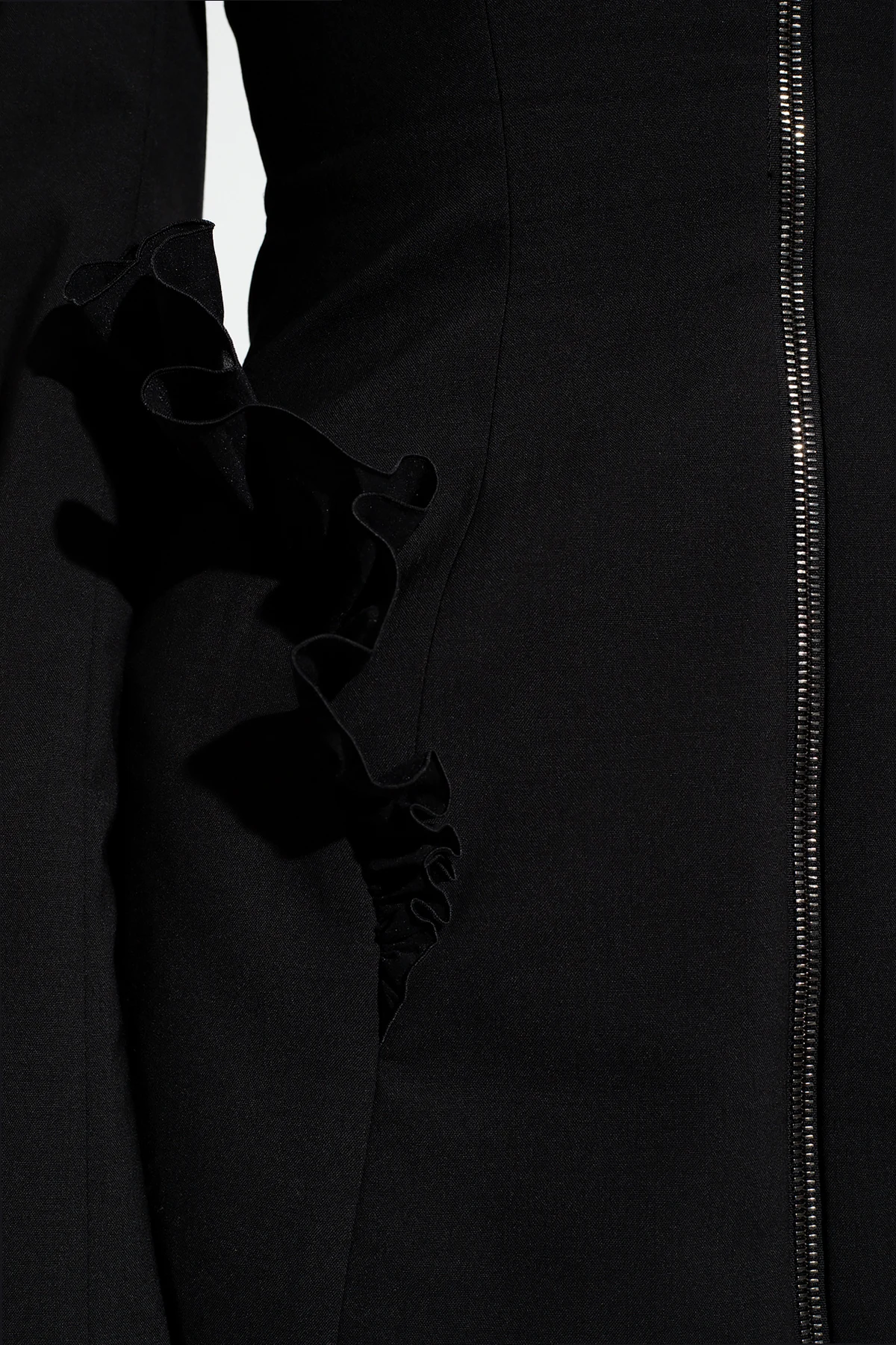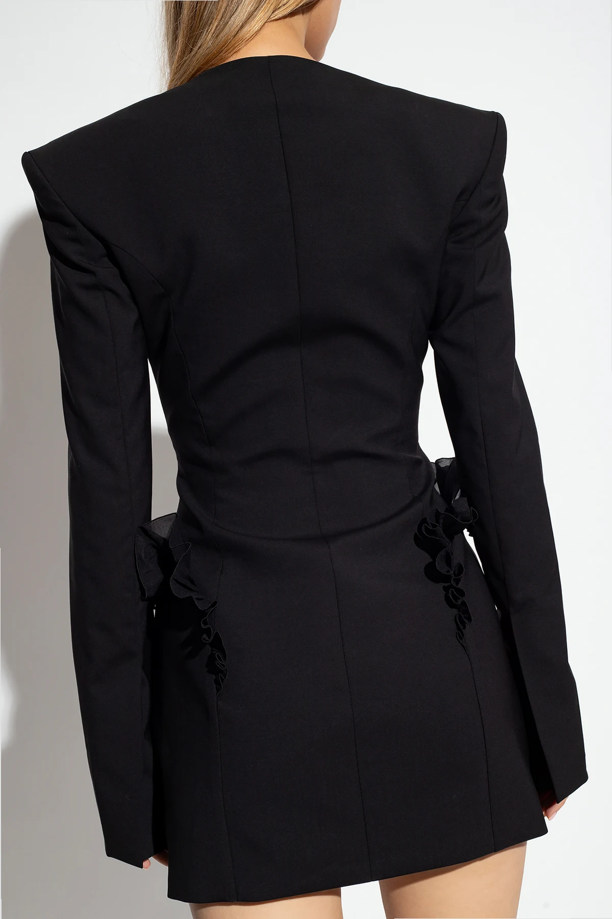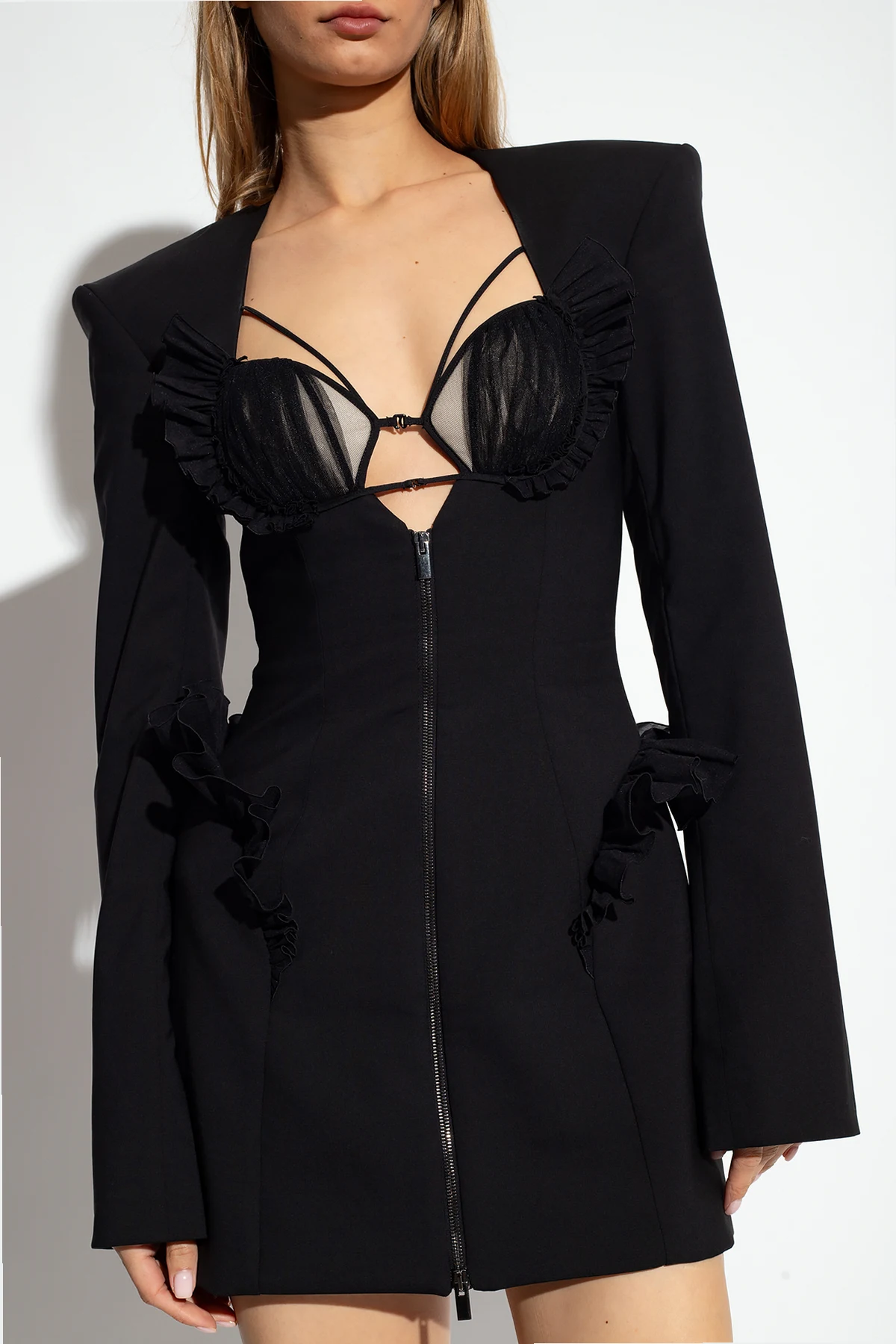 Czarna, krótka sukienka Nensi Dojaka. Wykonana z wełny dziewiczej. Zapinana na dwubiegunowy zamek. Z przodu wstawka z motywem tiulowego biustonosza zapinanego na zaczepy. Na biuście i biodrach dekoracyjne falbany. Dekolt w kształcie serca i długie rękawy. W ramionach wszyte poduszki.