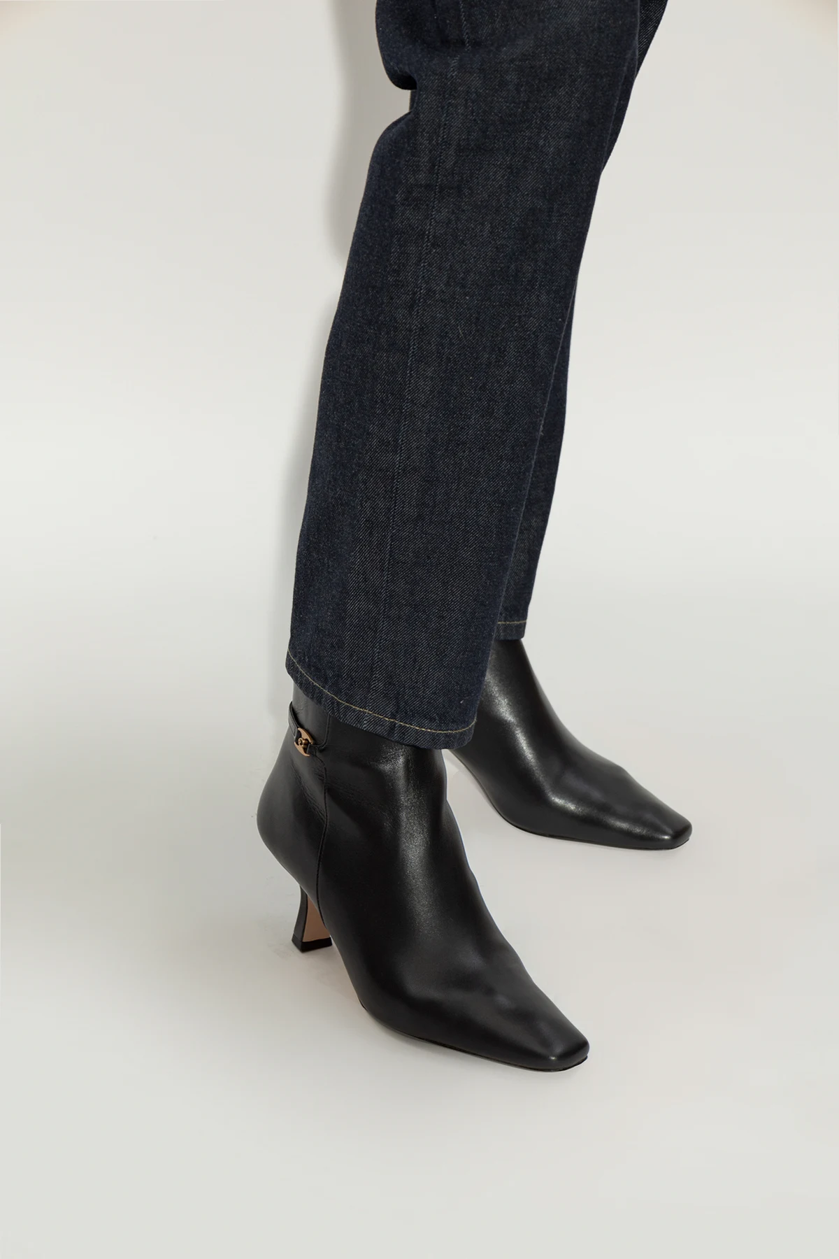 Wykonane z najwyższej jakości skóry, botki te wyróżniają się zaokrąglonym czubkiem oraz smukłą linią . Średni obcas typu "kitten heel" o subtelnie wygiętym kształcie dodaje im wyrafinowania i elegancji. Złoty zamek umieszczony z boku pełni zarówno funkcję praktyczną, jak i estetyczną, natomiast ozdobny pasek ze złotą klamrą podkreśla ich wyrafinowany charakter.