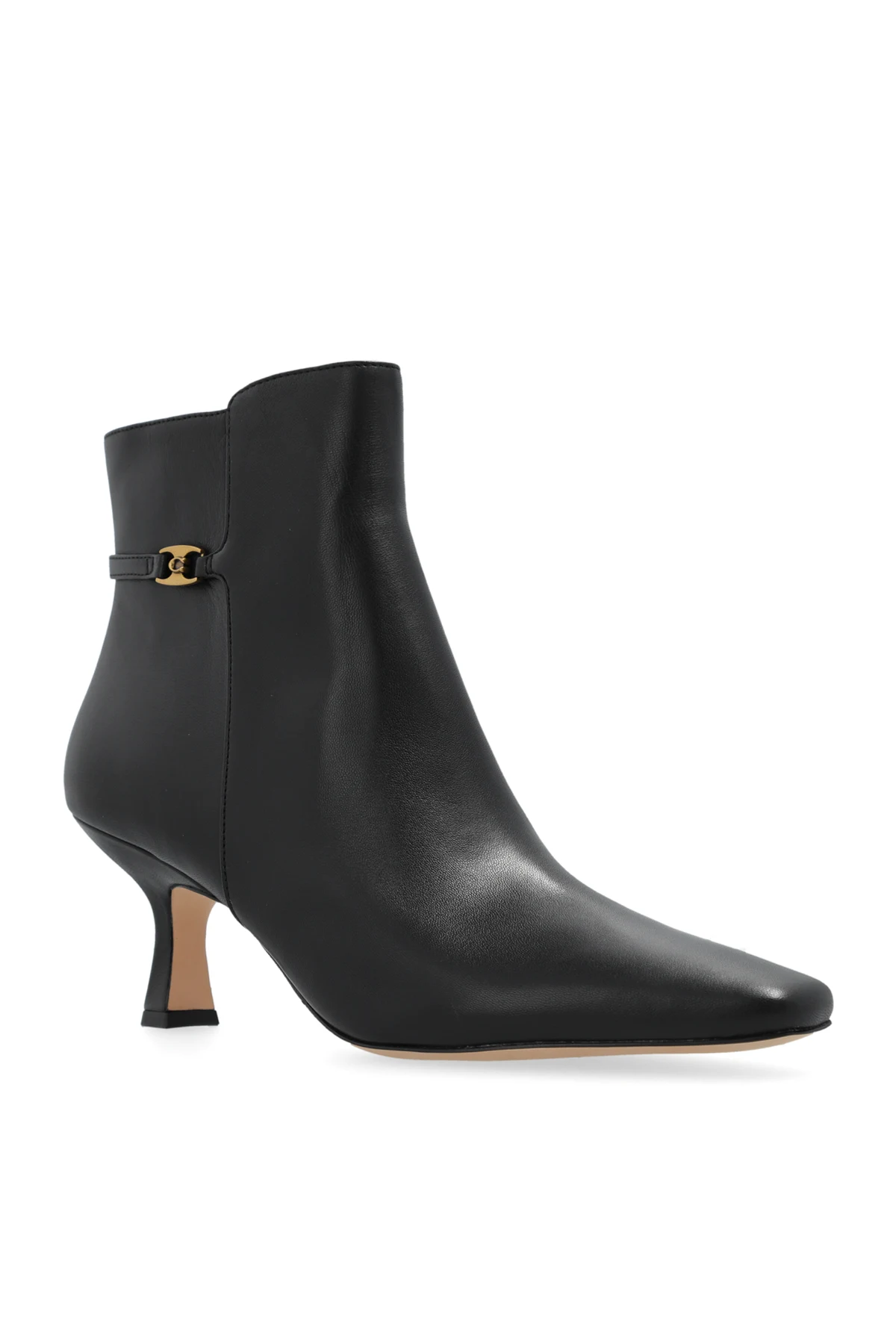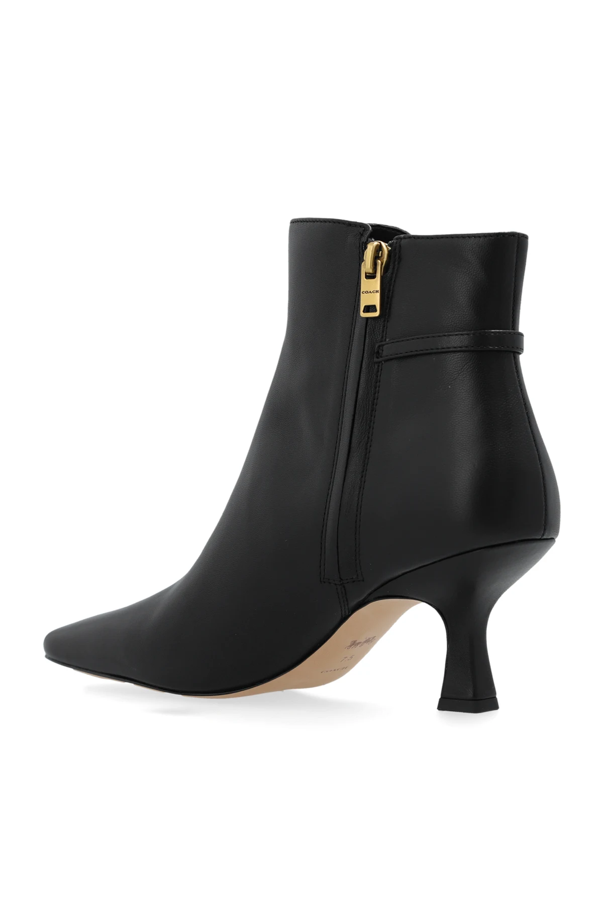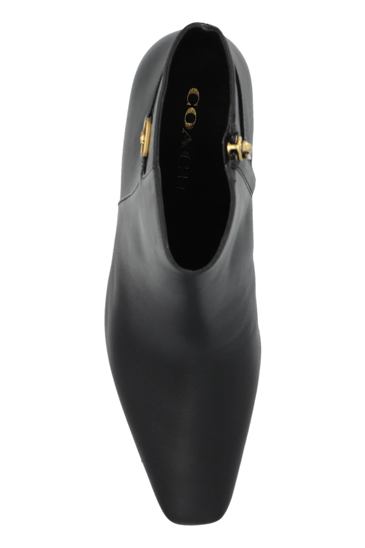 Wnętrze buta zdobi logo projektanta "COACH", co stanowi dodatkowe świadectwo ich ekskluzywności. Dominujący czarny kolor czyni te botki uniwersalnym wyborem, doskonale komponującym się z różnorodnymi stylizacjami, zarówno na co dzień, jak i na bardziej formalne okazje.