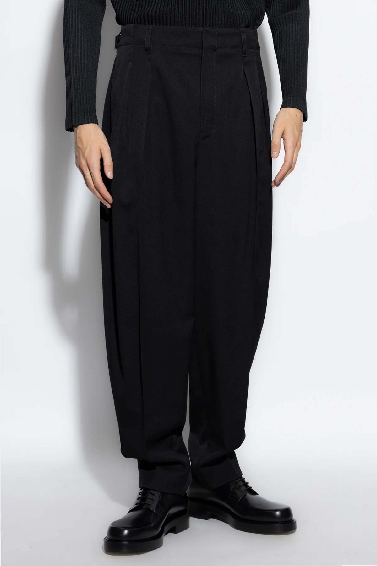 Wykonane z najwyższej jakości wełny , spodnie oferują niezrównaną elegancję i komfort noszenia. Ich luźny krój z lekko zwężanymi nogawkami oraz wysoki stan z zaszewkami tworzą sylwetkę pełną gracji. Szlufki na pasek i kieszenie z zakładkami z tyłu podkreślają klasyczny charakter, a zapinanie na zamek oraz haftkę dopełnia całości.