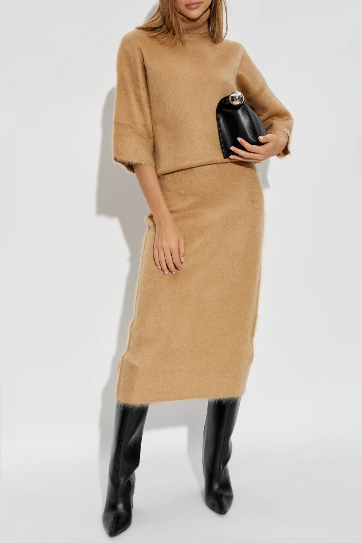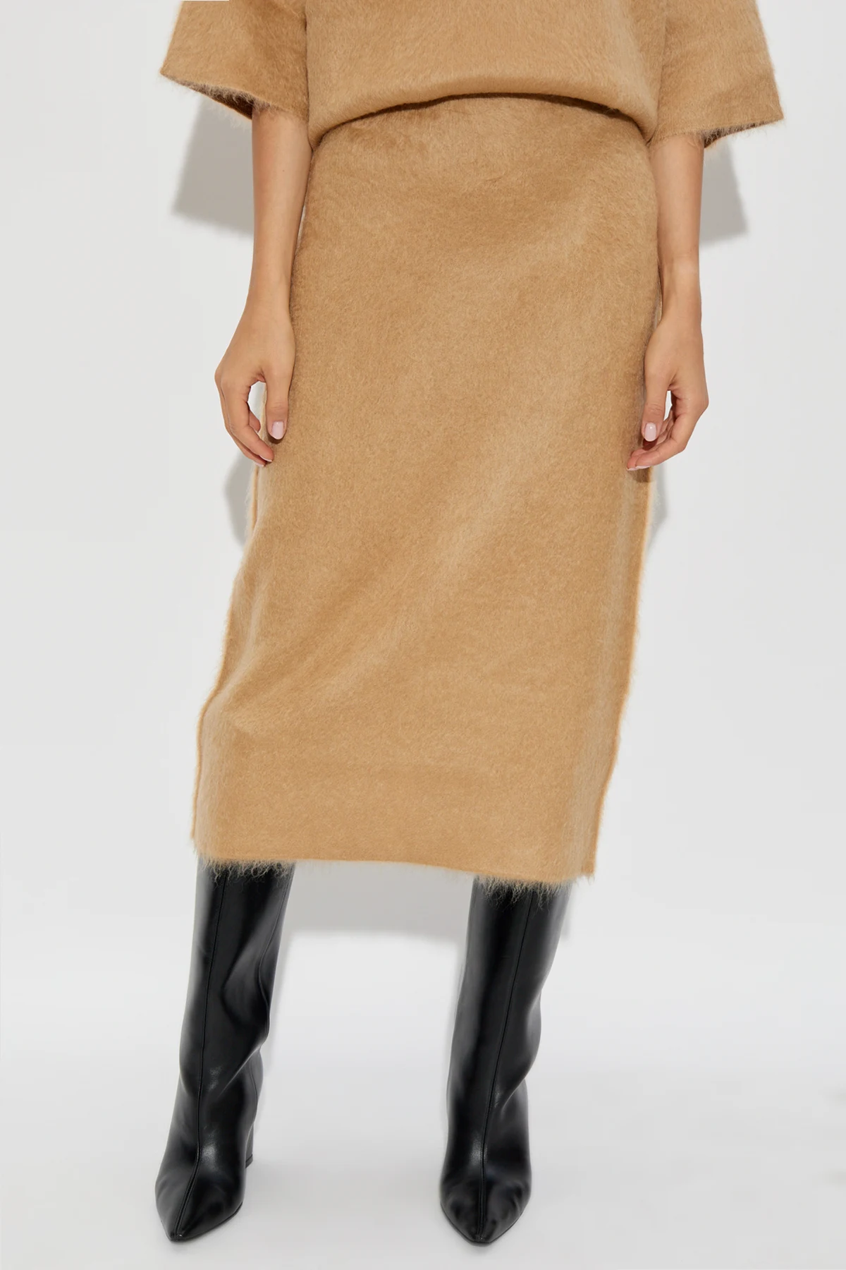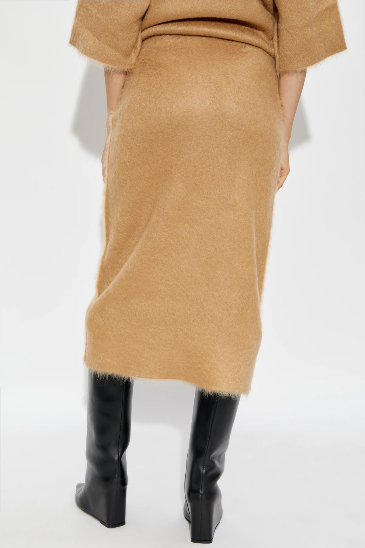 Wykonana z luksusowej mieszanki wełny, moheru, poliamidu i elastanu, spódnica zapewnia ciepło i miękkość, co czyni ją idealnym wyborem na chłodniejsze dni. Jej jednolity kolor i elegancka struktura materiału przyciągają wzrok, a długość sięgająca za kolana dodaje klasy i wyrafinowania.