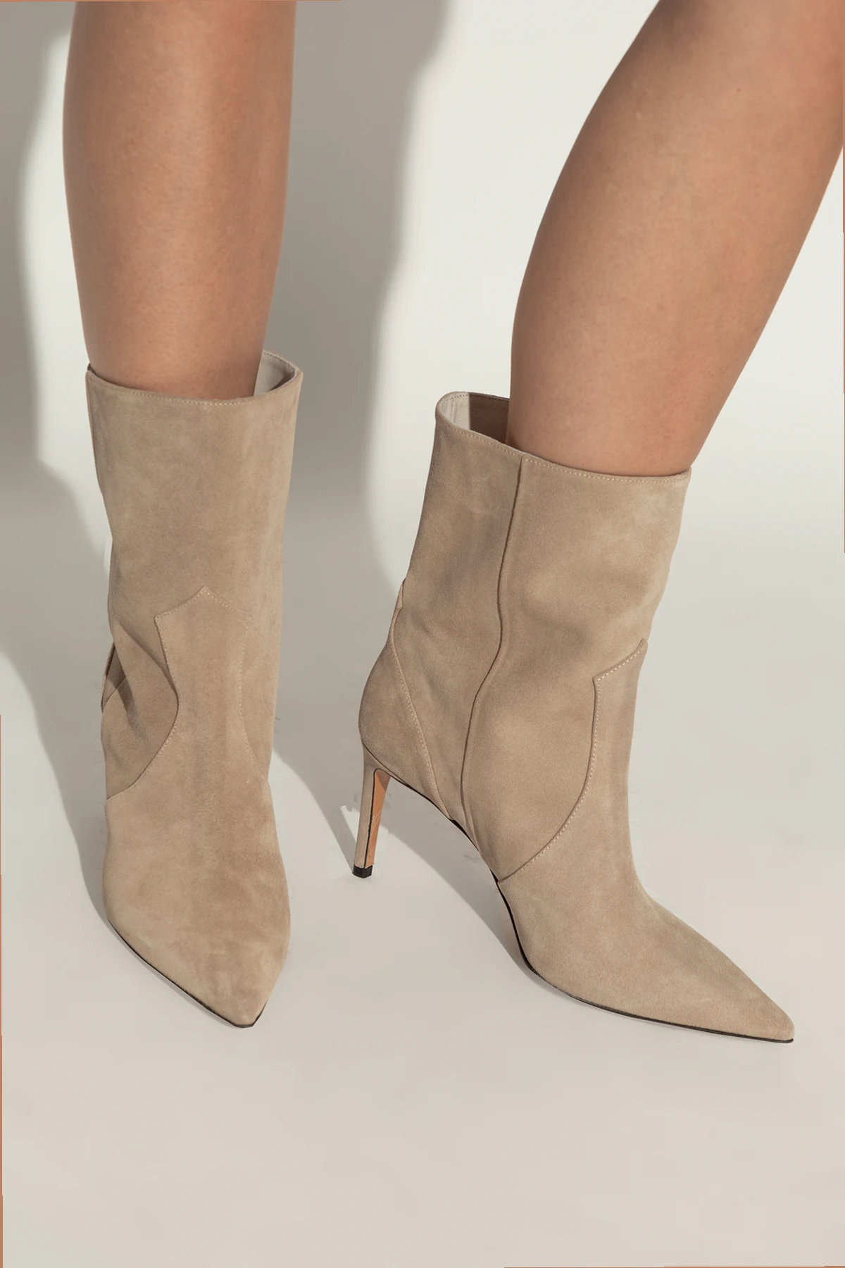Kształt i detale: Klasyczny, wąski nosek oraz cholewka sięgająca do połowy łydki nadają butom stylowy wygląd. Jednokolorowe, bez dodatkowych wzorów, botki posiadają subtelne przeszycia na bocznych częściach cholewki. Cienki, wysoki obcas typu szpilka, również pokryty zamszem, harmonijnie komponuje się z resztą buta, dodając elegancji i kobiecego charakteru.