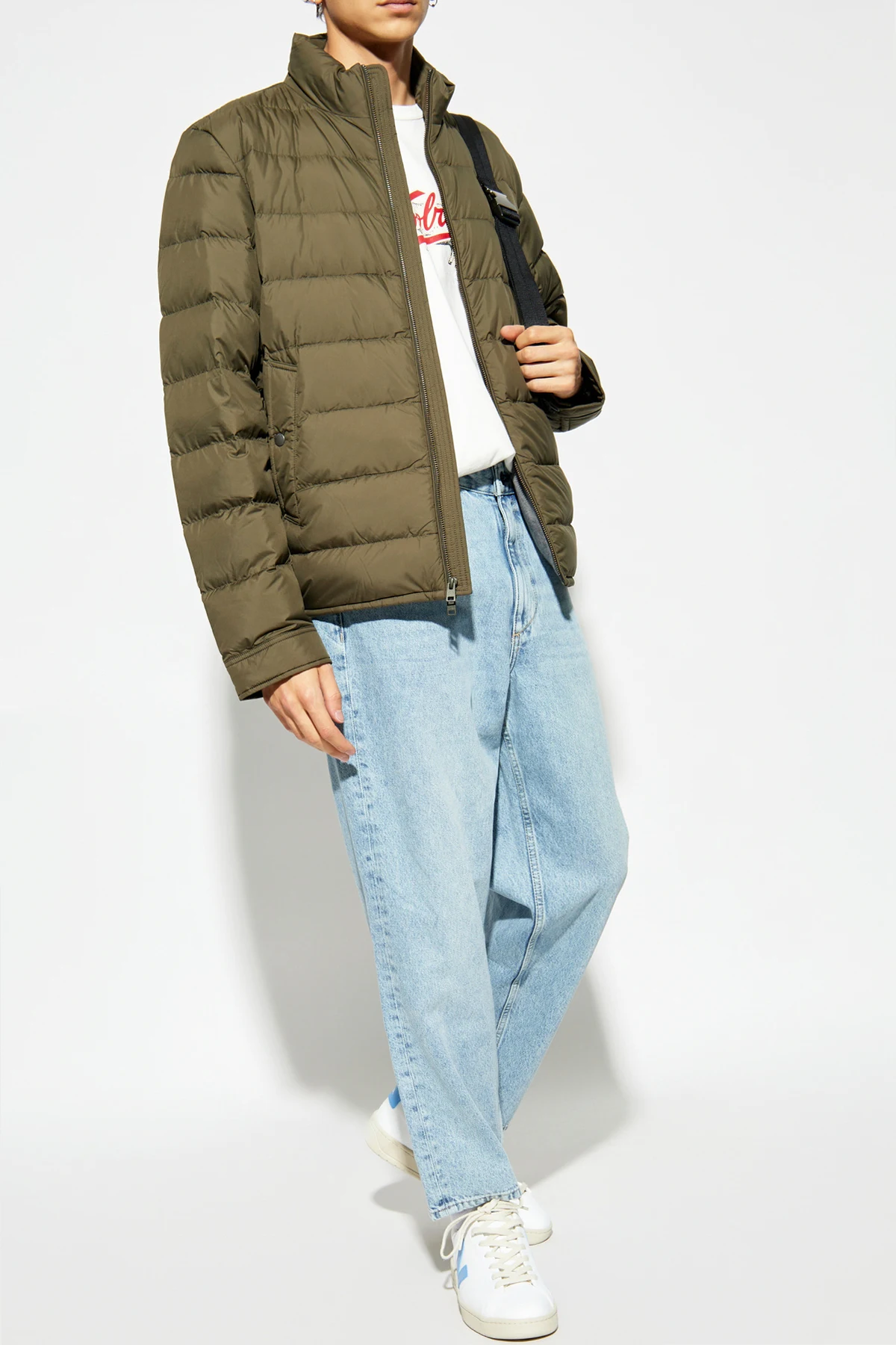 Subtelne logo marki umieszczone na tylnej części stójki dodaje kurtce luksusowego charakteru, czyniąc ją idealnym wyborem na chłodniejsze dni. Prezentowana w zestawieniu z jasnoniebieskimi dżinsami oraz białą koszulką, stanowi niezastąpiony element męskiej garderoby o casualowym charakterze.