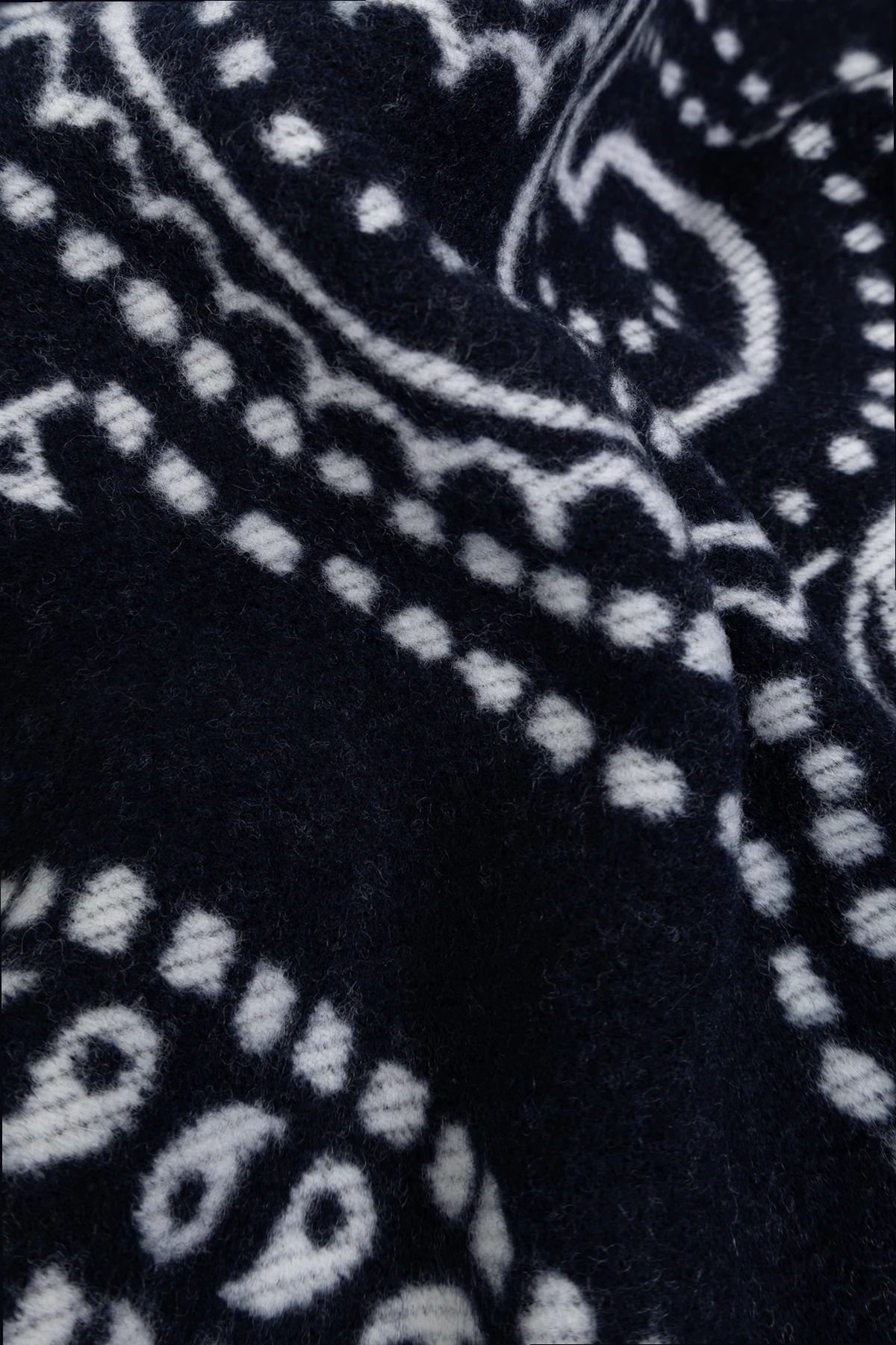 Dominujący kolor granatowy w połączeniu z białym wzorem paisley tworzy harmonijną i wyrafinowaną kompozycję. Misternie wyszywane zakrzywione kształty i drobne detale wzoru sprawiają, że koc zachwyca elegancją i przyciąga wzrok.