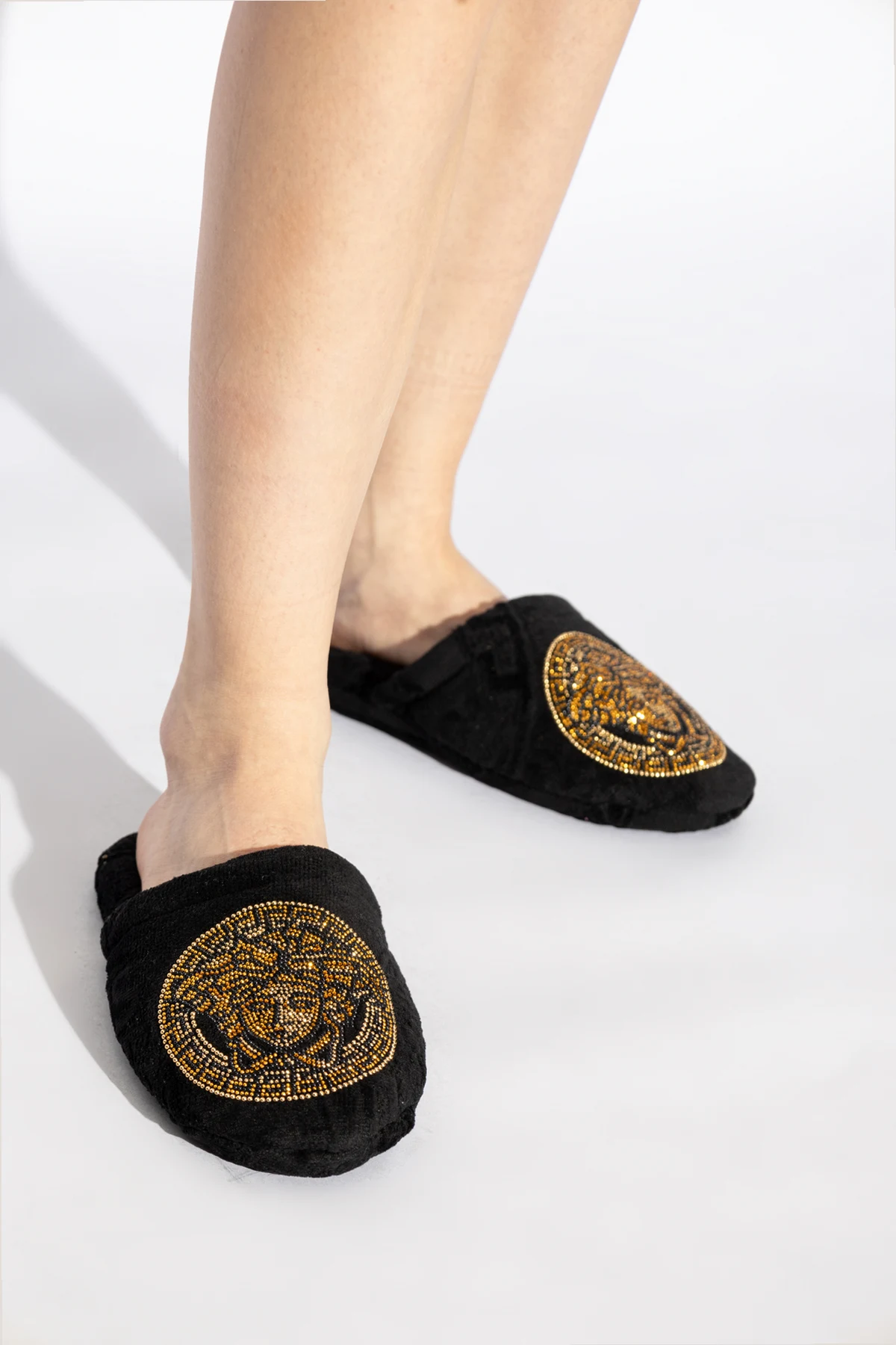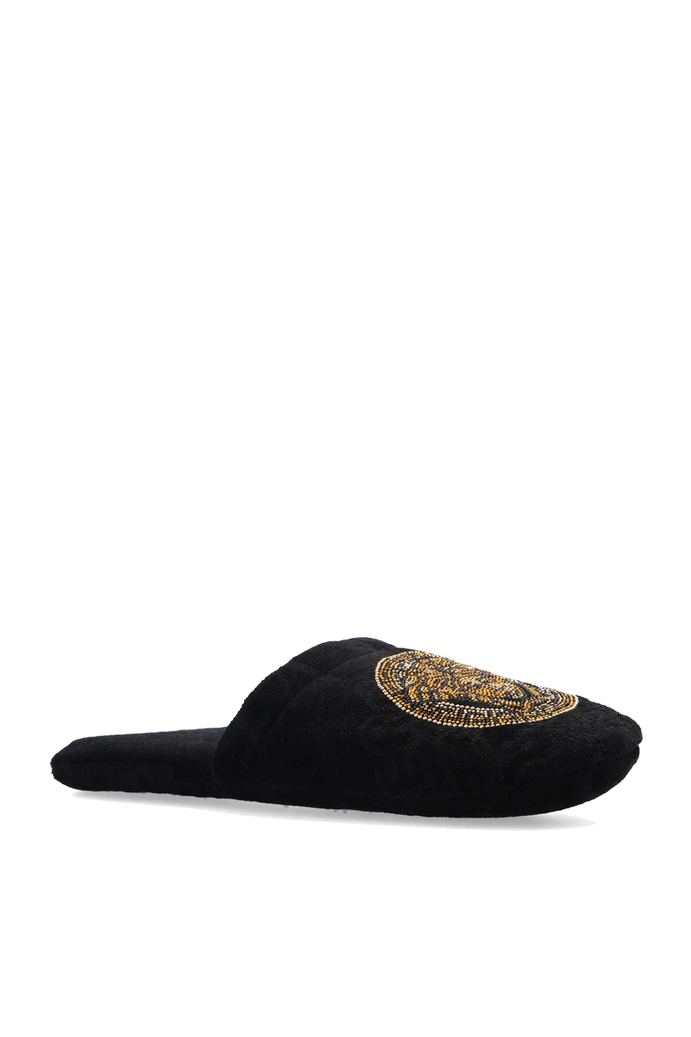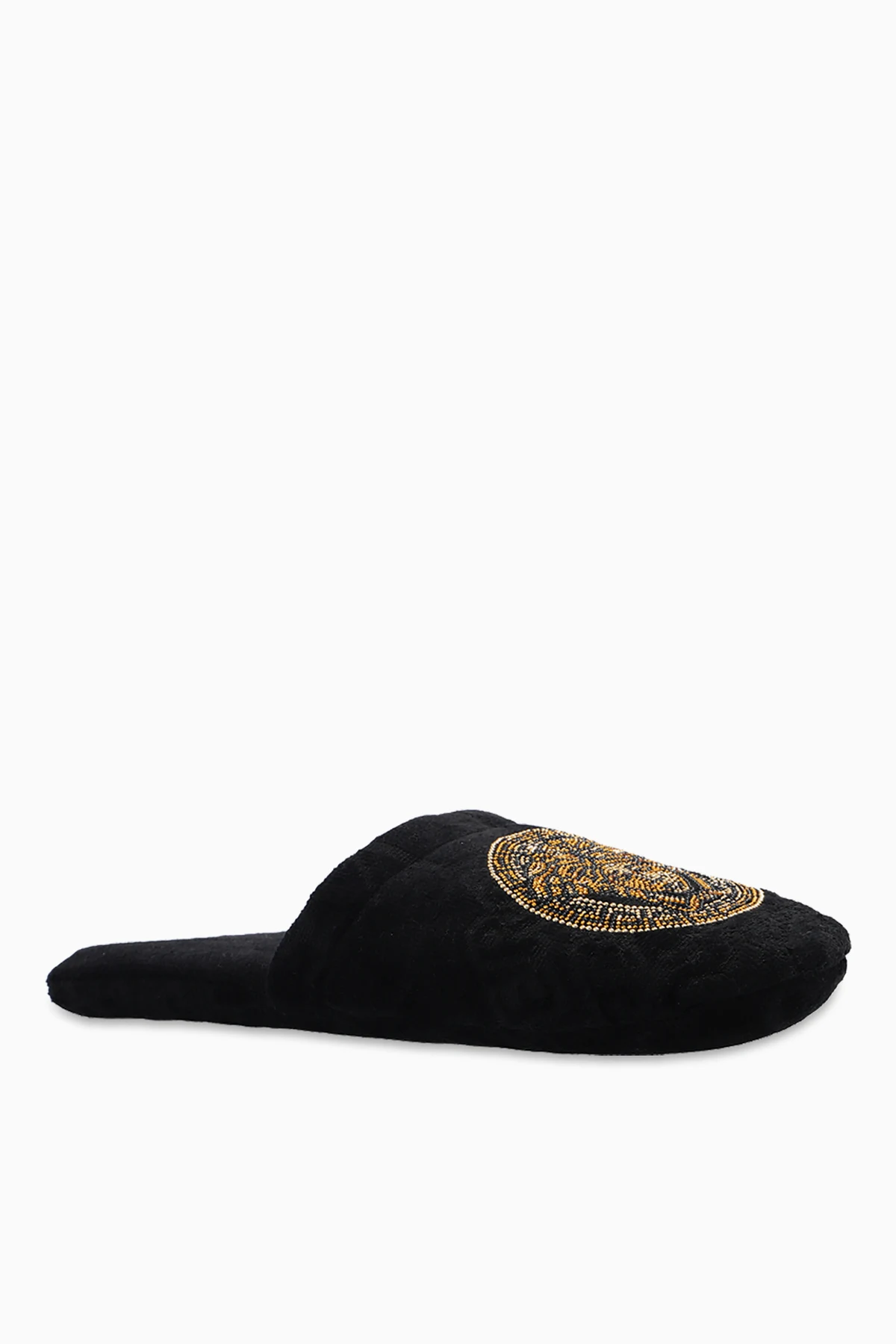 Czarne klapki Versace Home. Wykonane z wzorzystej bawełny z logo. Z przodu dekoracyjna aplikacja wysadzana połyskującymi kamieniami z charakterystyczną dla marki głowa Meduzy. Czarna, bawełniana podeszwa.