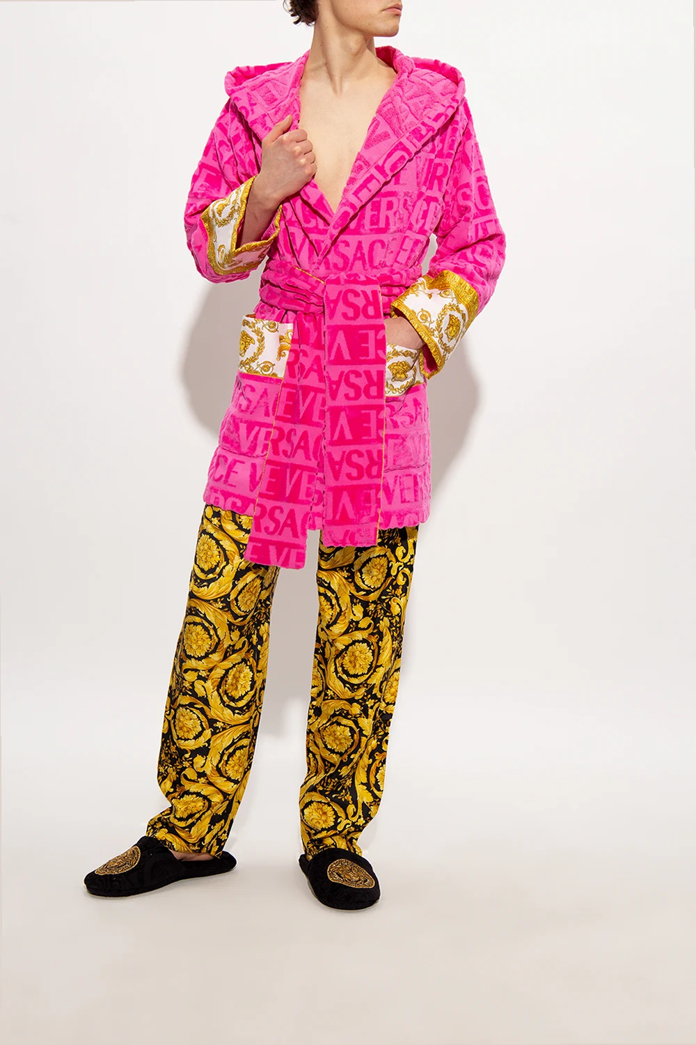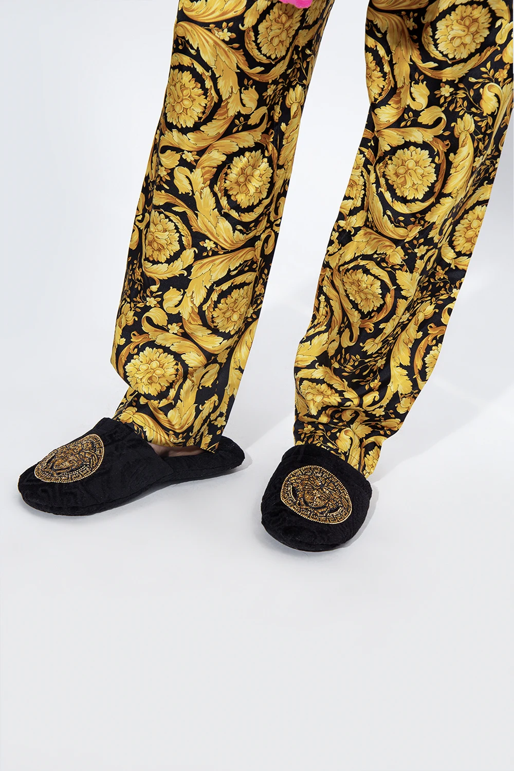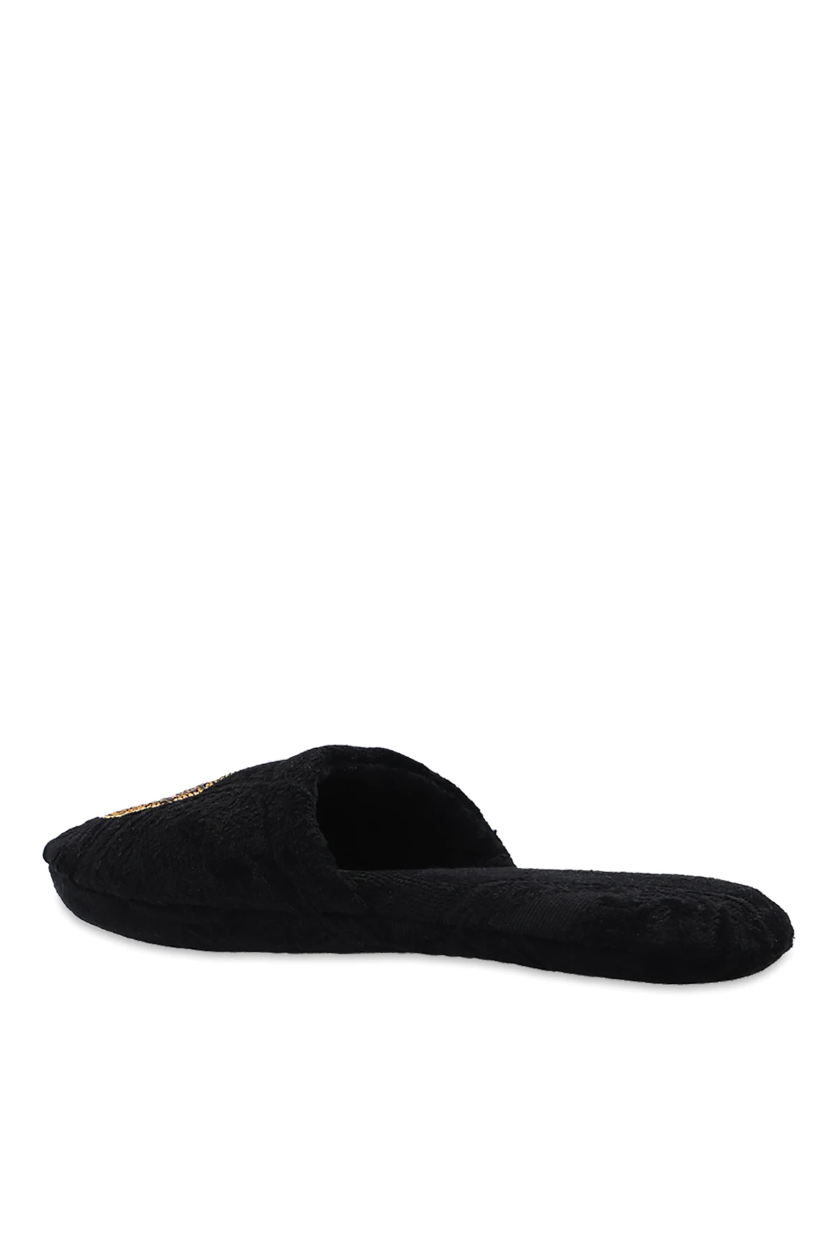 Czarne klapki Versace Home. Wykonane z wzorzystej bawełny z logo. Z przodu dekoracyjna aplikacja wysadzana połyskującymi kamieniami z charakterystyczną dla marki głowa Meduzy. Czarna, bawełniana podeszwa.
