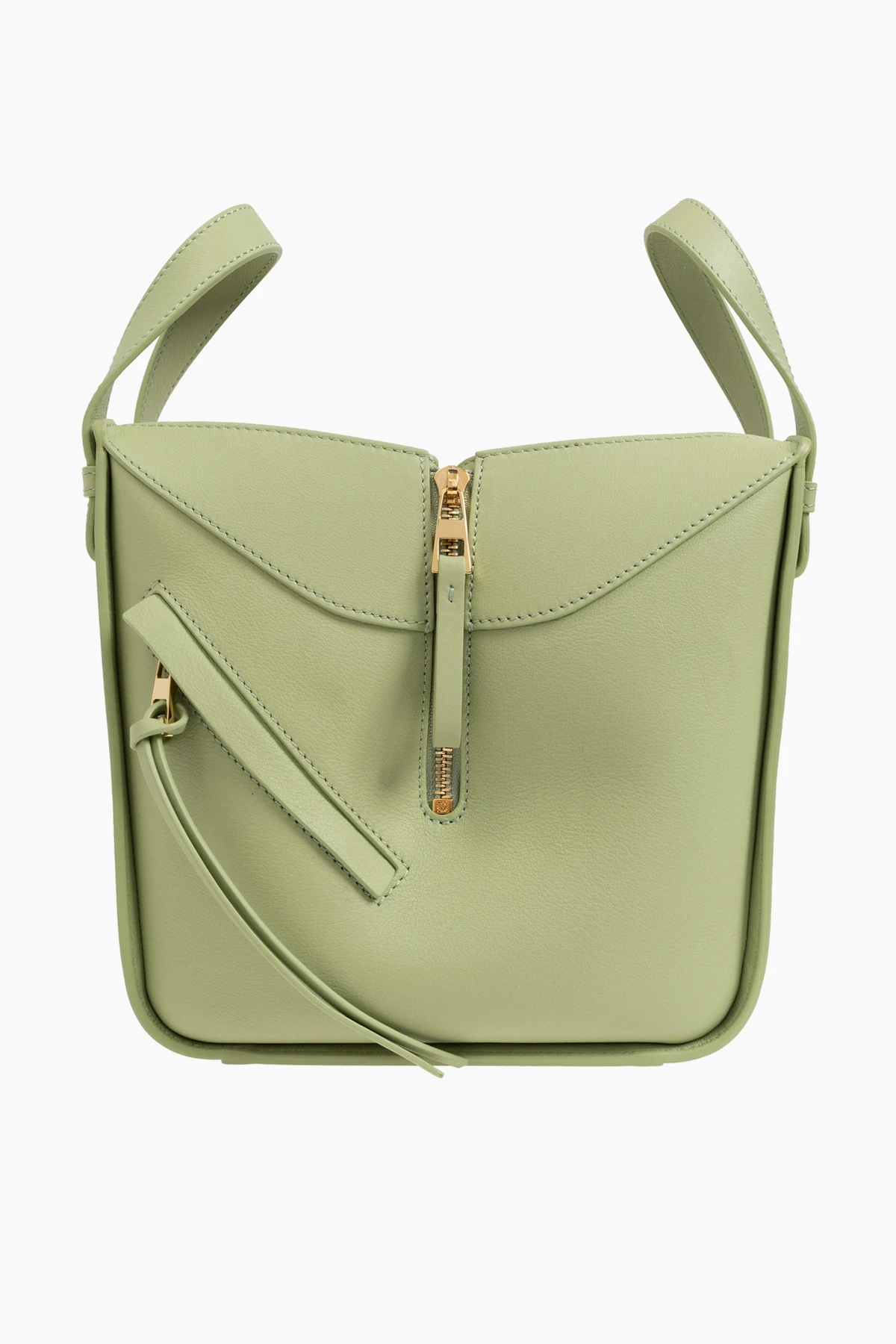 Wykonana z najwyższej jakości skóry cielęcej w subtelnym kolorze jasnozielonym, torba na ramię wyróżnia się świeżością i wyrafinowaniem. Złote metalowe elementy, takie jak zamek błyskawiczny i klamry, dodają luksusowego akcentu, a wytłoczone logo marki na przodzie podkreśla jej ekskluzywny charakter.