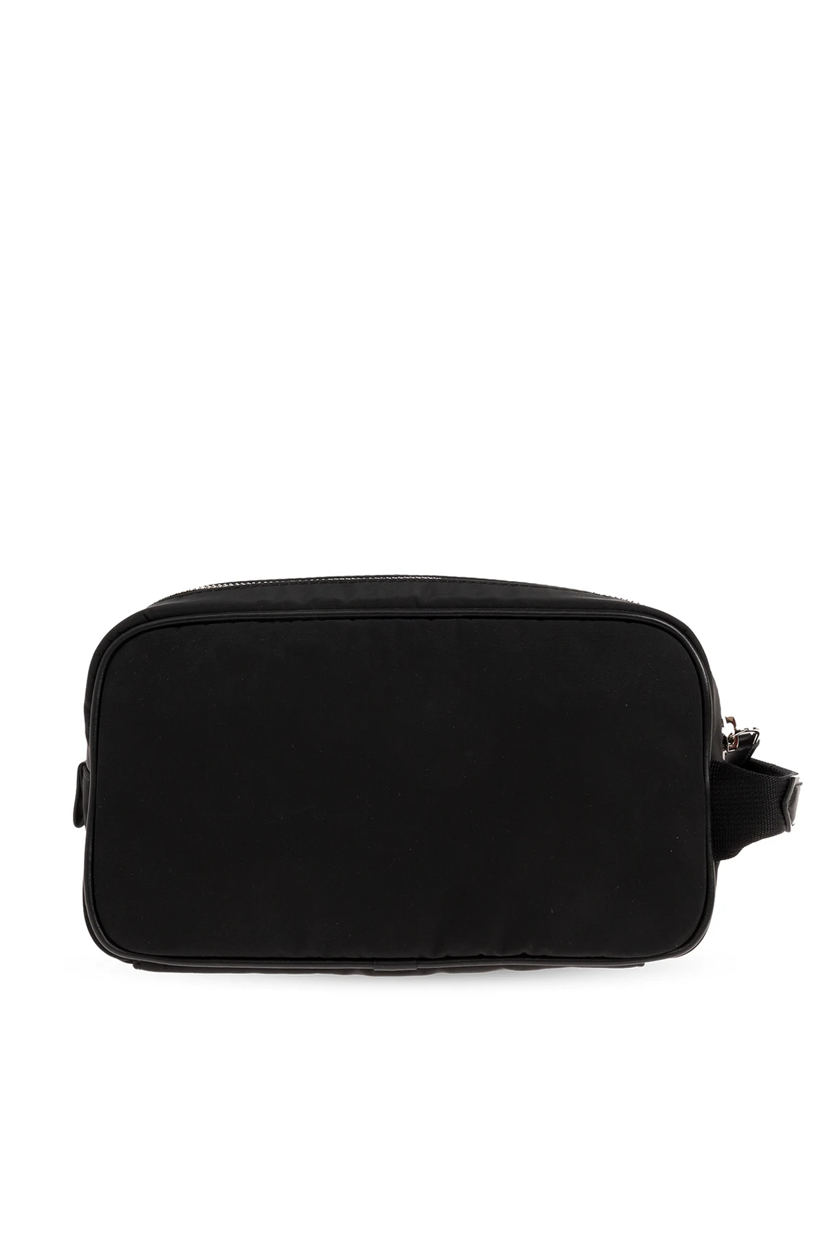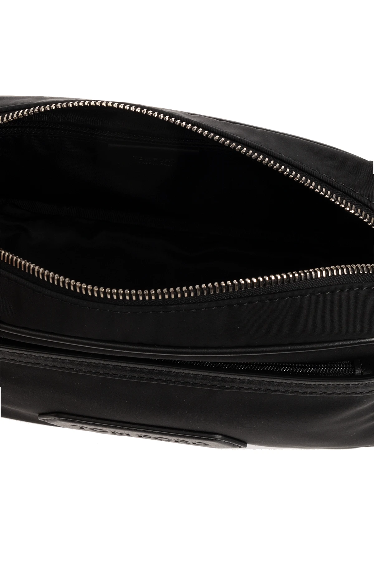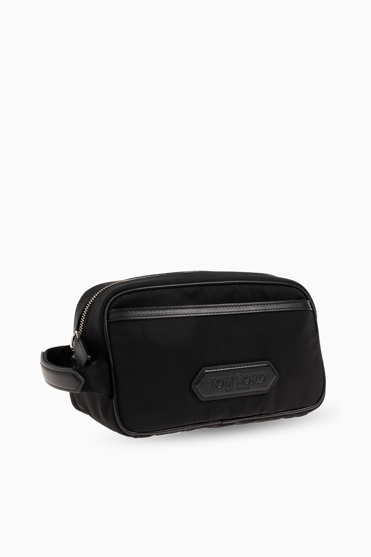 Czarna kosmetyczka Tom Ford. Wykonana z materiału technicznego i wykończona skórą cielęcą. Zamykana na zamek. Z przodu naszywka z wytłoczonym logo i kieszeń z zamknięciem na zamek. Z boku krótki uchwyt. Wewnątrz komora z kieszenią zamykaną na zamek.