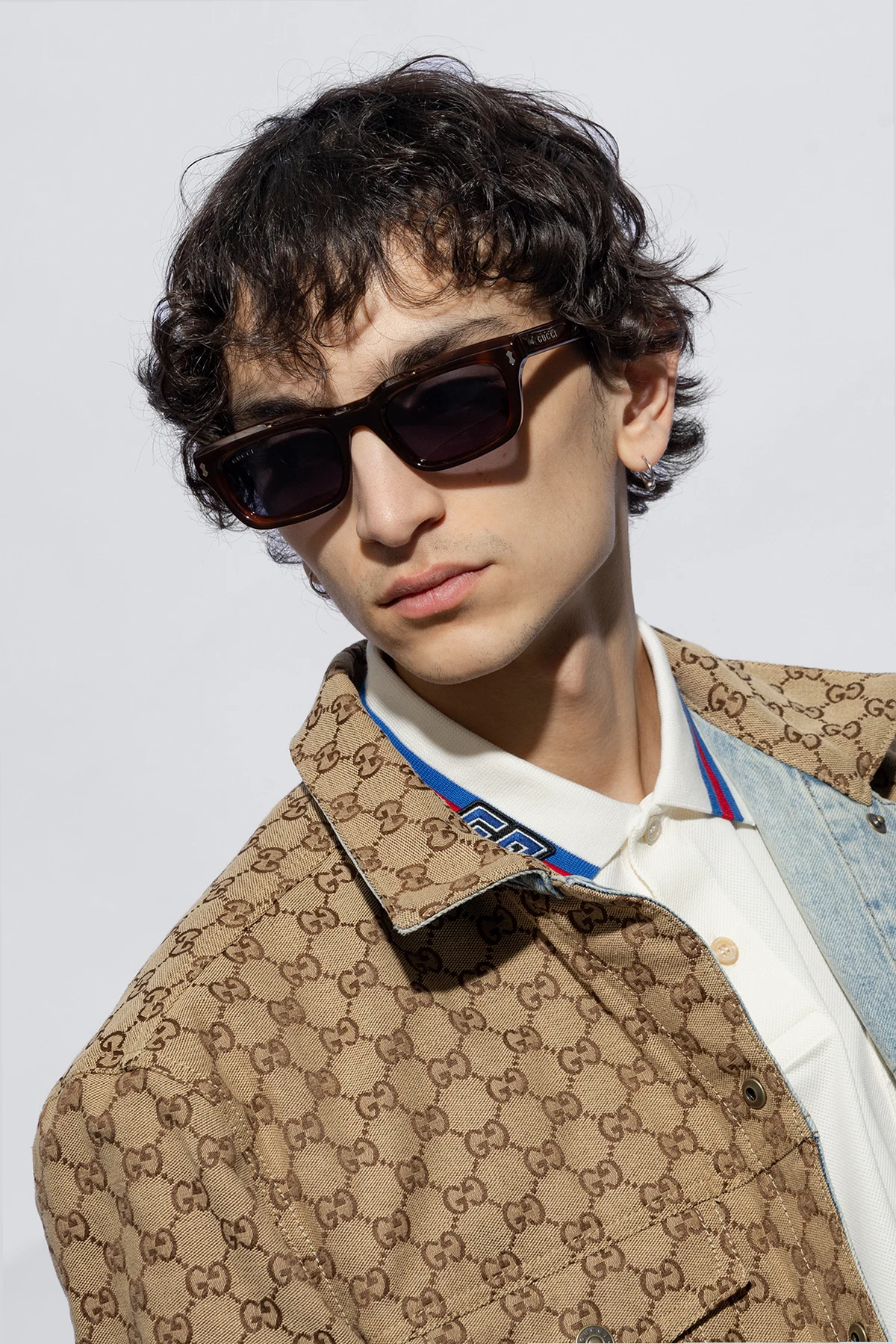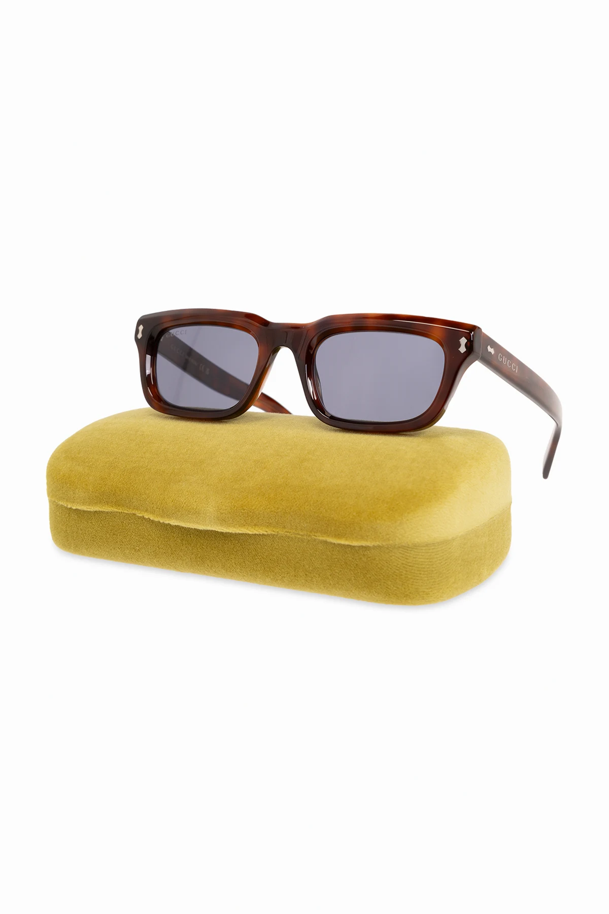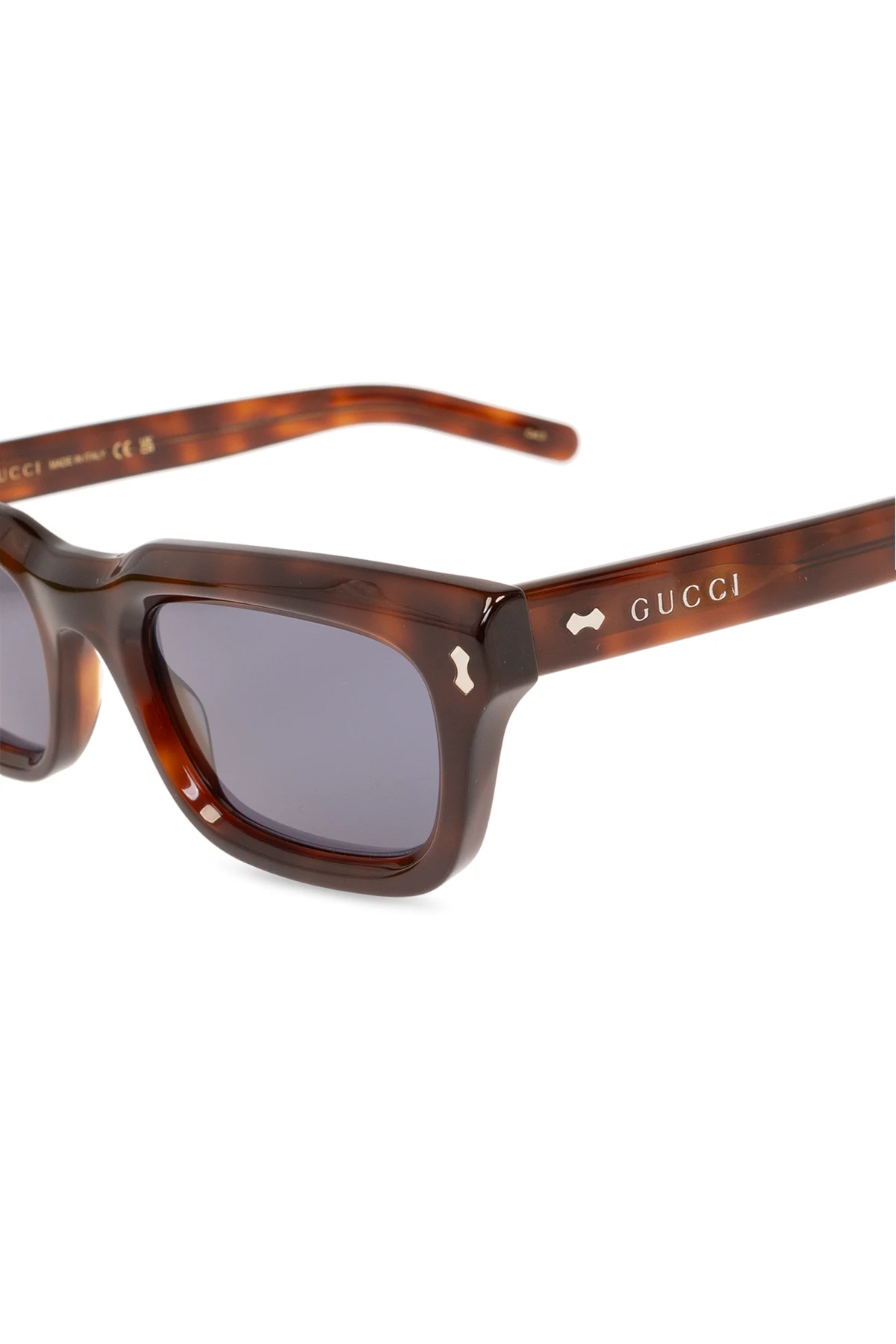 Brązowe okulary przeciwsłoneczne Gucci. Prostokątne oprawki. Ozdobione szylkretowym wzorem. Zauszniki z logo w kolorze złotym. Niebieskie soczewki ze 100% ochroną przed promieniowaniem UVA/UVB. Dołączone etui w losowo wybranym kolorze.