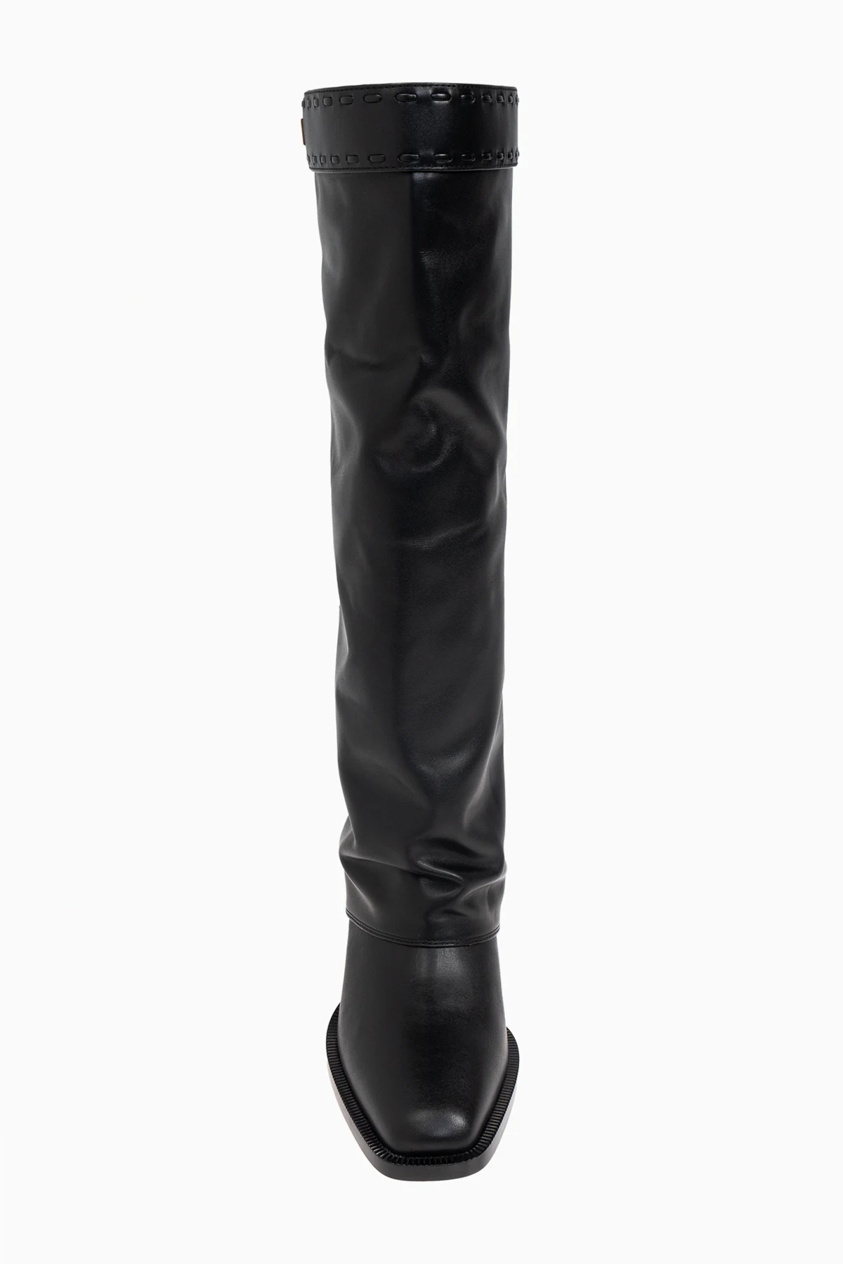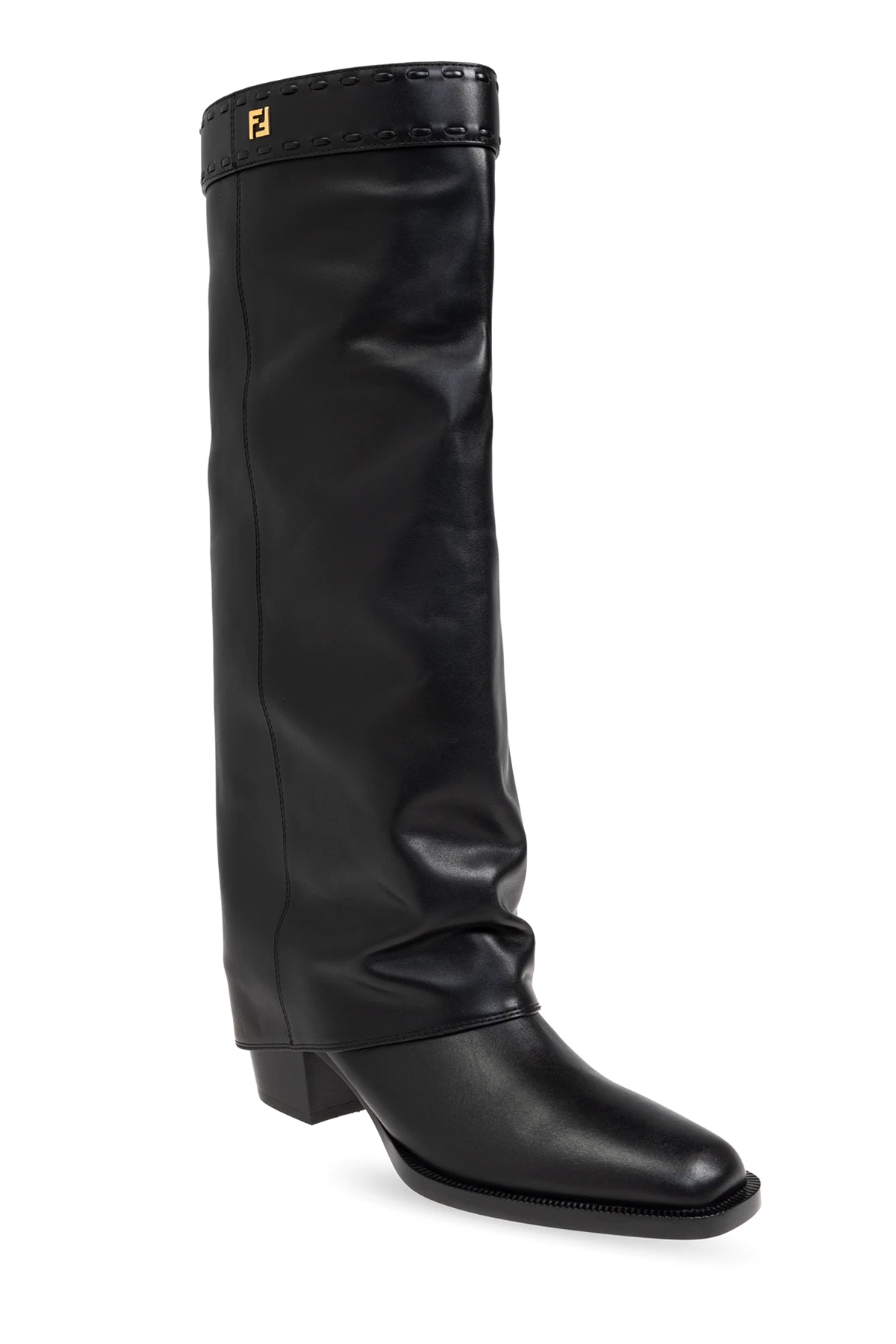 Wykonane z najwyższej jakości gładkiej, czarnej skóry cielęcej, kozaki Fendi zachwycają swoim minimalistycznym designem. Ich wysoki fason, sięgający kolan, został wzbogacony o lekko zaokrąglony, ale kanciasty nosek oraz stabilny, średni obcas, co zapewnia komfort i styl każdej stylizacji.