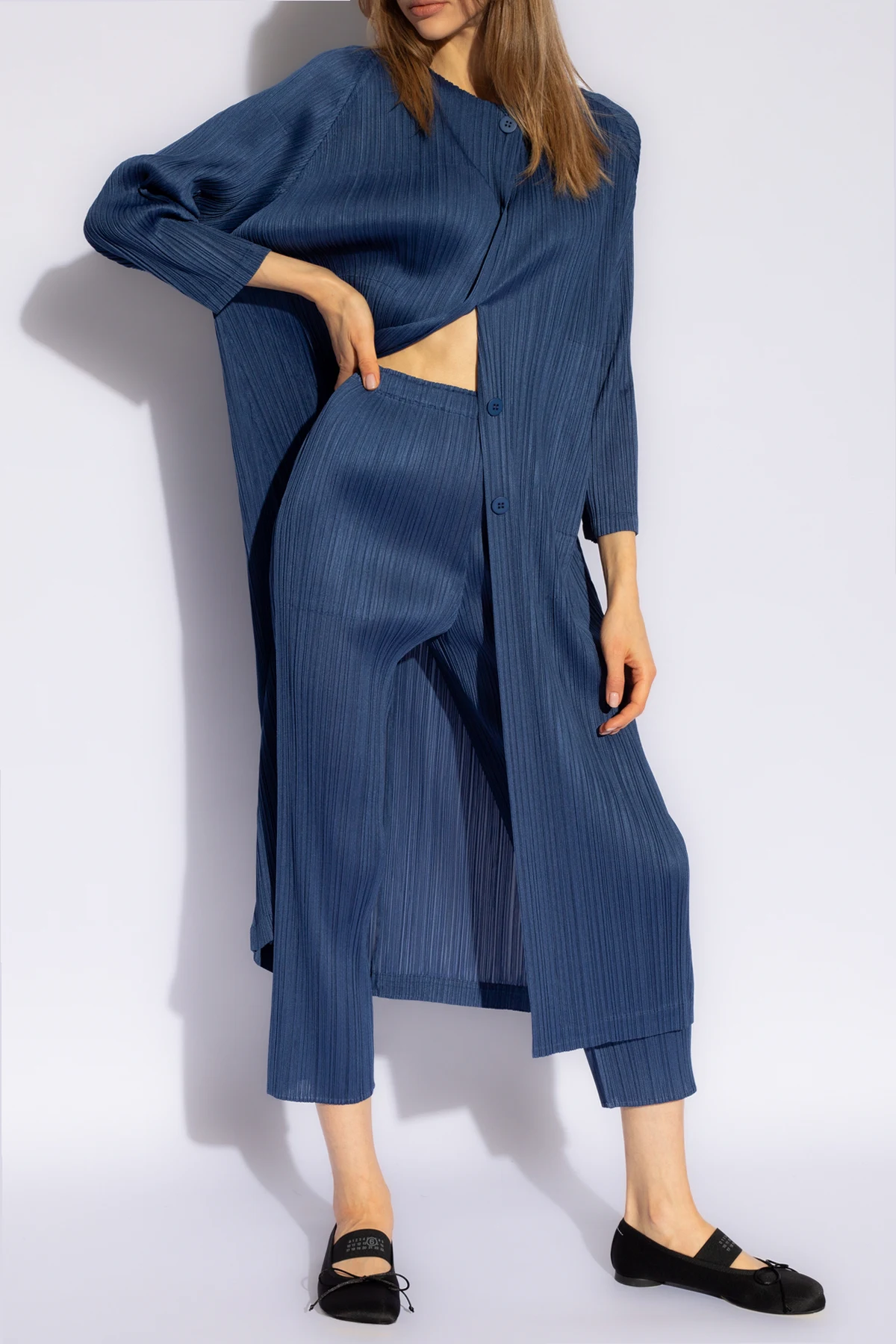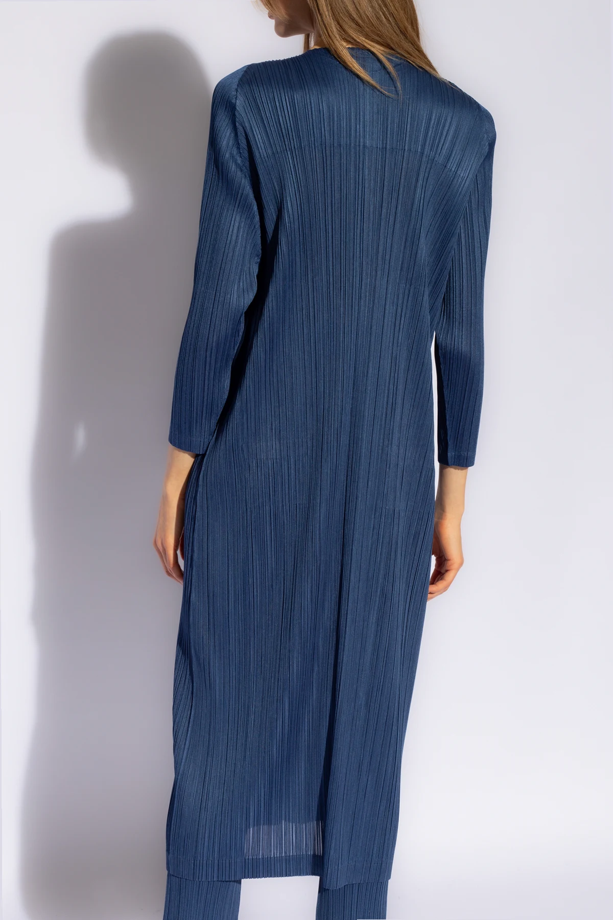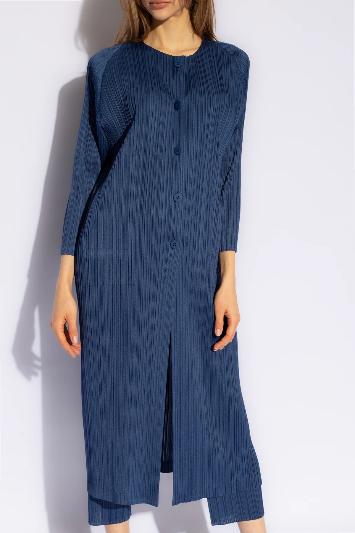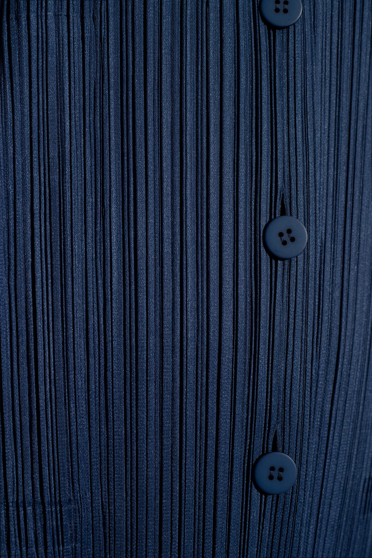 Granatowy, plisowany płaszcz Issey Miyake Pleats Please. Zapinany na guziki. Dwie wsuwane kieszenie. Długie rękawy.