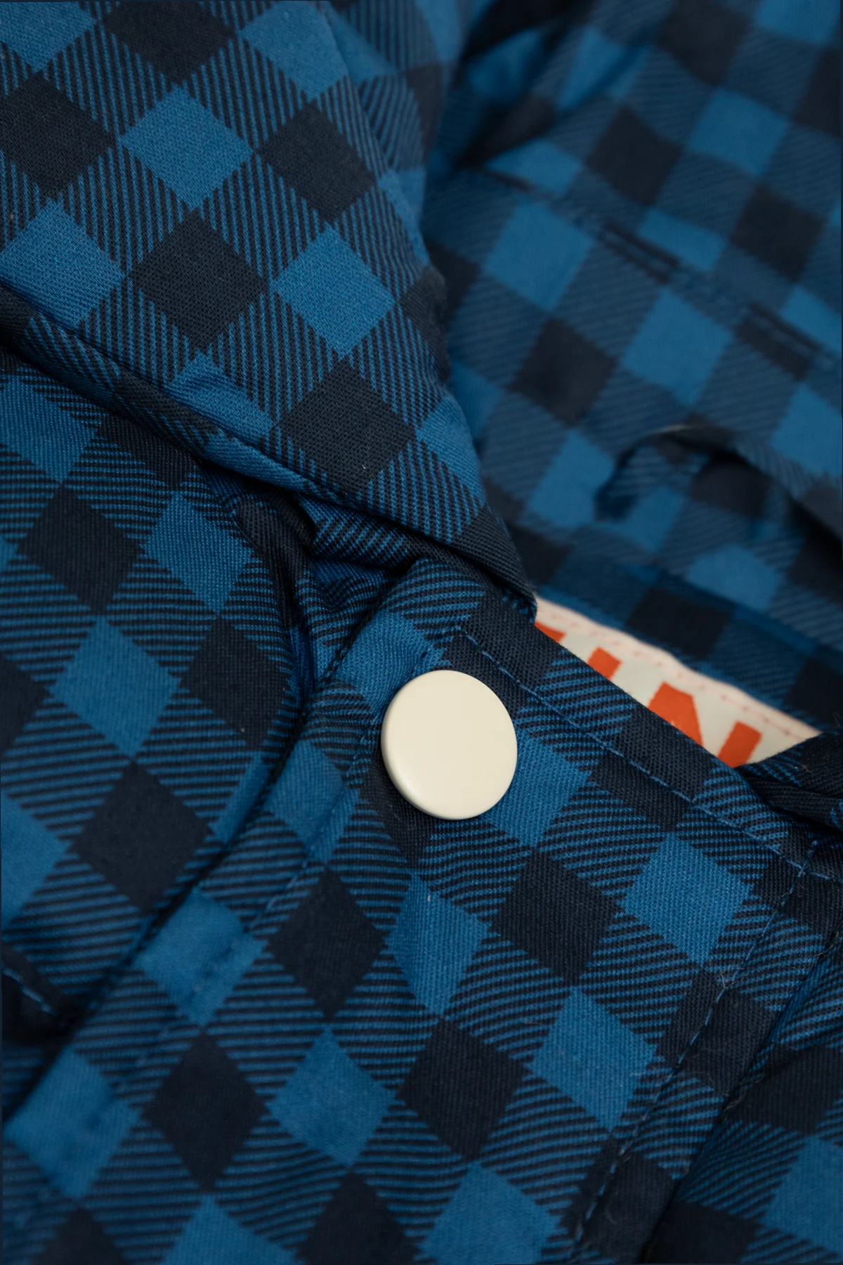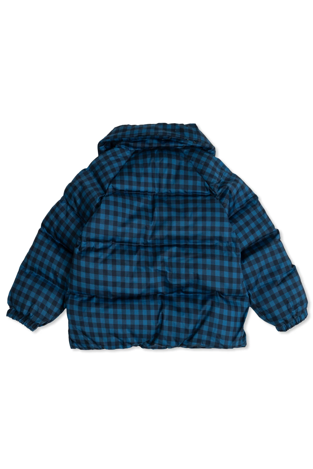 Kurtka puchowa dla chłopców w wieku 4-14 lat, utrzymana w dominującym granatowym kolorze z charakterystycznym wzorem w kratę. Klasyczny, puchowy kształt z wyraźnym pikowaniem nadaje jej dodatkową objętość i izolację cieplną, co czyni ją idealnym wyborem na chłodniejsze dni.