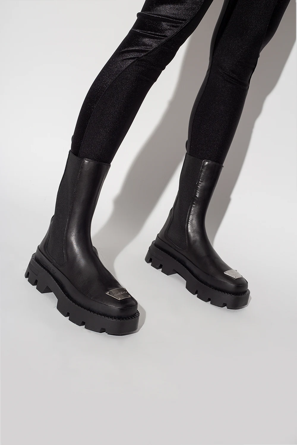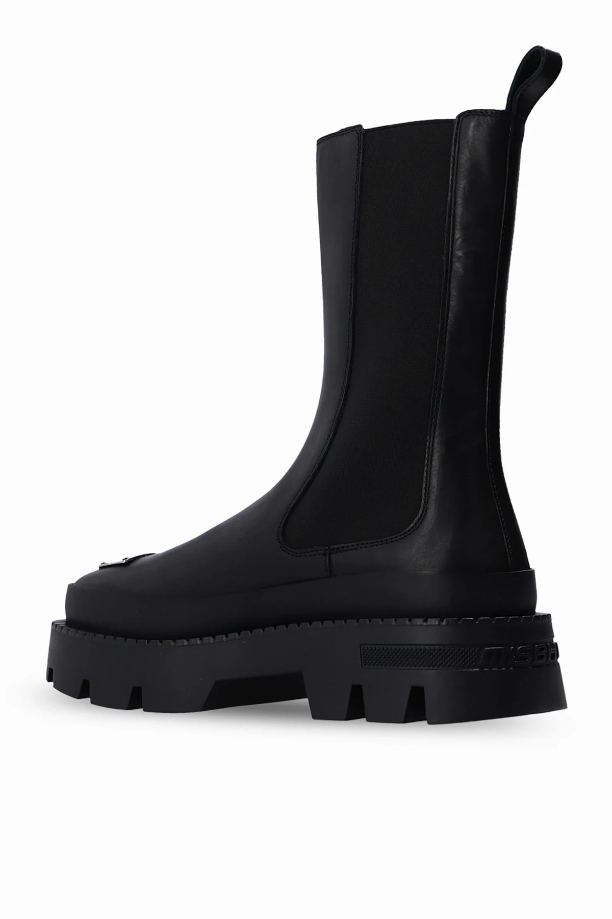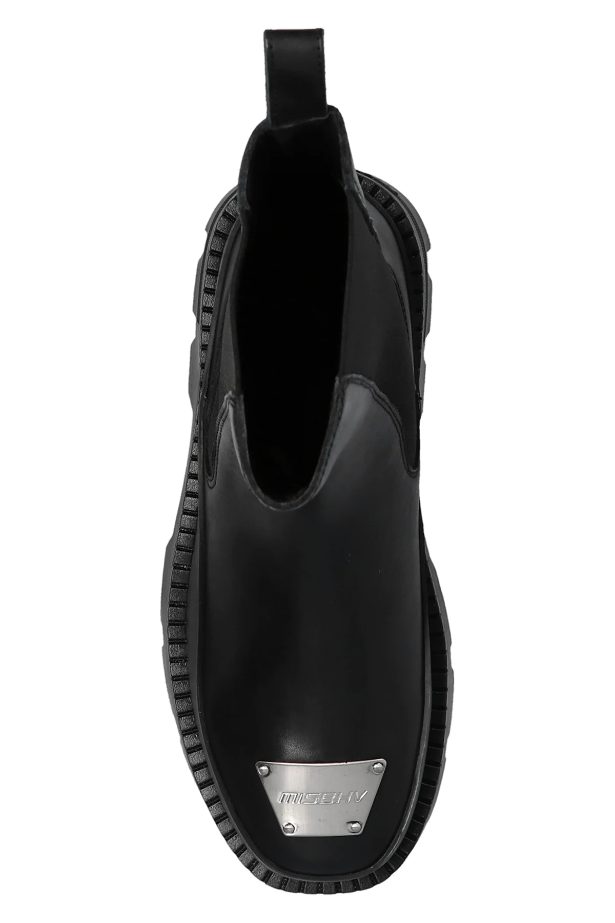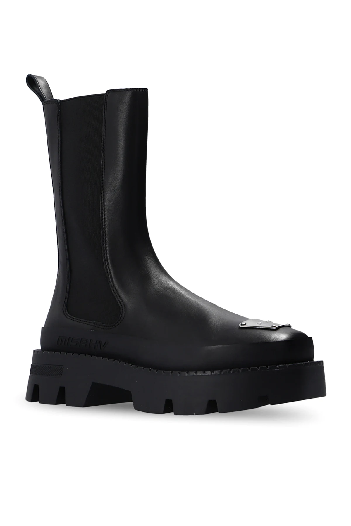 Czarne, skórzane buty za kostkę, model ‘The 2000 Chelsea’ MISBHV. Z przodu ozdobione metalową aplikacją z wytłoczonym logo w kolorze srebrnym. Po bokach wszyte gumy. Z tyłu wypukłe logo. Czarna, gumowa podeszwa.