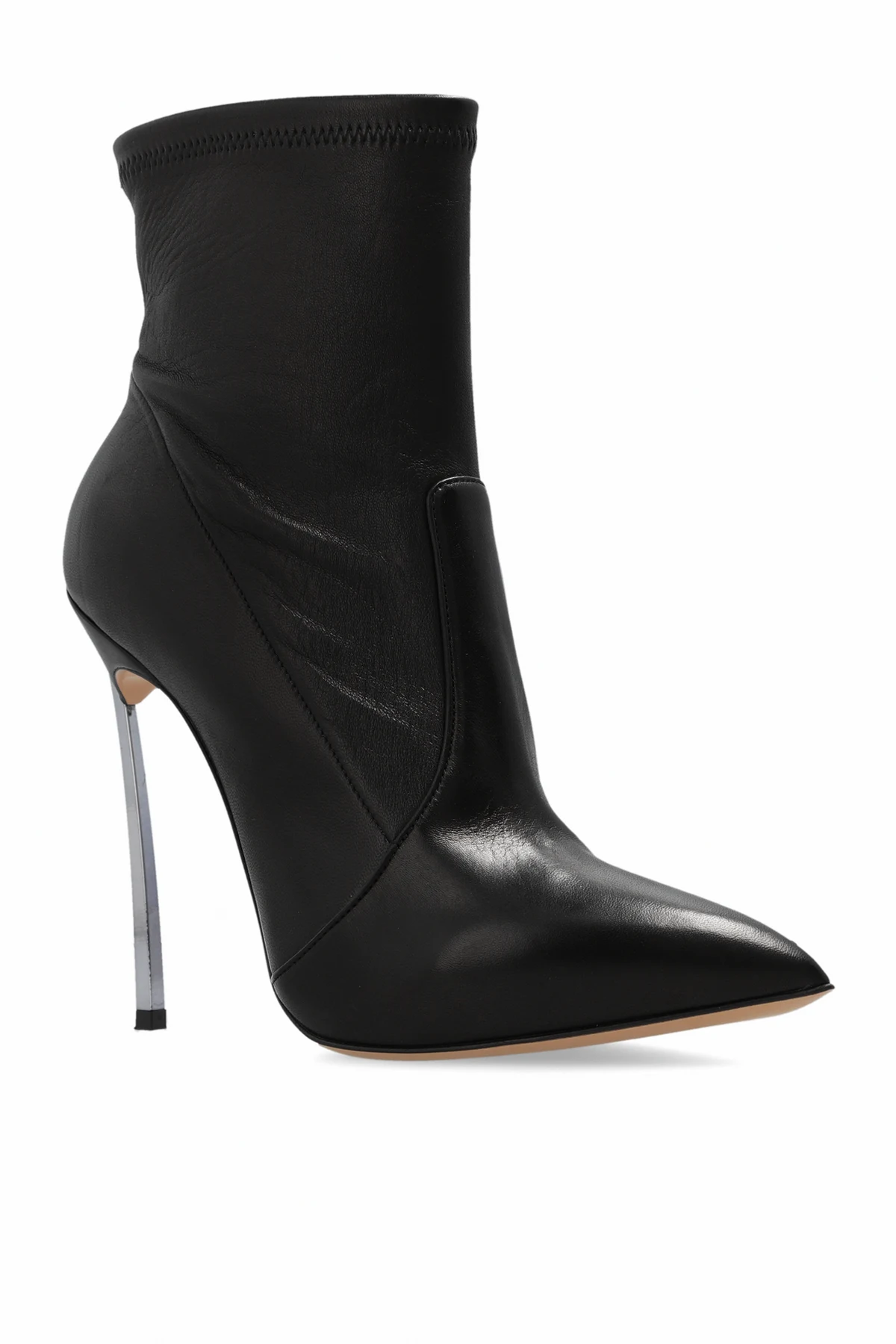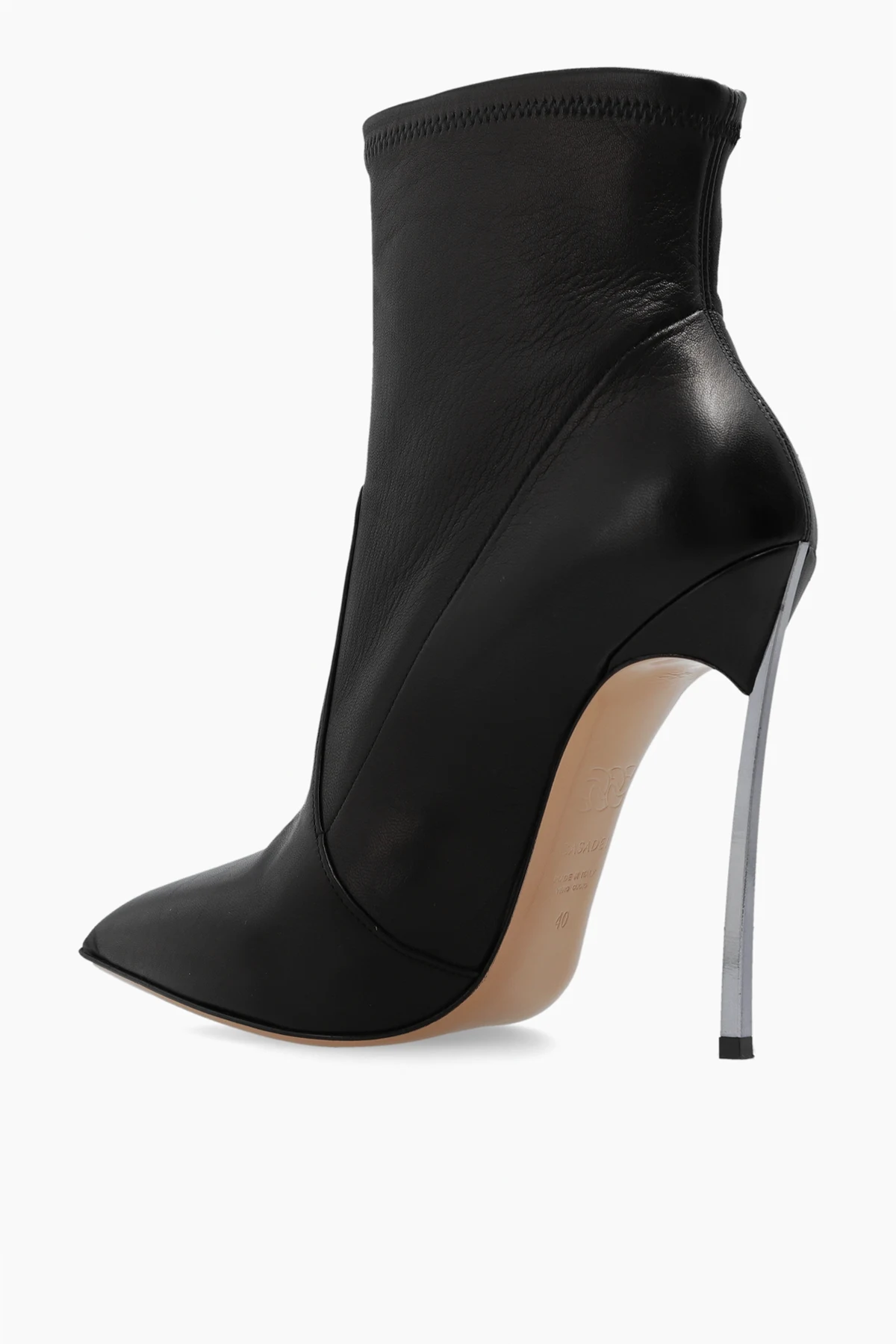 Czarne, wsuwane botki na obcasie, model ‘Blade’ Casadei. Wykonane z imitacji skóry pozyskanej z recyklingu. Nosek w szpic. Charakterystyczny dla marki obcas z hartowanej stali. Beżowa, skórzana podeszwa.