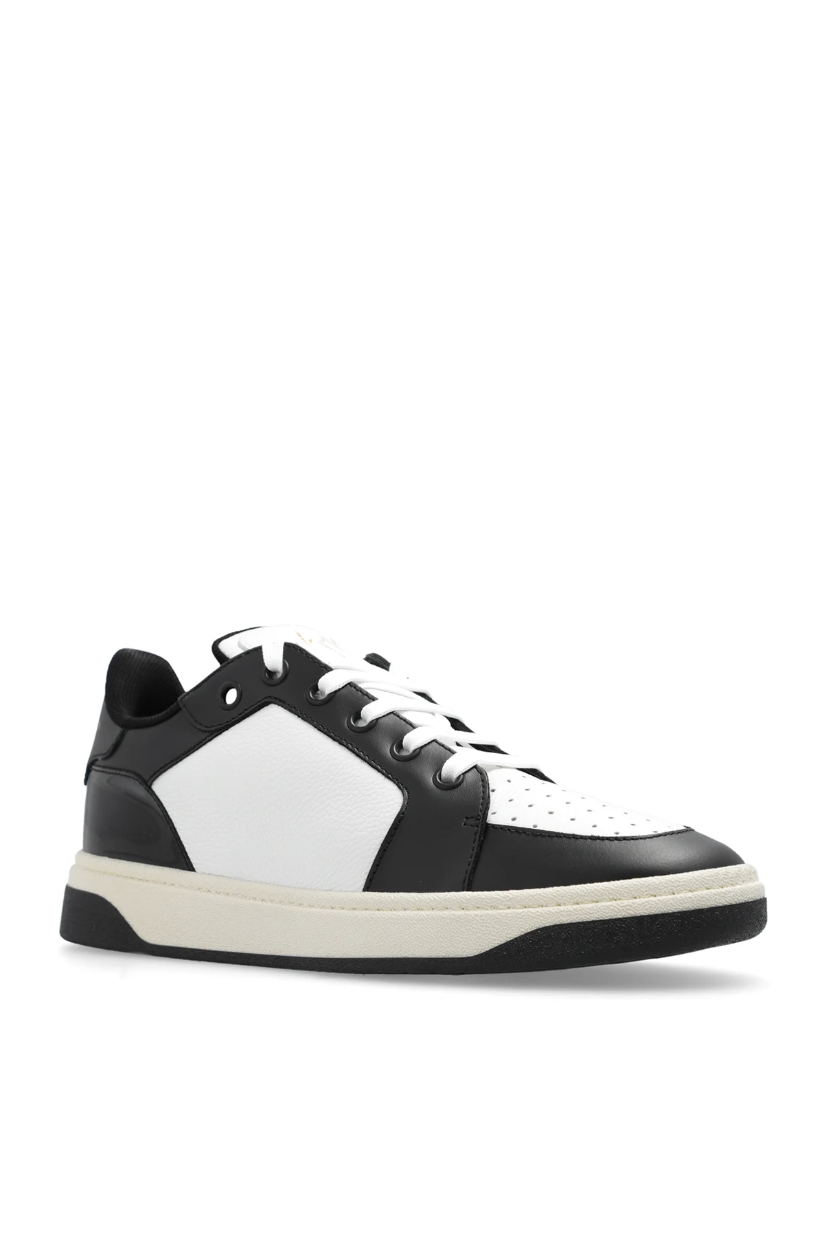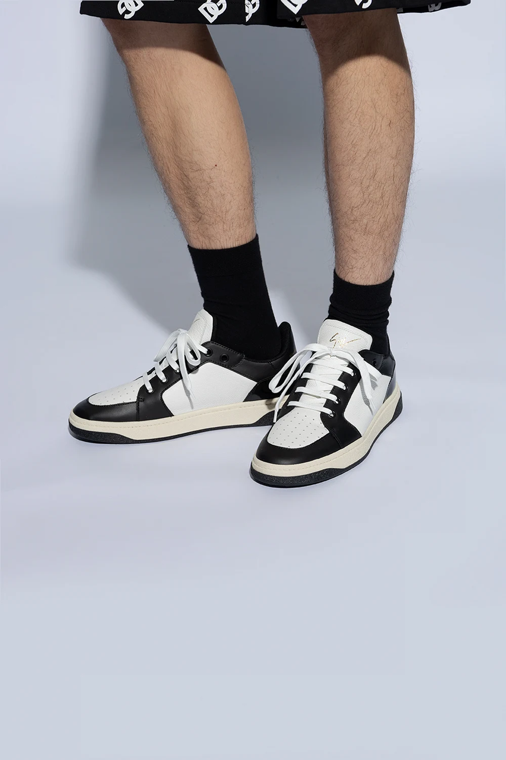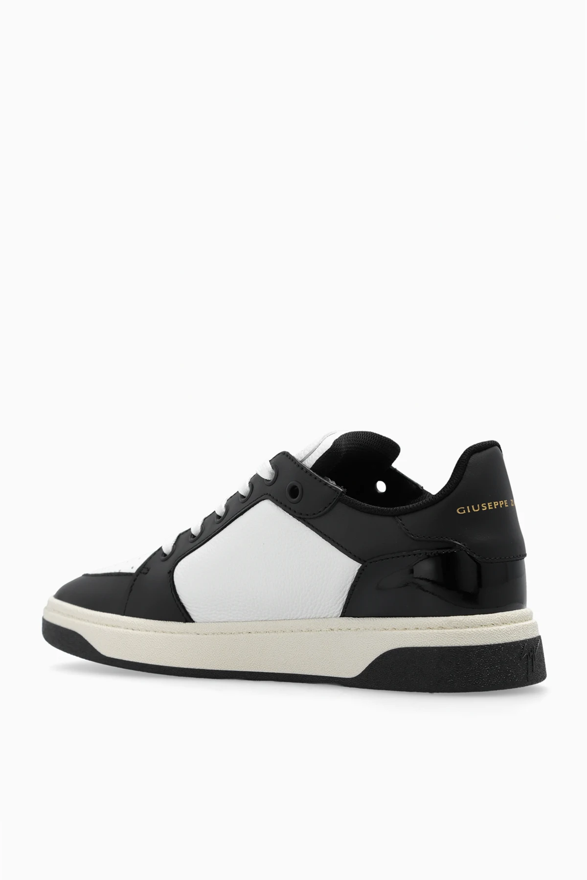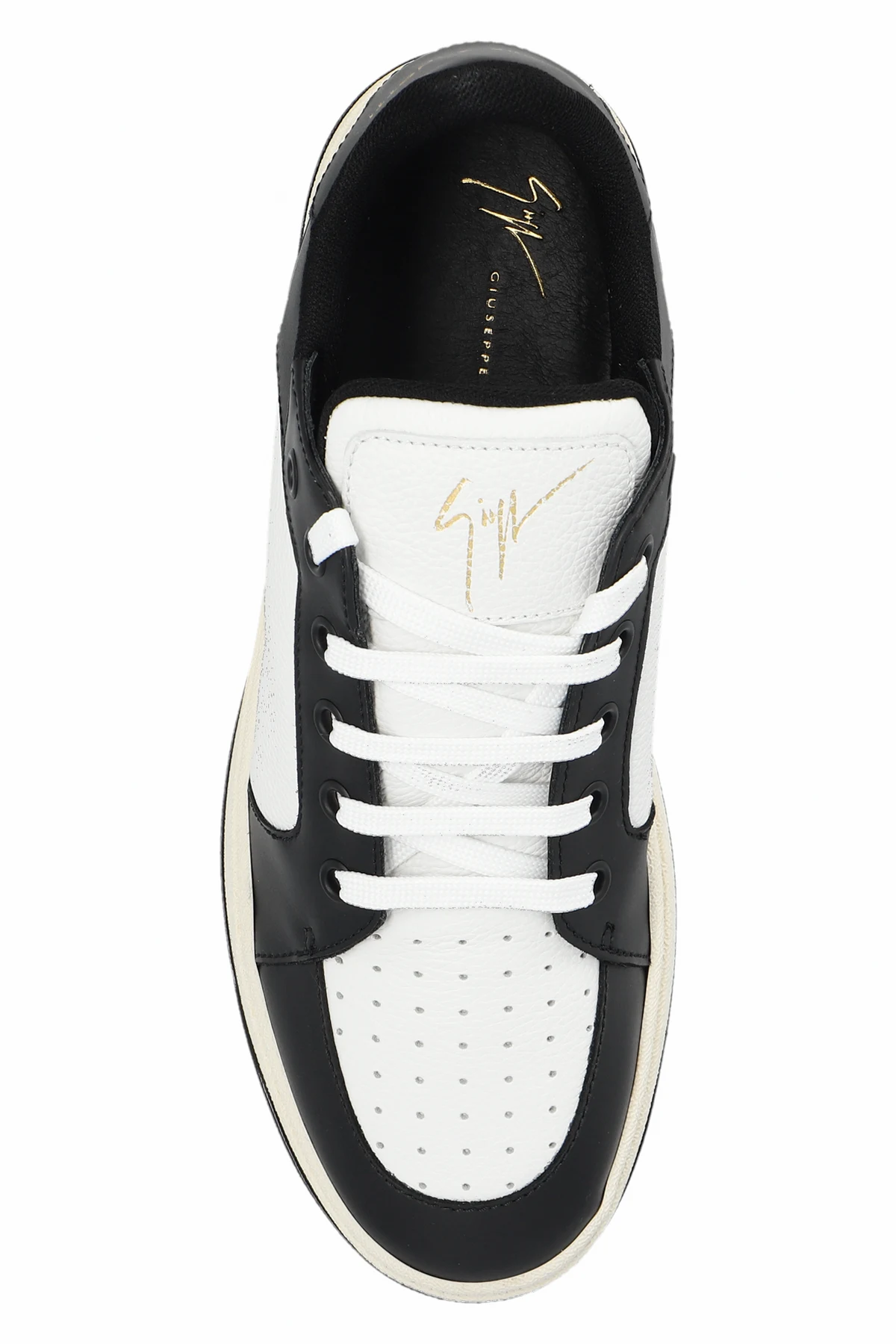 Biało-czarne, sznurowane buty sportowe, model ‘Gz94’ Giuseppe Zanotti. Wykonane ze skóry. Z przodu perforacja. Ozdobione logo w kolorze złotym. Czarno-kremowa, gumowa podeszwa.