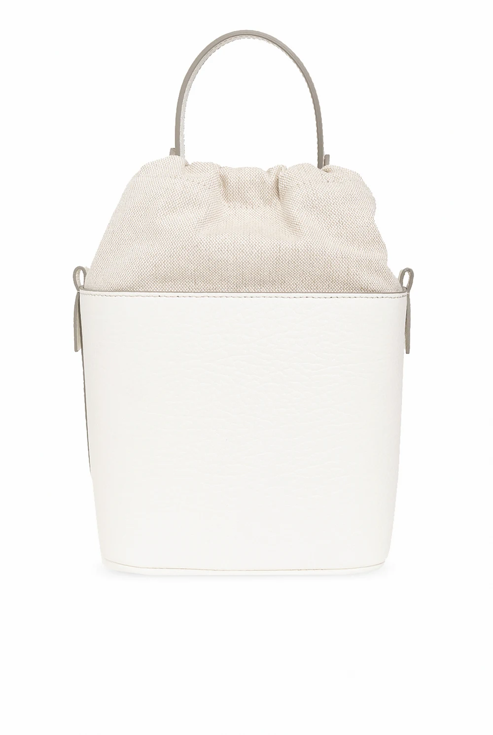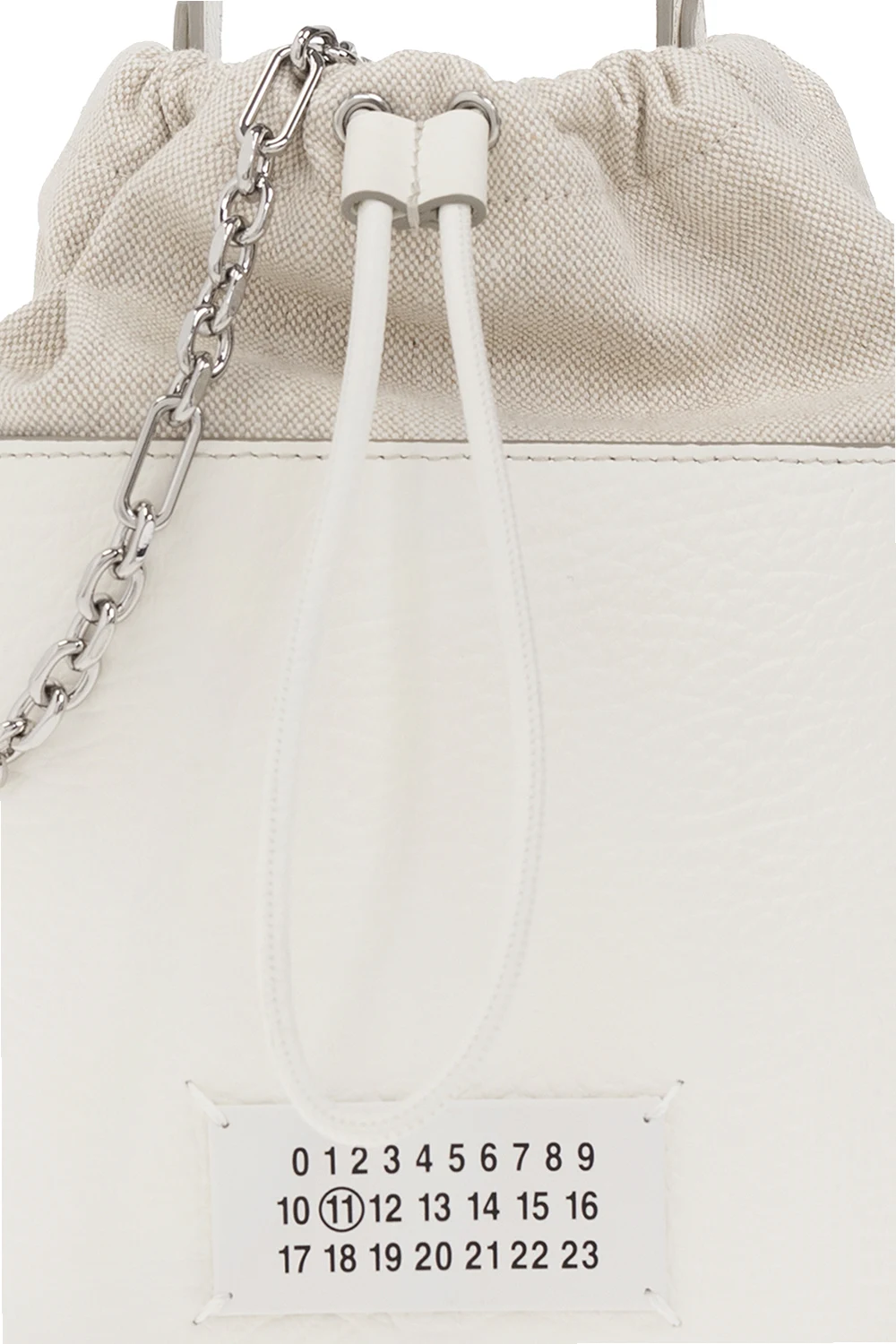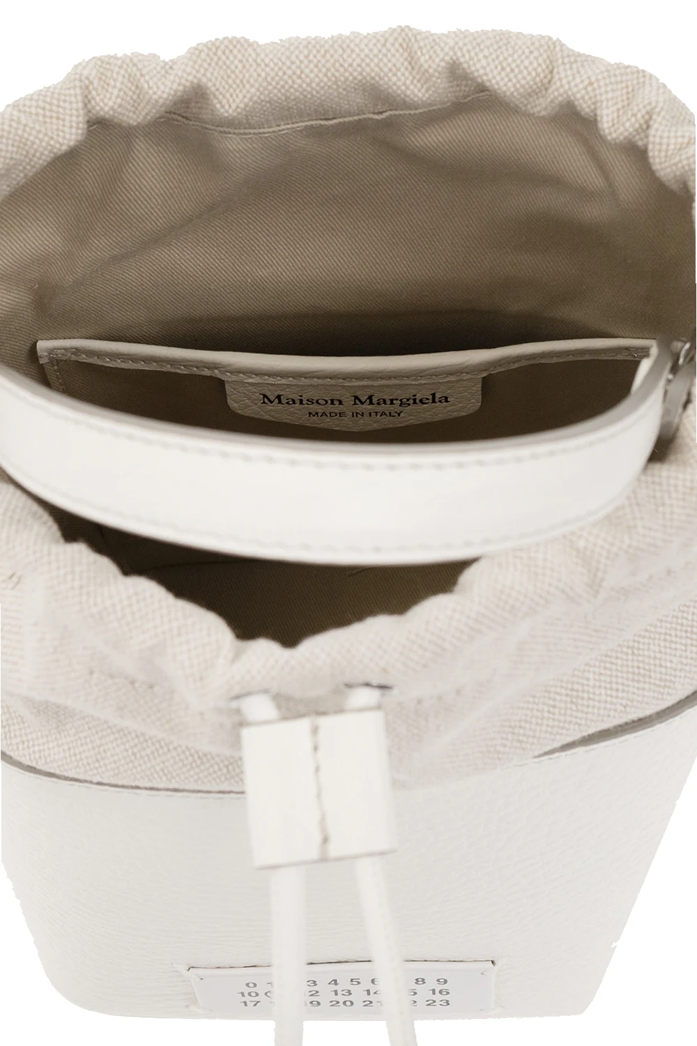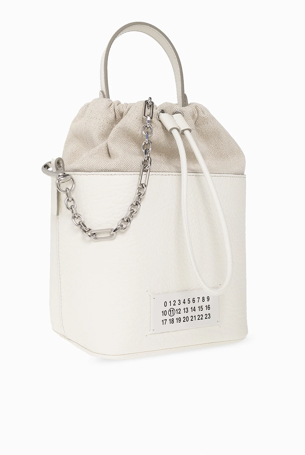 Biała torba na ramię, model '5AC Small' Maison Margiela. Wykonana ze skóry cielęcej. Ozdobiona naszywką z logo w kolorze czarnym. Półokrągła rączka. Odpinany pas na ramię. Wewnątrz komora ściągana trokami oraz wsuwana kieszeń. Metalowe wykończenie w kolorze srebrnym.