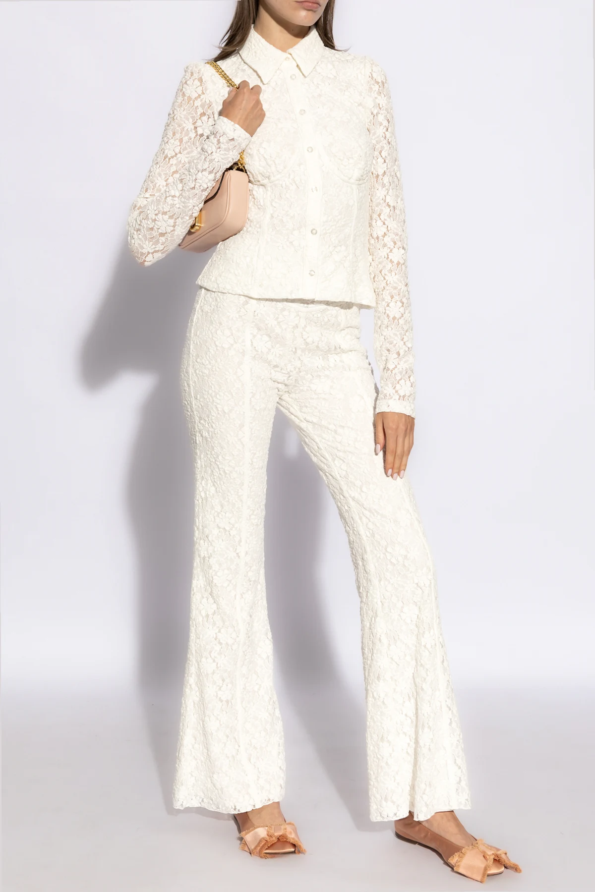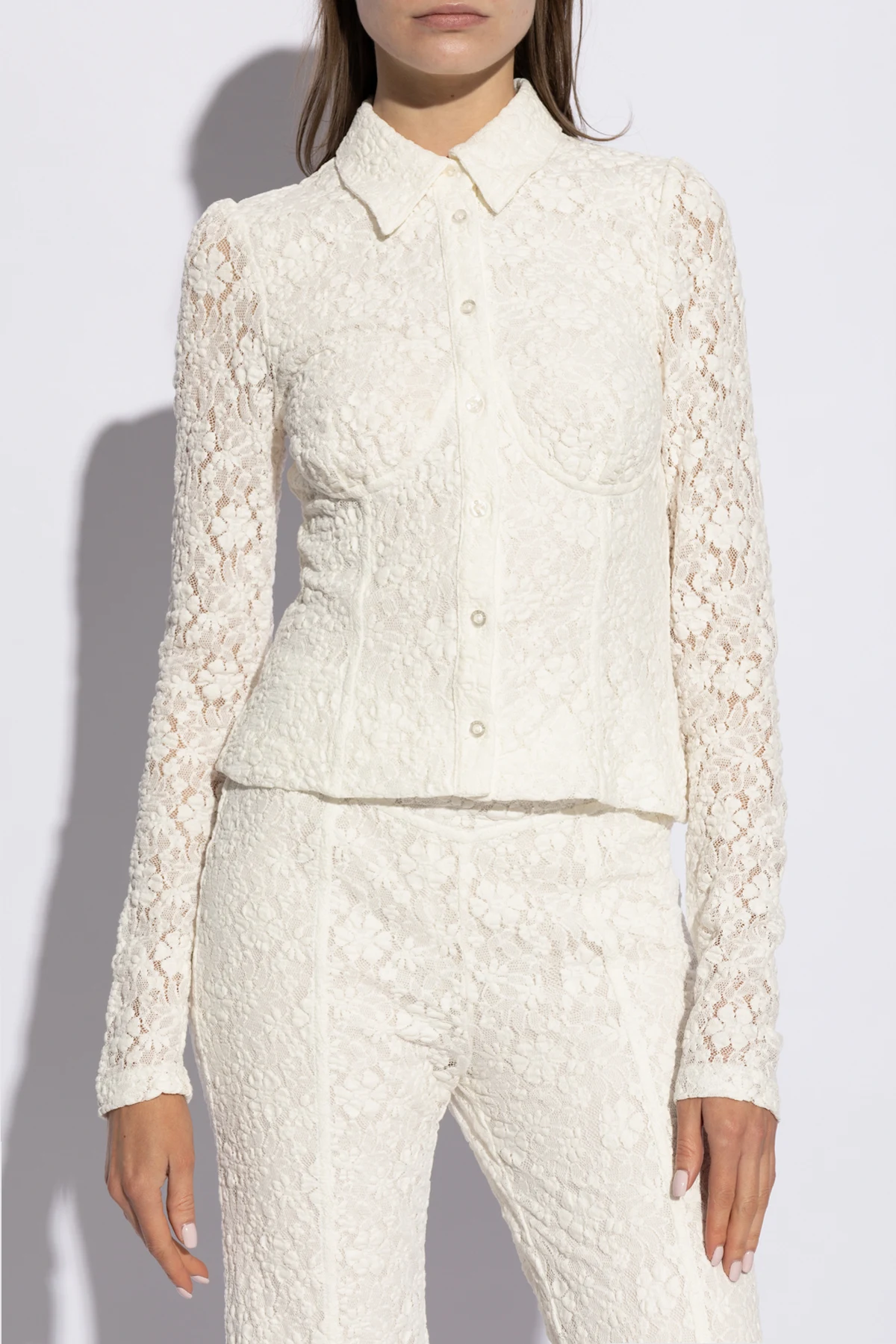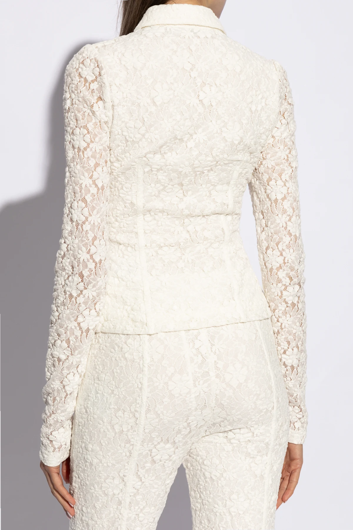 Przedstawiamy Państwu wykwintną koronkową koszulę od renomowanego projektanta ROTATE , która łączy w sobie wyszukaną estetykę z niebywałą wygodą. Ten ponadczasowy element garderoby został zaprojektowany z myślą o kobietach ceniących sobie elegancję oraz jakość. Biała, delikatnie prześwitująca koronka z kwiatowym wzorem nadaje produktowi subtelny, lecz wyrazisty charakter. Długie rękawy oraz klasyczny kołnierzyk podkreślają tradycyjną elegancję, natomiast dopasowany fason z lekko zaznaczoną talią modeluje sylwetkę, eksponując jej atuty.