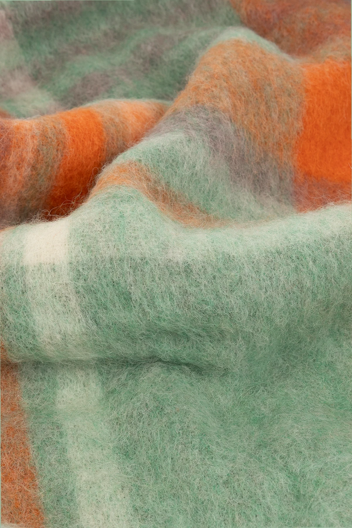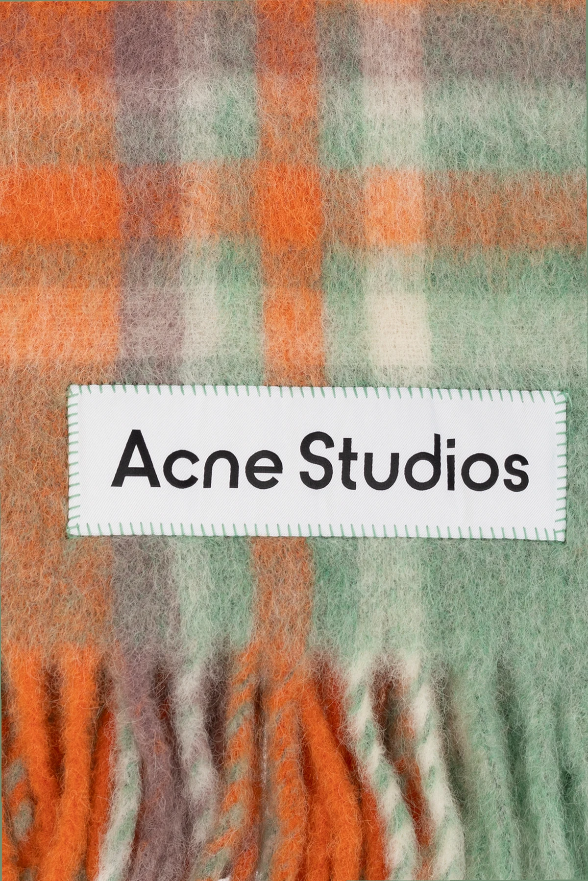 Pomarańczowo-zielono-fioletowy koc Acne Studios. Wykonany z mieszanki wełny owczej, alpaki i moheru. Ozdobiony wzorem z motywem kraty i naszywką z logo. Wykończony frędzlami.