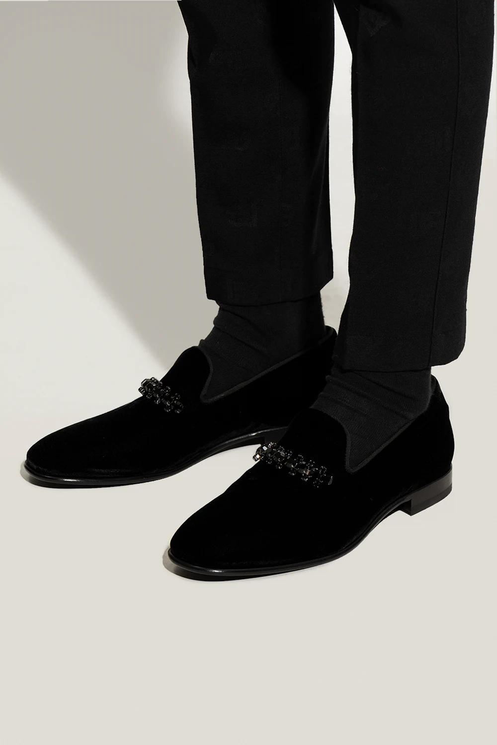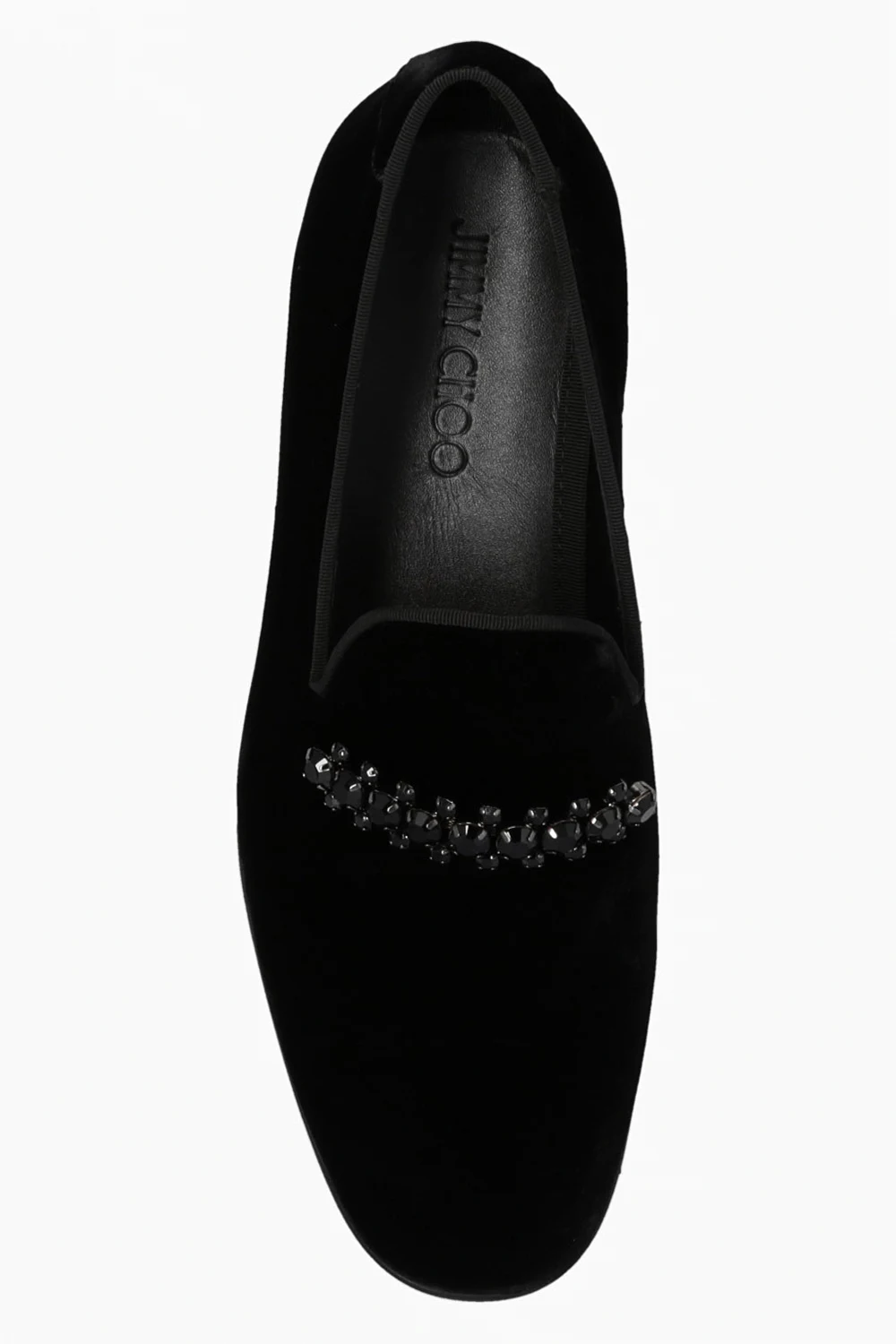Czarne, aksamitne buty typu ‘loafers’, model ‘Thame’ Jimmy Choo. Z przodu dekoracyjna aplikacja wykończona połyskującymi kamieniami. Czarna, skórzana podeszwa.