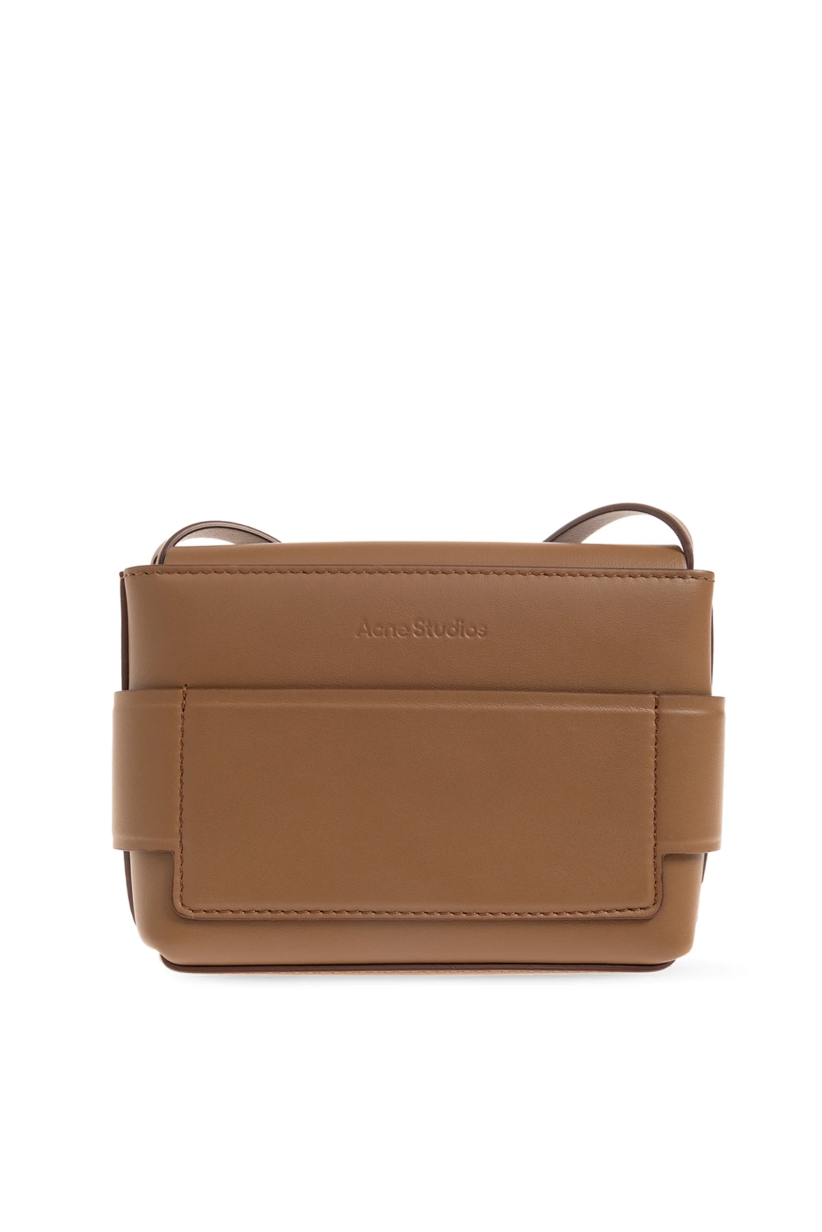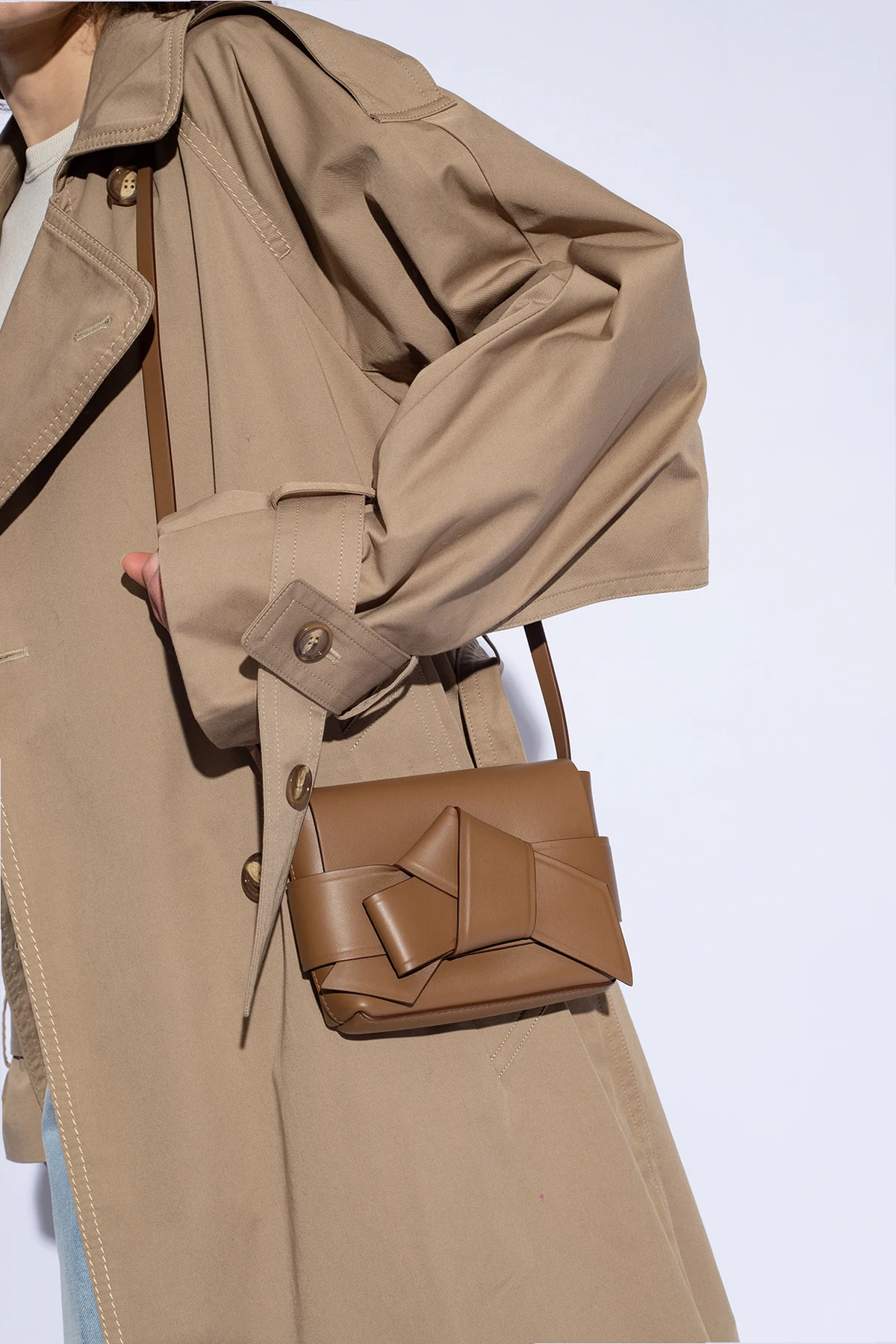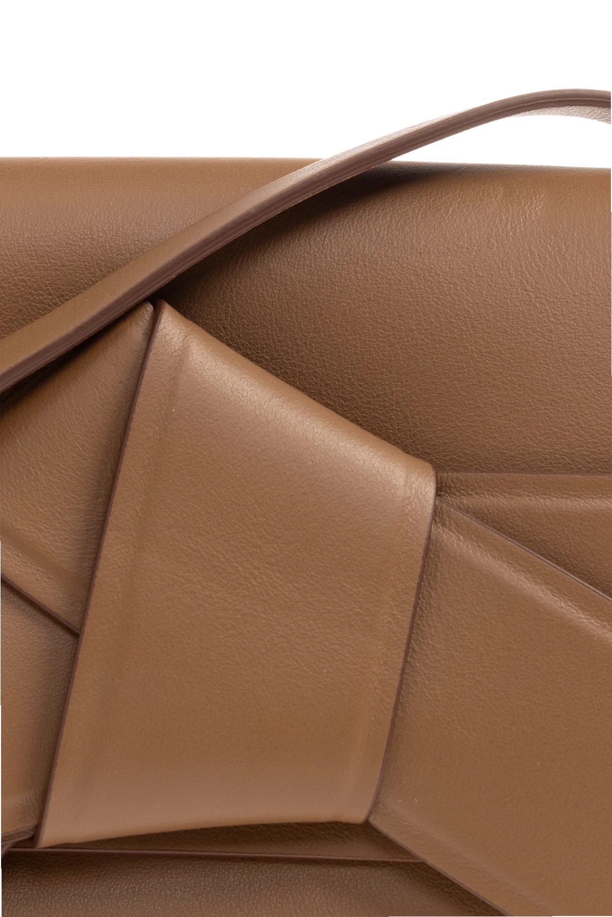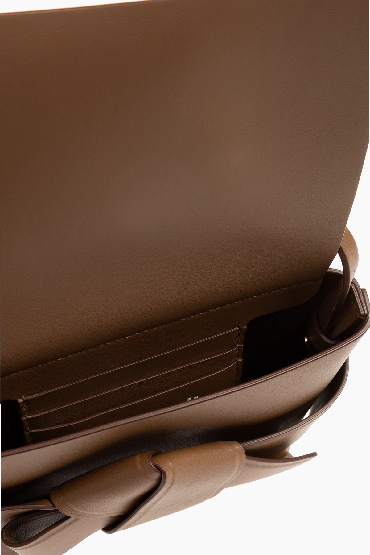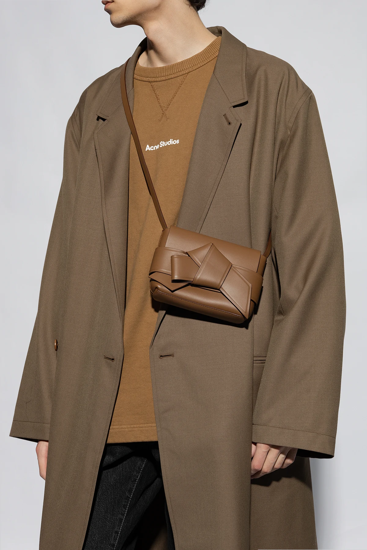 Brązowa torba na ramię, model ‘Musubi Mini’ Acne Studios. Wykonana ze skóry cielęcej. Zamykana na wsuwaną klapę. Z przodu, inspirowany tradycyjnymi japońskimi szarfami obi, pas z dekoracyjnym węzłem. Z tyłu wytłoczone logo. Regulowany pas na ramię. Wewnątrz komora z trzema miejscami na karty.
