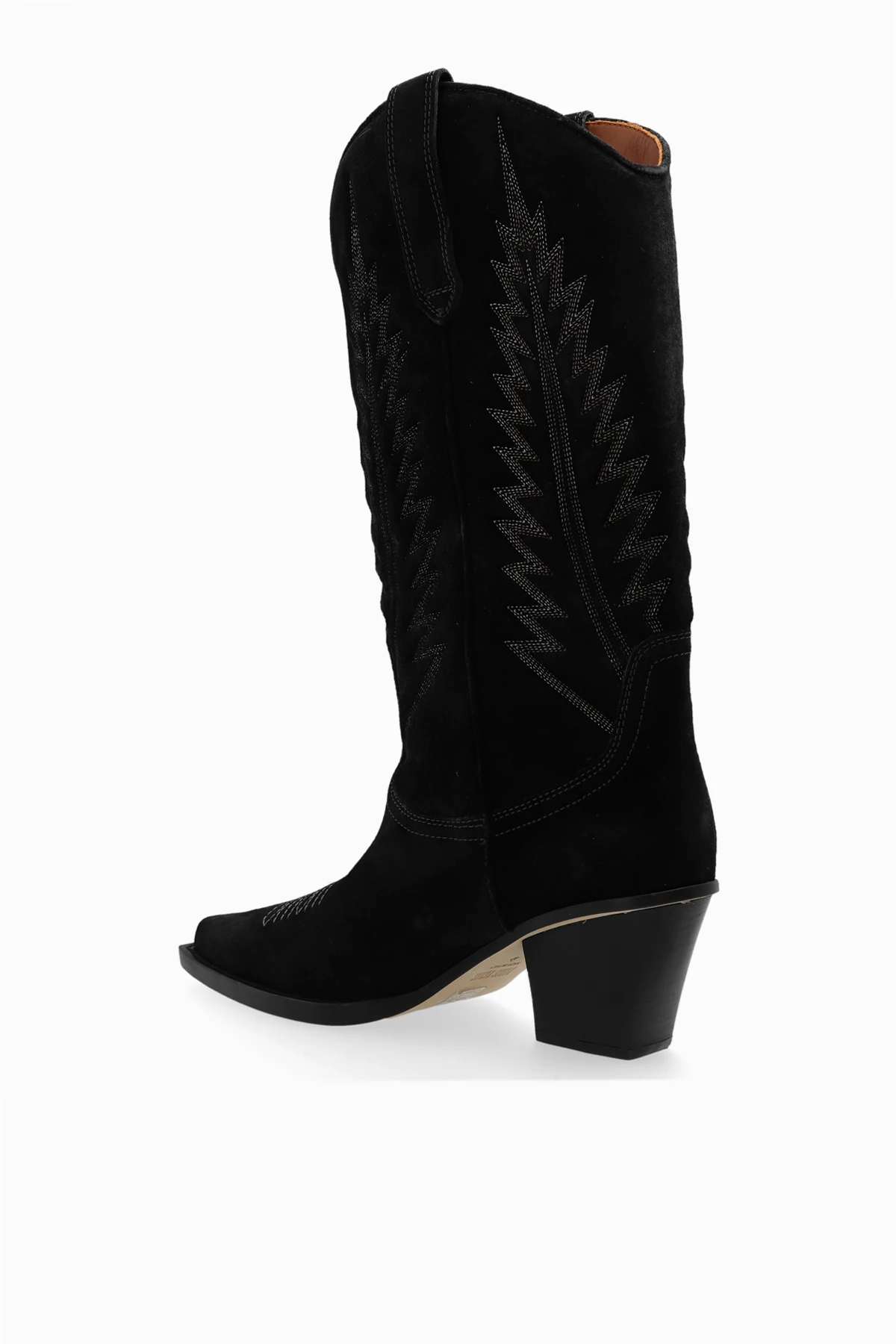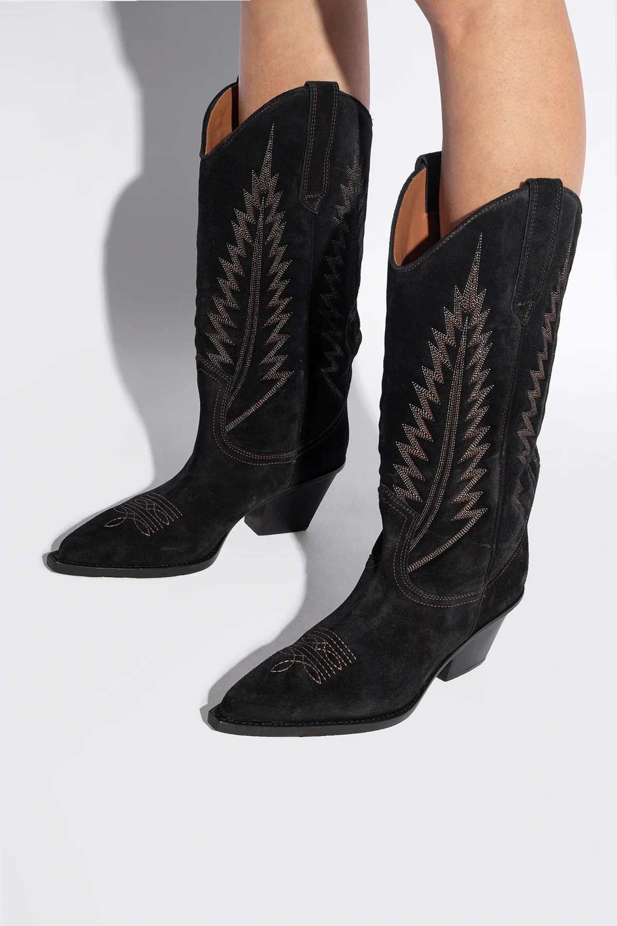 – Brązowe zamszowe botki z obcasem kubańskim i kowbojskim przeszyciem
