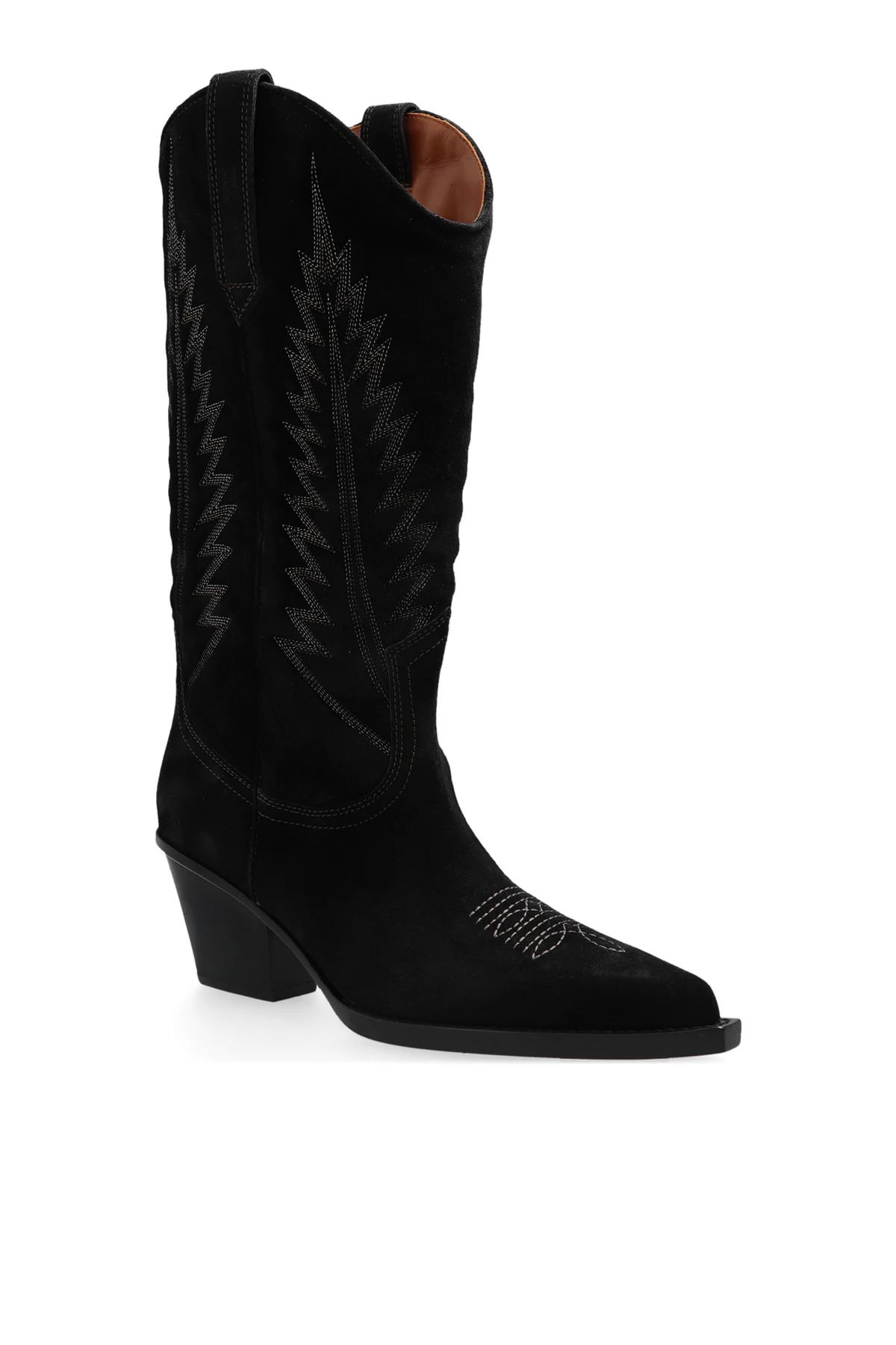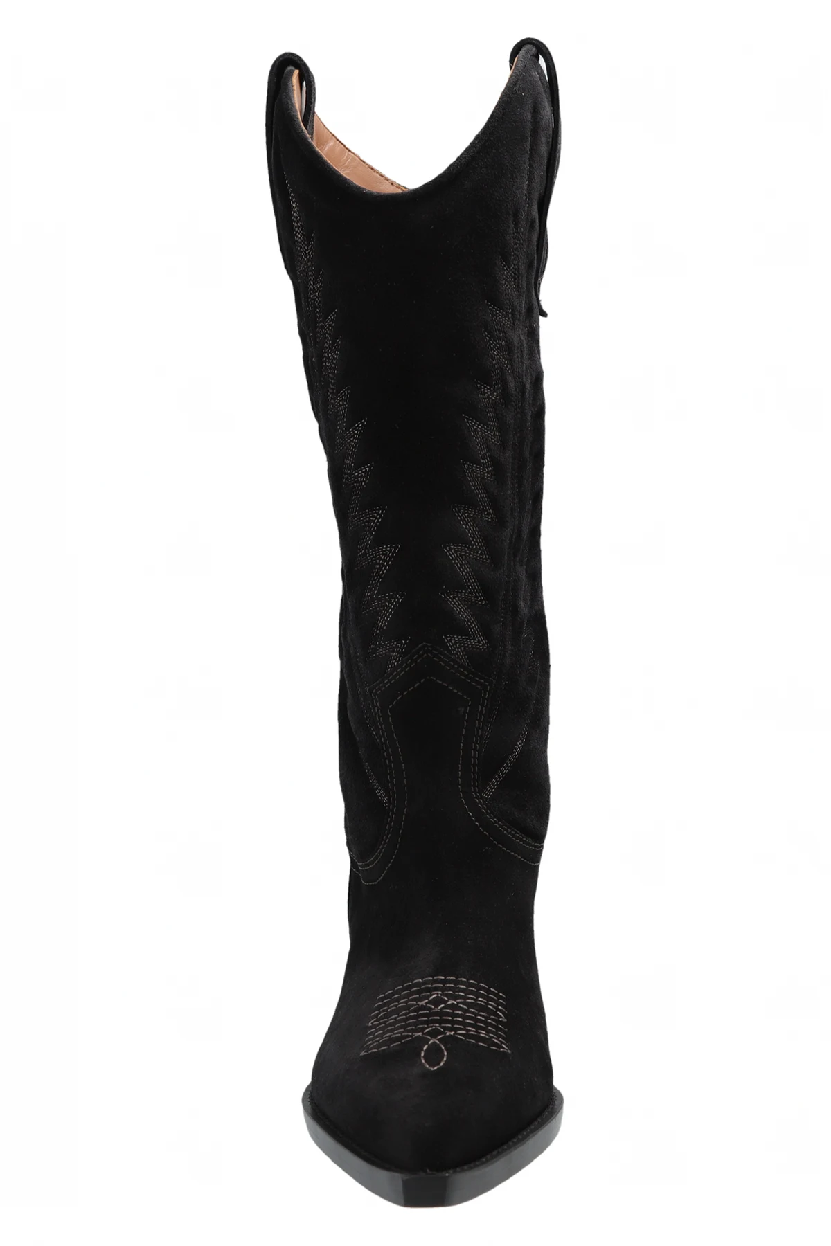 Czarne kowbojki na obcasie, model ‘Rosario’ Paris Texas. Wykonane z zamszu cielęcego. Ozdobione dekoracyjnymi beżowymi przeszyciami. Nosek szpic. Jasnobeżowa, skórzana podeszwa.