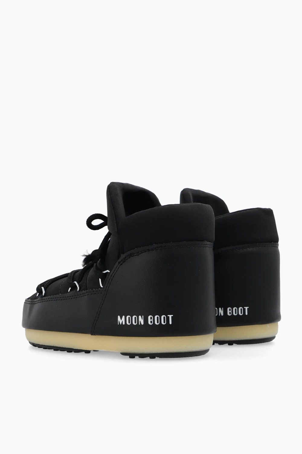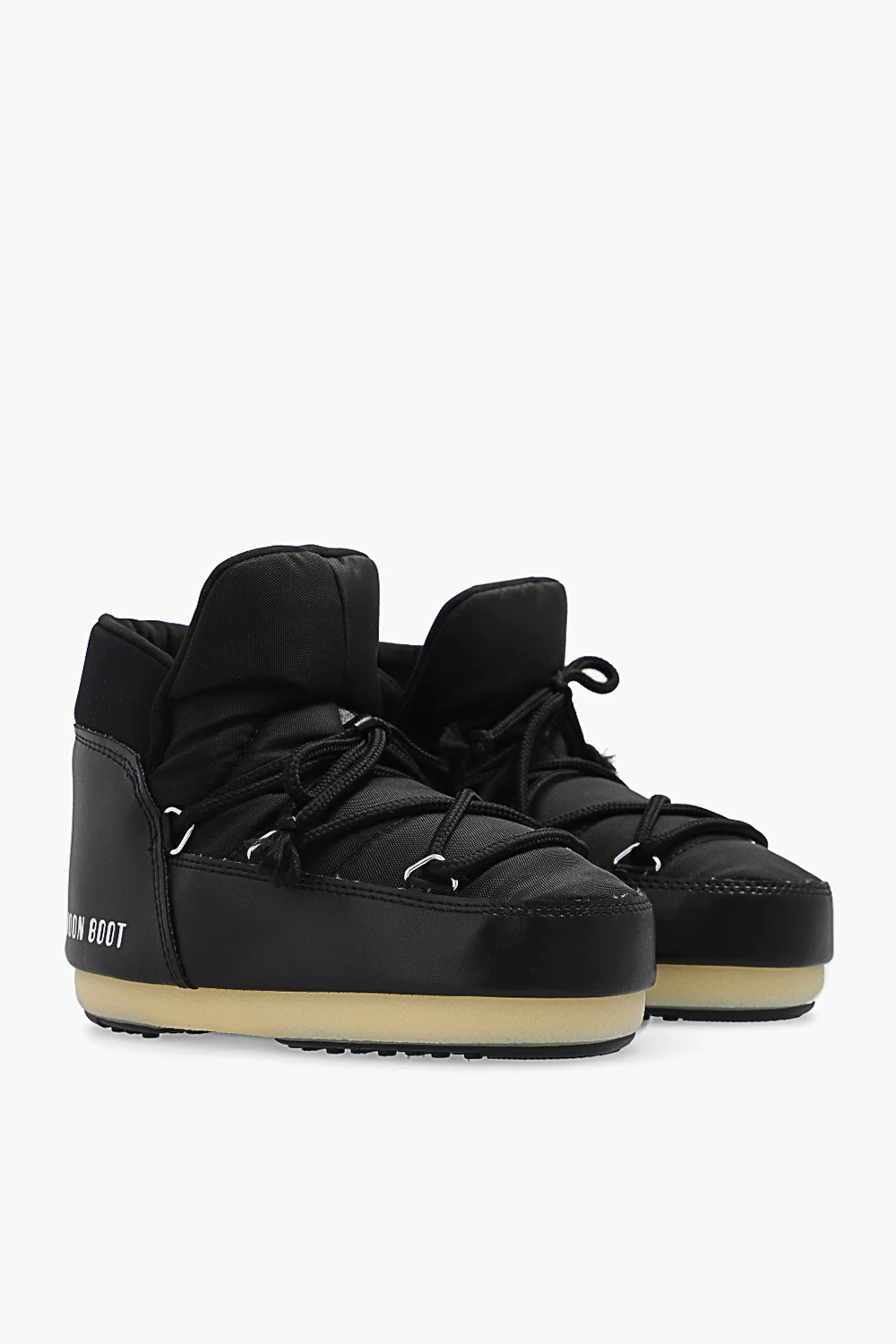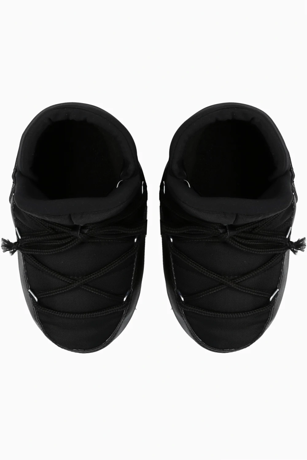 Czarne, sznurowane śniegowce, model ‘Pumps Nylon’ Moon Boot Kids. Wykonane z nylonu i materiału imitującego skórę. Ozdobione nadrukowanym białym logo. Czarno-kremowa, gumowa podeszwa.