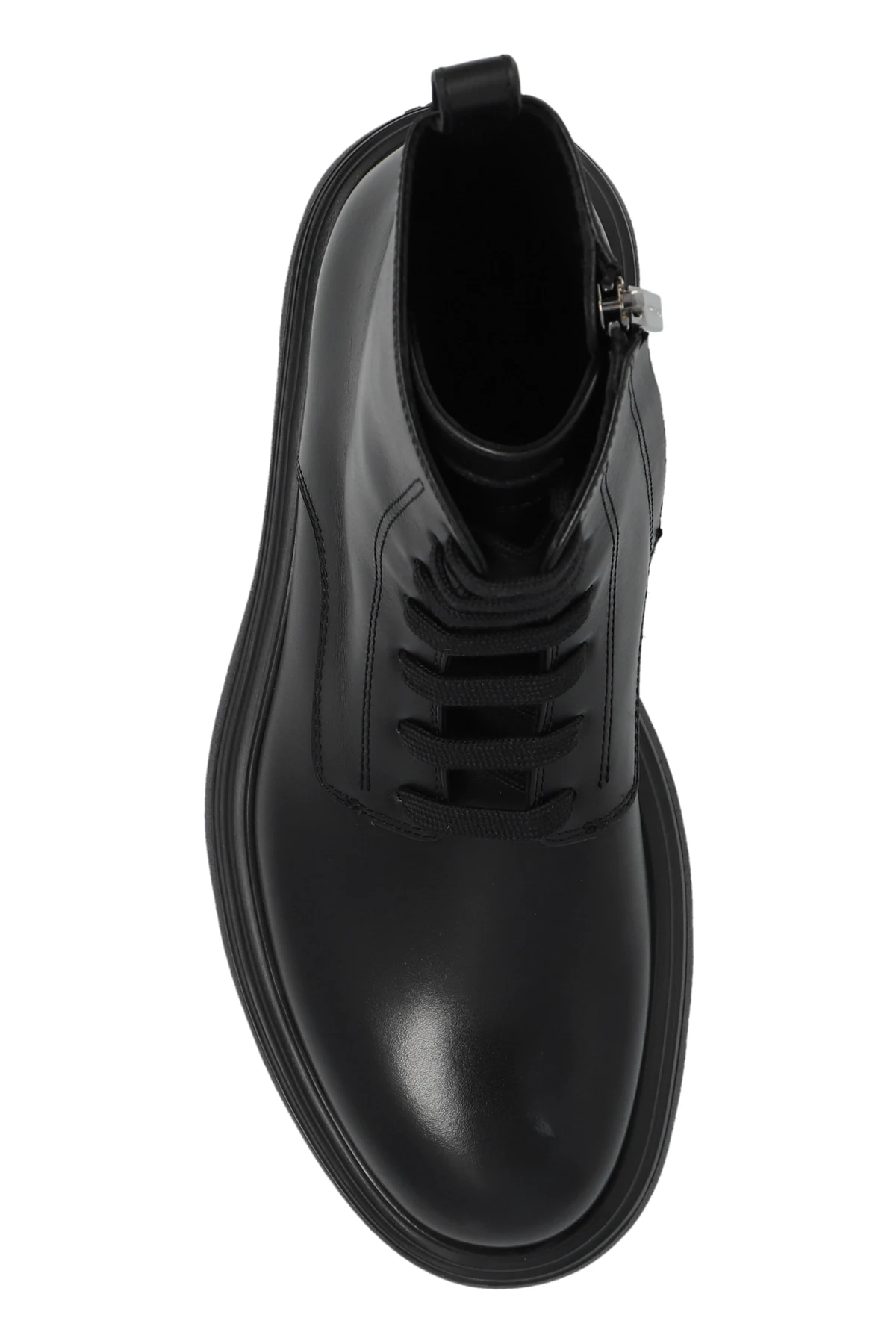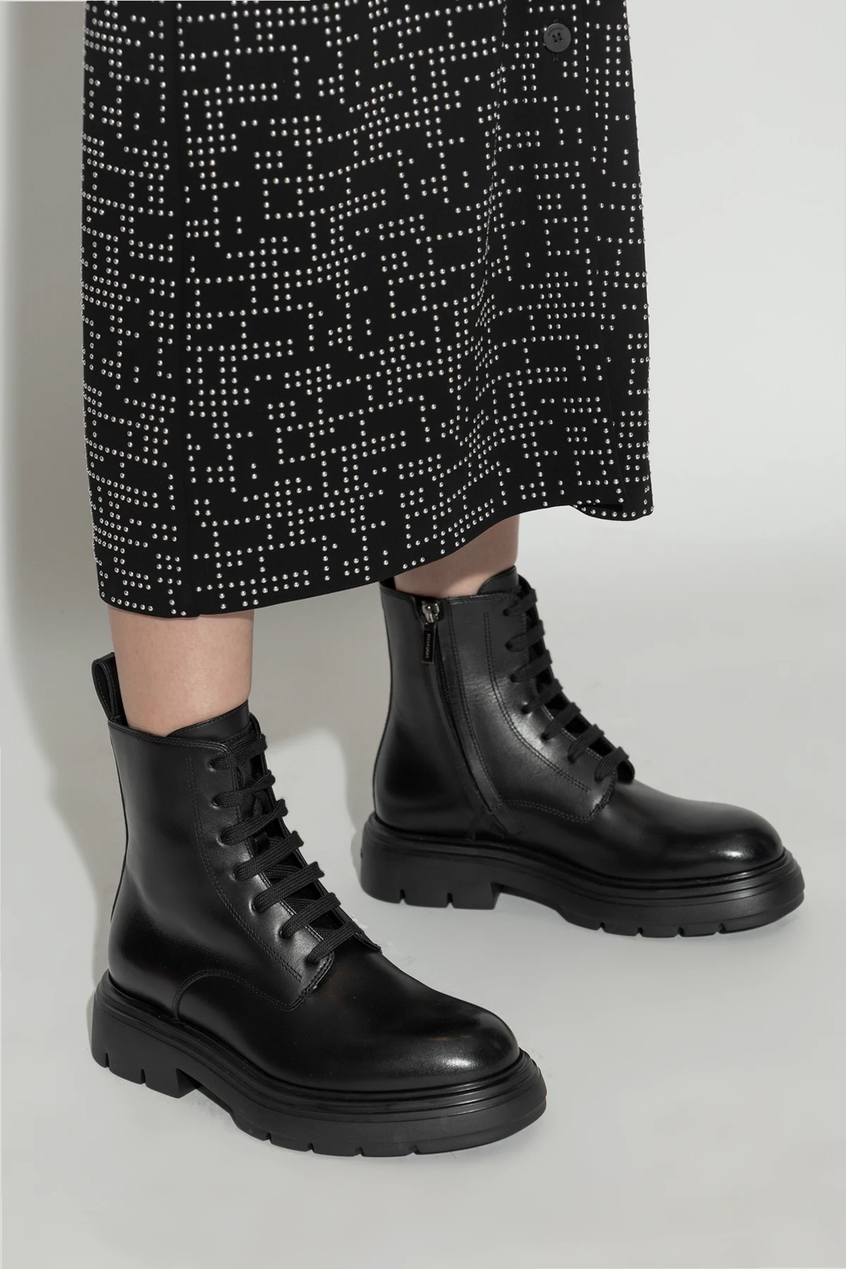 Te czarne botki są sznurowane, co pozwala na ich precyzyjne dopasowanie do indywidualnych potrzeb użytkownika. Dodatkowo, zamek błyskawiczny po wewnętrznej stronie ułatwia ich zakładanie i zdejmowanie, a pętla na pięcie zwiększa funkcjonalność obuwia.