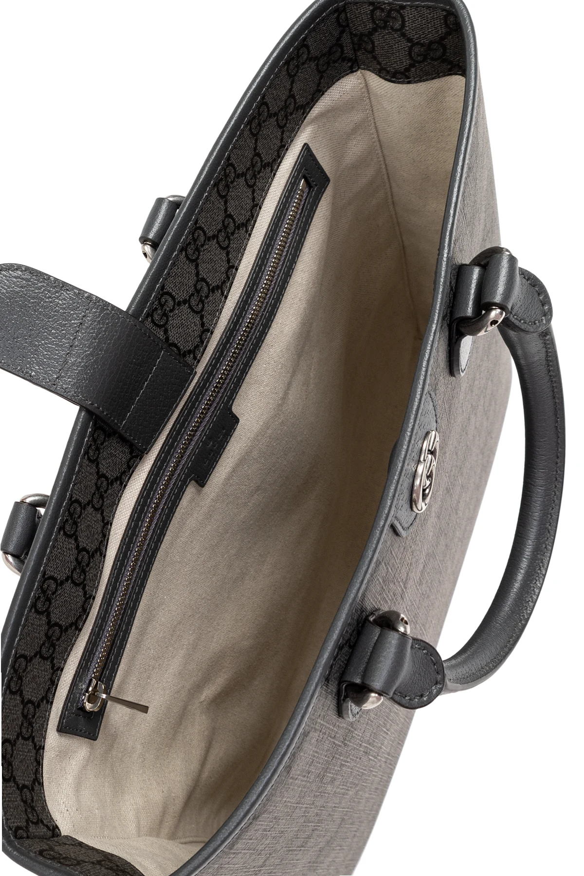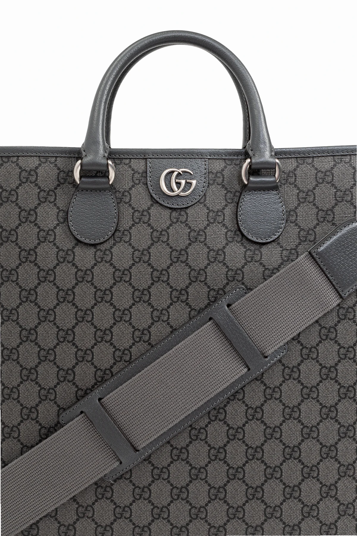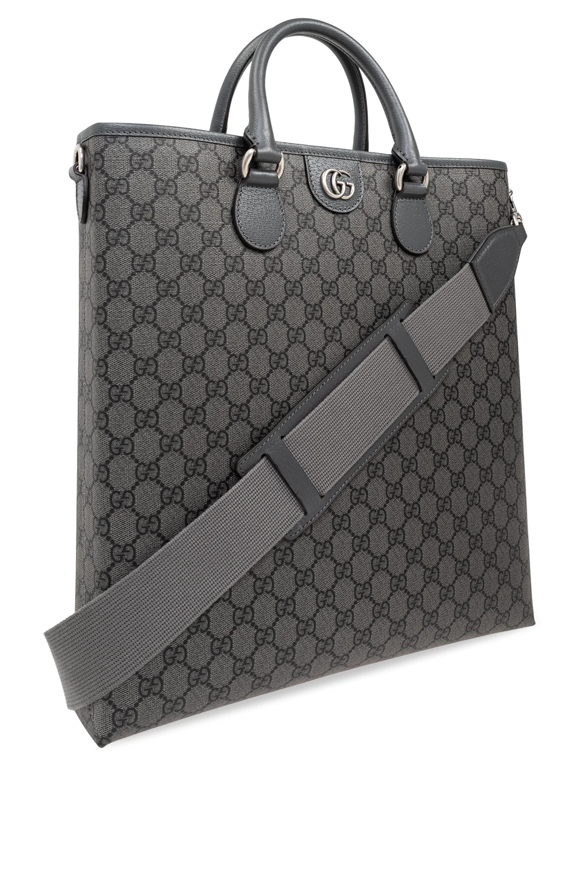 Prezentujemy Państwu wykwintną torbę typu ‘shopper’ z monogramem , będącą kwintesencją męskiej elegancji i funkcjonalności. Projekt od renomowanego domu mody Gucci urzeka precyzją wykonania i dbałością o detale. Dominującym kolorem jest szarość, przełamana charakterystycznym, powtarzalnym wzorem monogramowym, który nadaje temu akcesorium unikalnego charakteru.