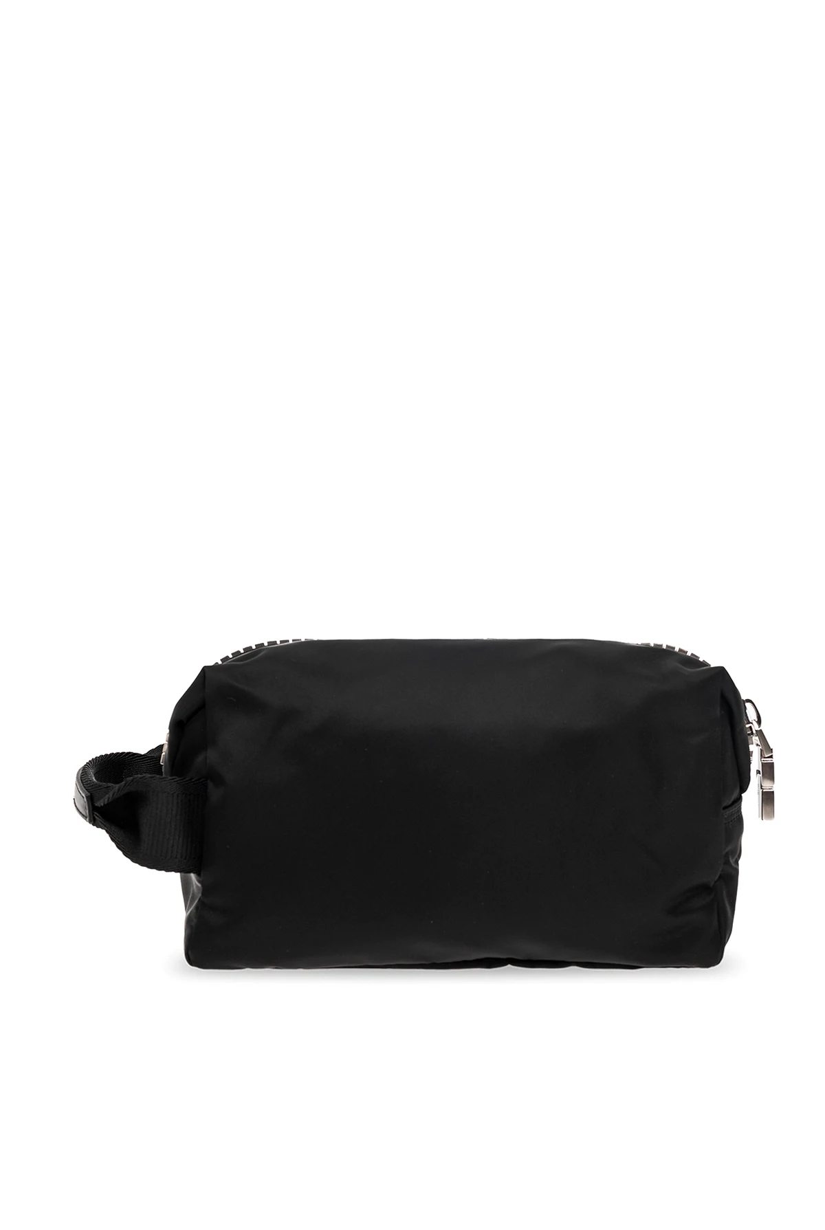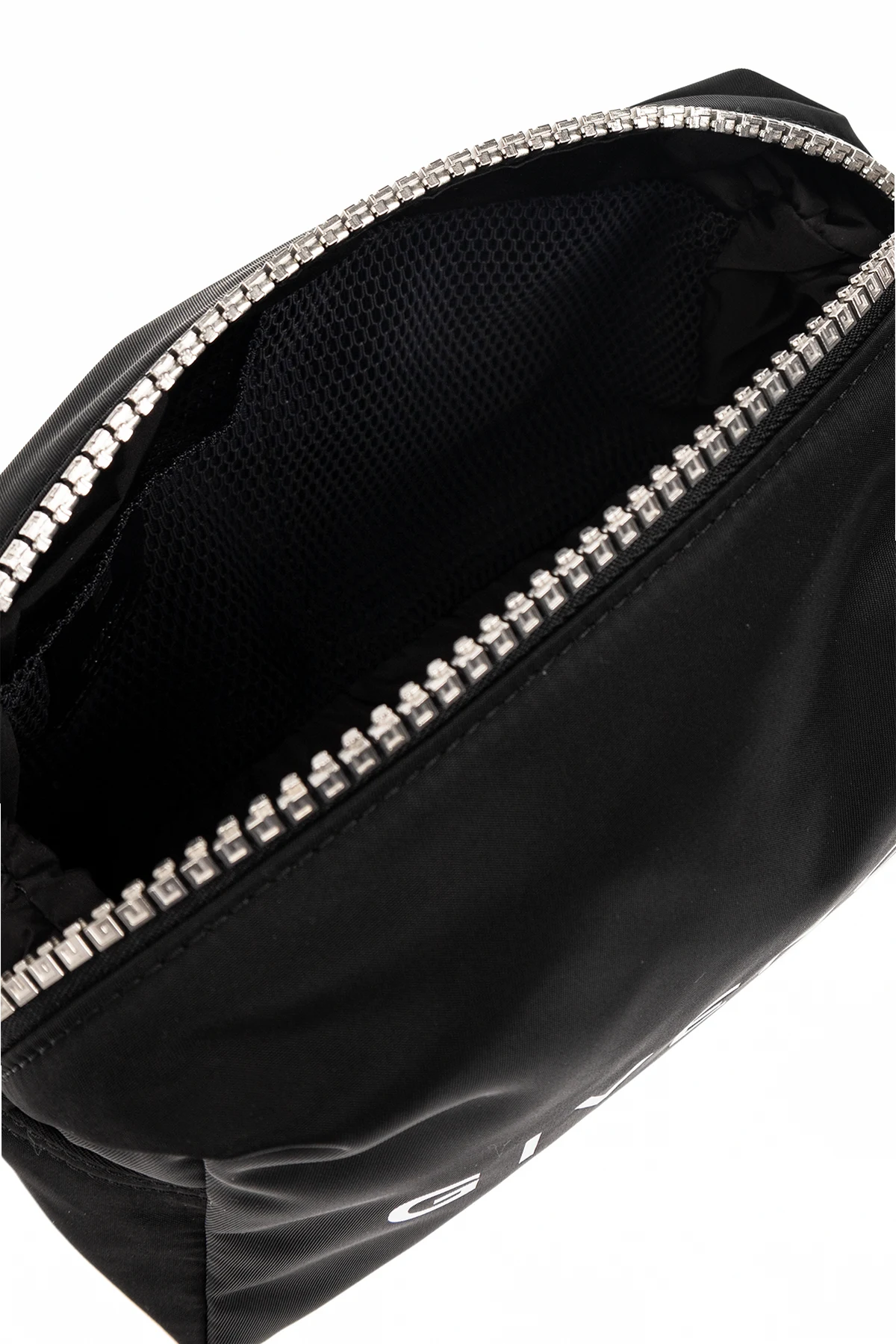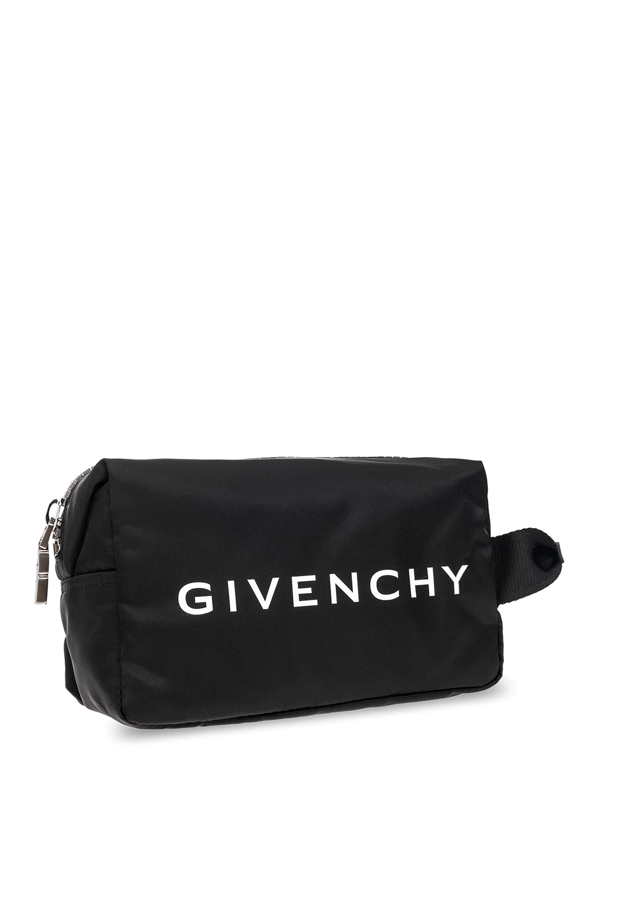 Czarna kosmetyczka Givenchy. Zamykana na zamek. Ozdobiona białym nadrukiem z logo. Półokrągła rączka. Wewnątrz komora oraz wsuwana kieszeń. Metalowe wykończenie w kolorze srebrnym.