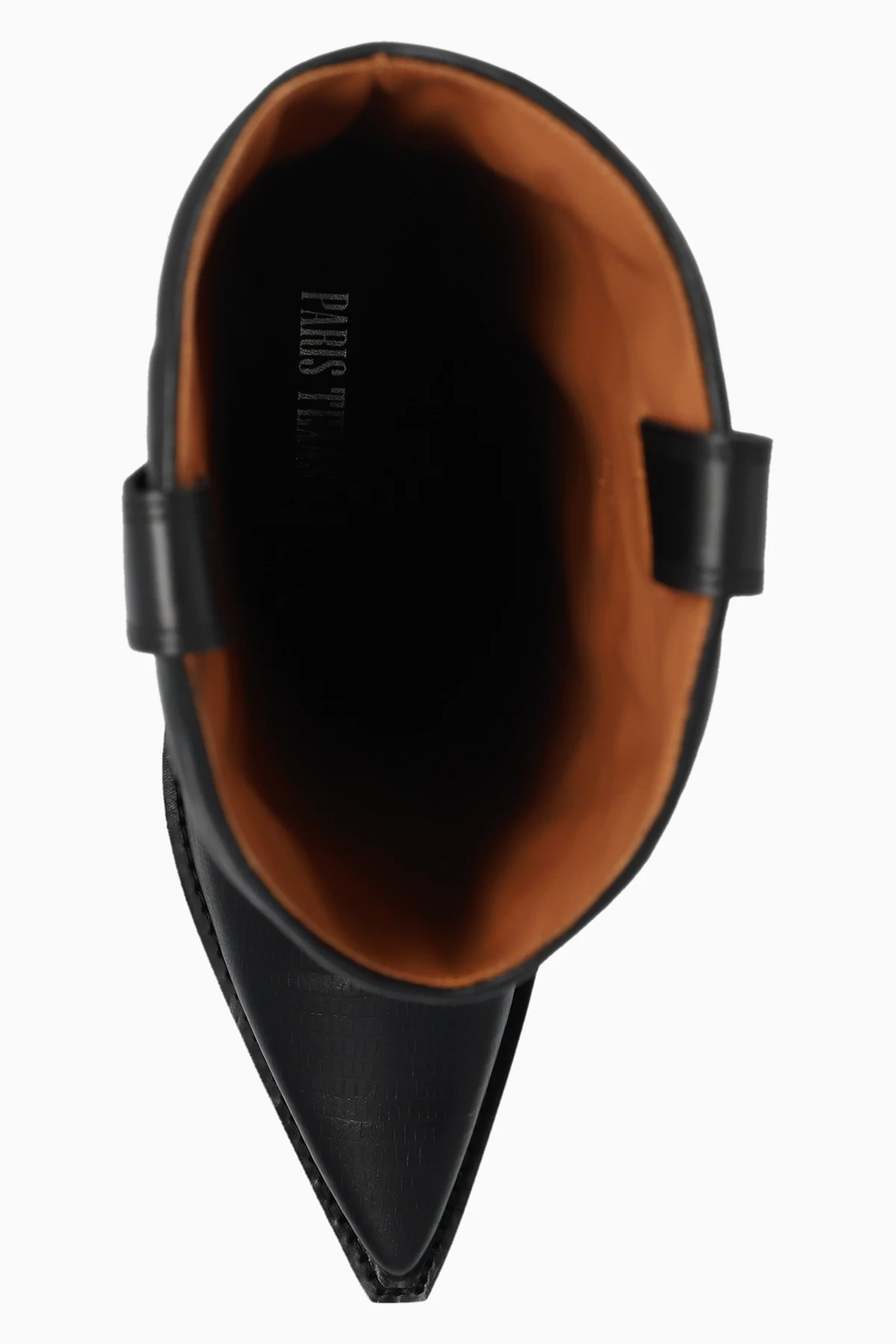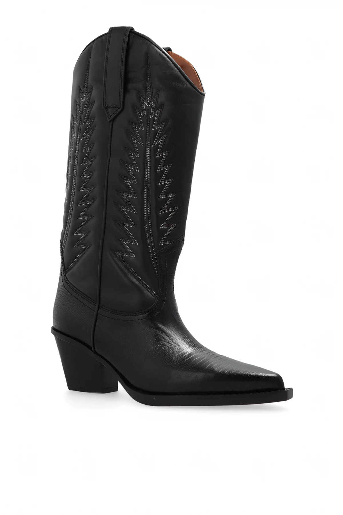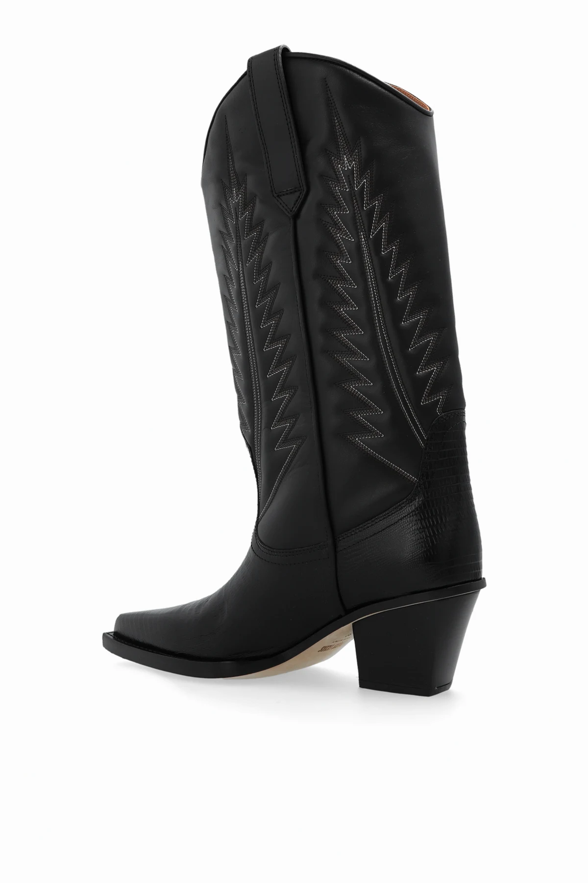 Czarne, wsuwane kowbojki, model ‘Rosario’ Paris Texas. Wykonane ze skóry imitującej skórę węża i gładkiej. Ozdobione wyszytym wzorem w kolorze biało-beżowym. Nosek w szpic. Kremowa, skórzana podeszwa.
