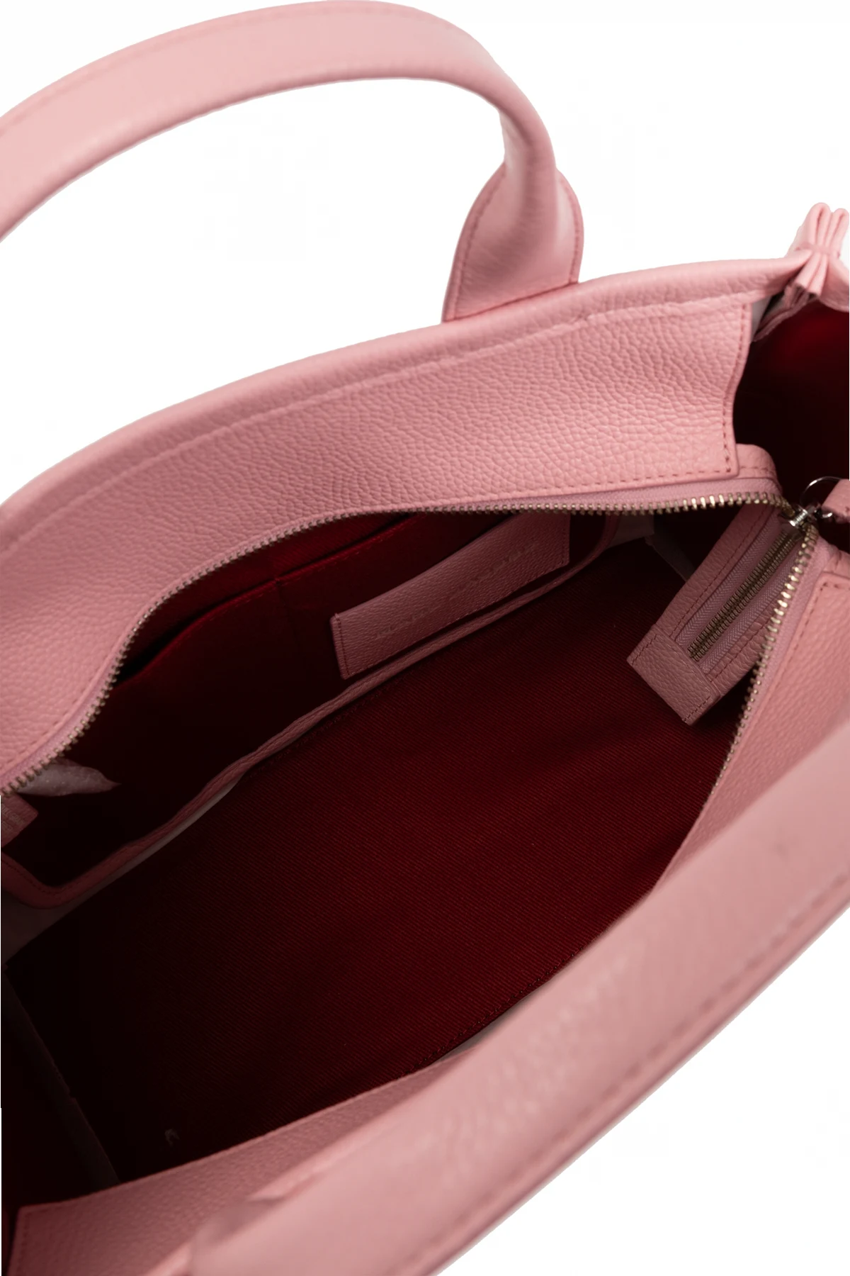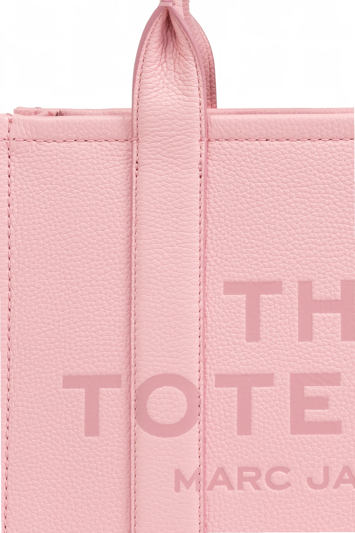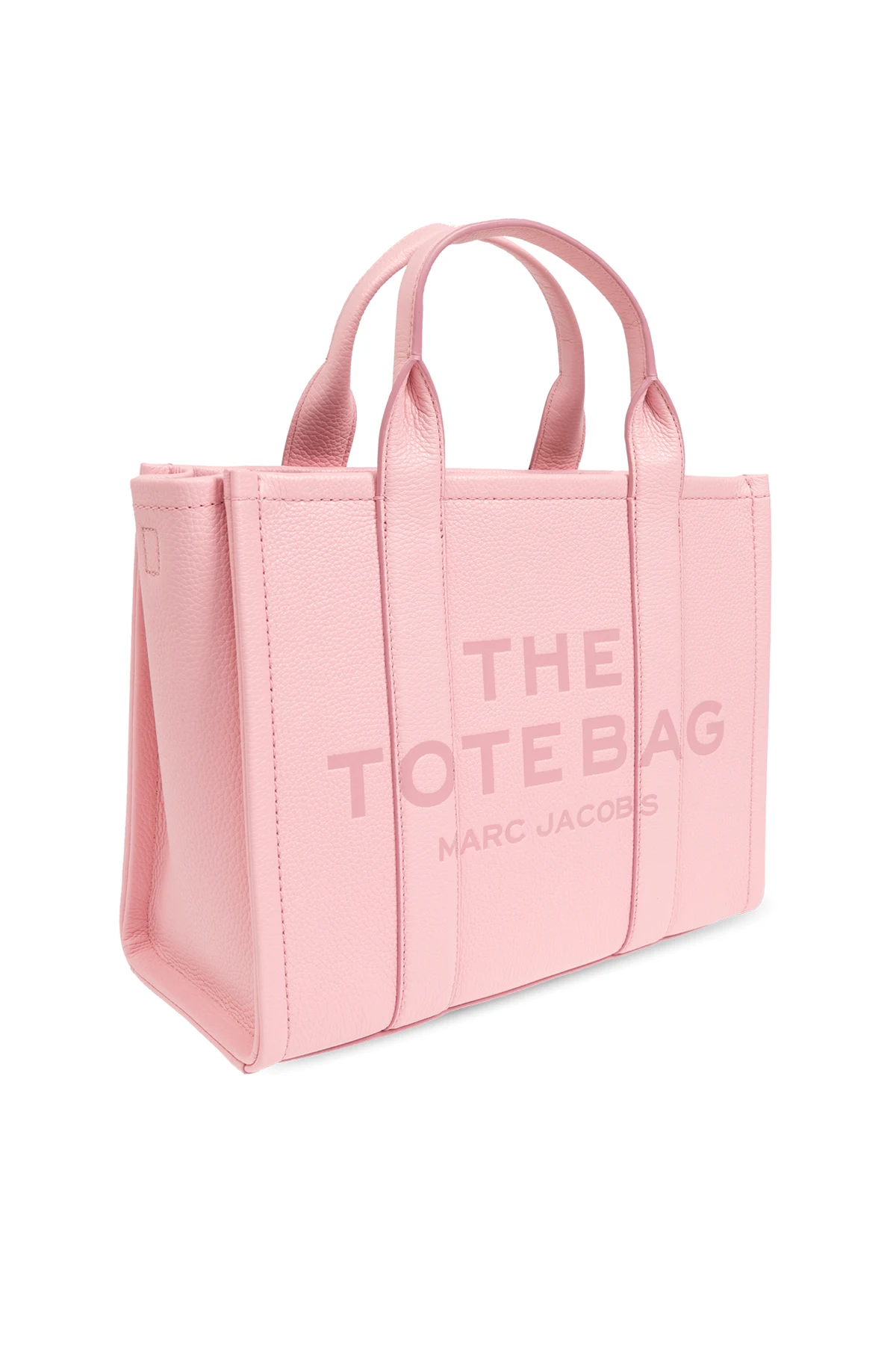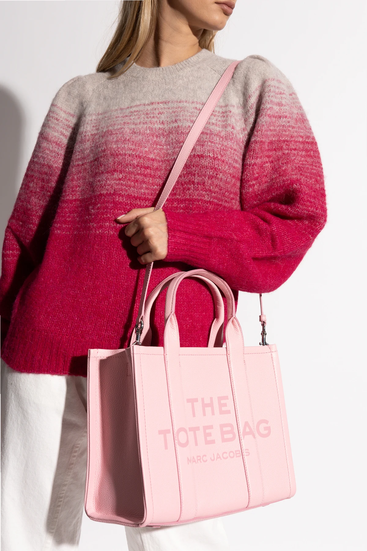 Torba wyposażona jest w dwa krótkie uchwyty oraz odpinany, dłuższy pasek na ramię, co pozwala na różnorodne sposoby noszenia. Na przedniej stronie torby widnieje duży, wyraźny napis "THE TOTE BAG" oraz mniejszy napis "MARC JACOBS" , harmonijnie dopasowane kolorystycznie do całości. Wzmacniające przeszycia oraz bordowe wnętrze dodają torbie unikatowego uroku i kontrastu.