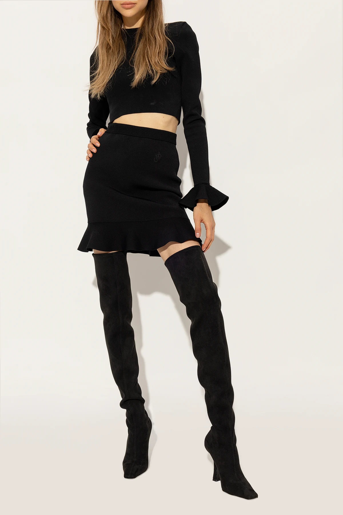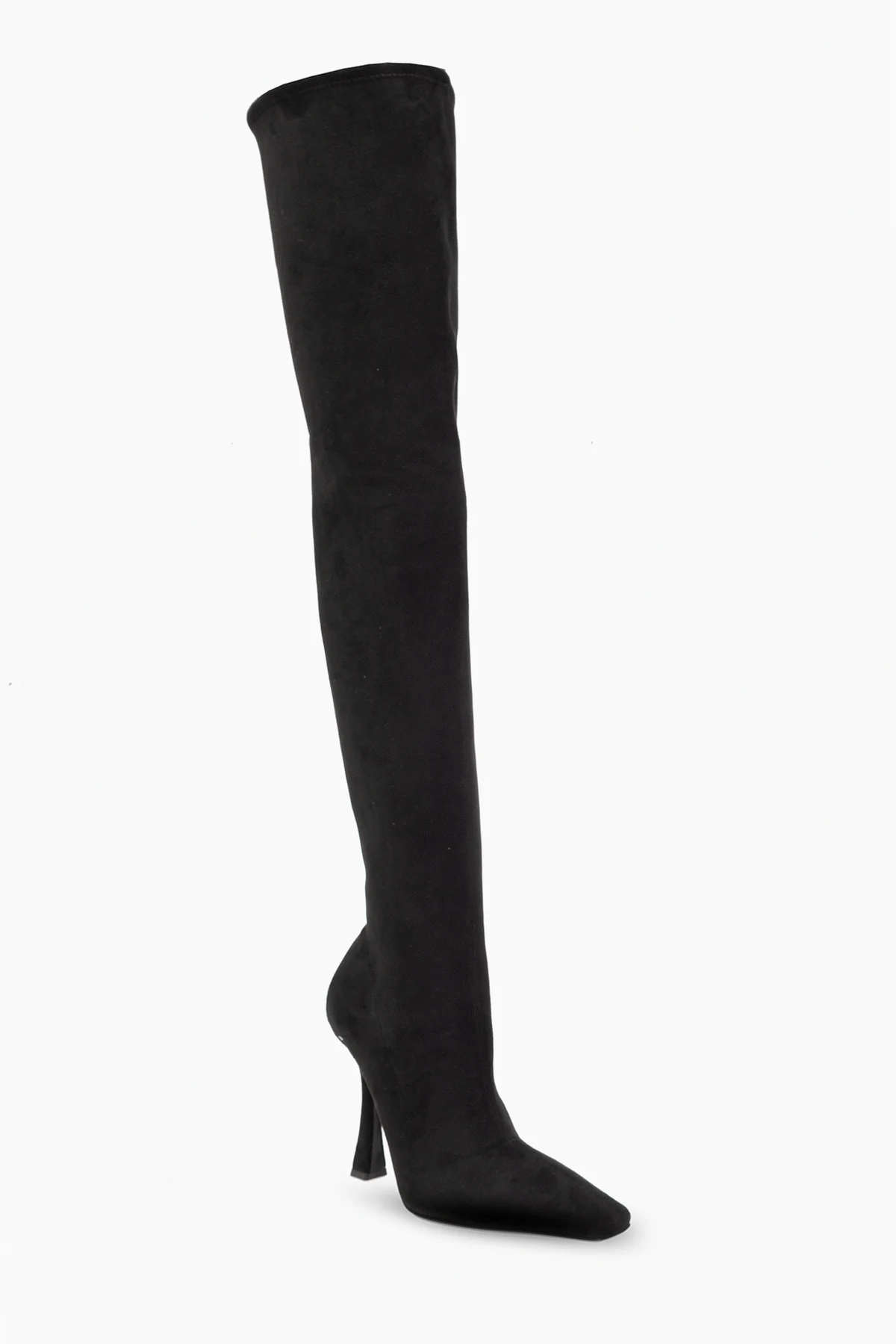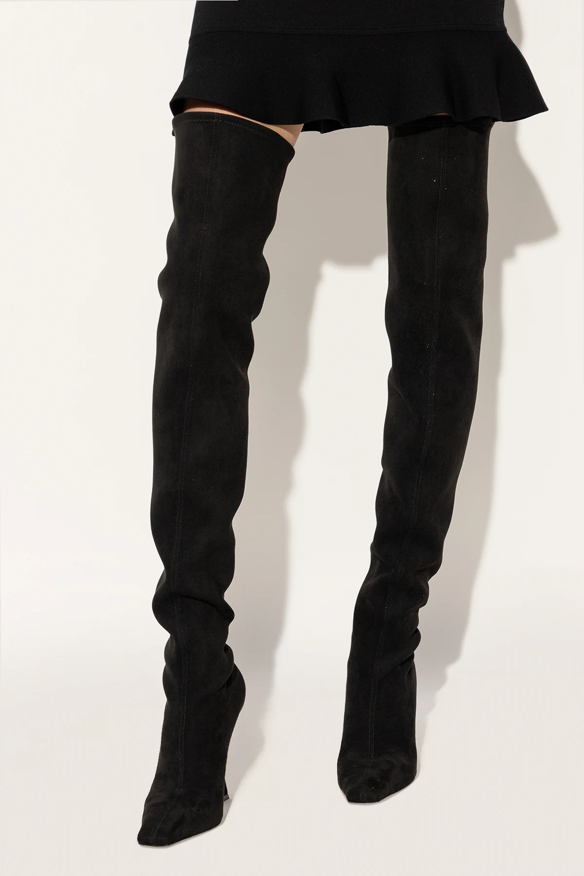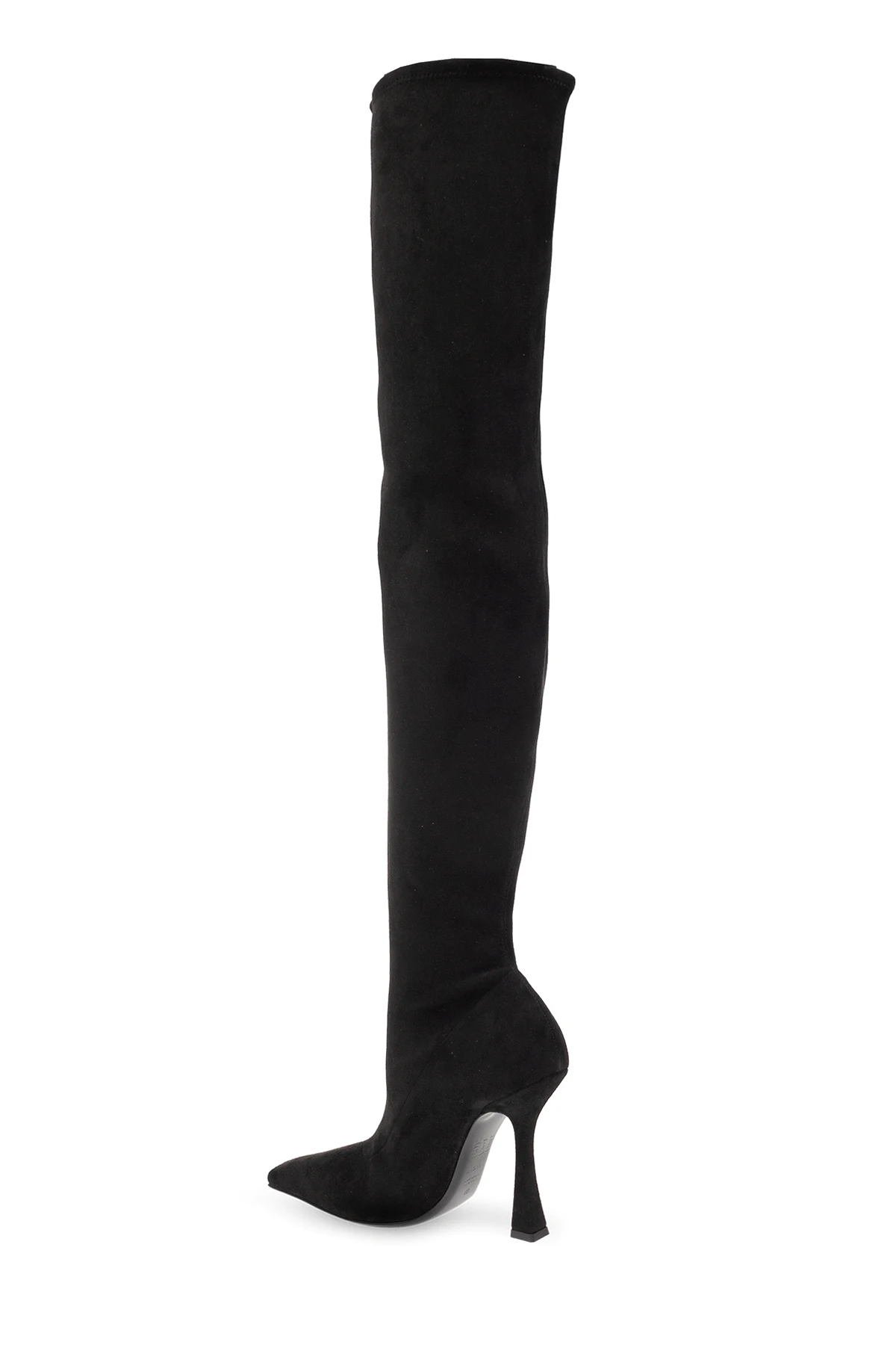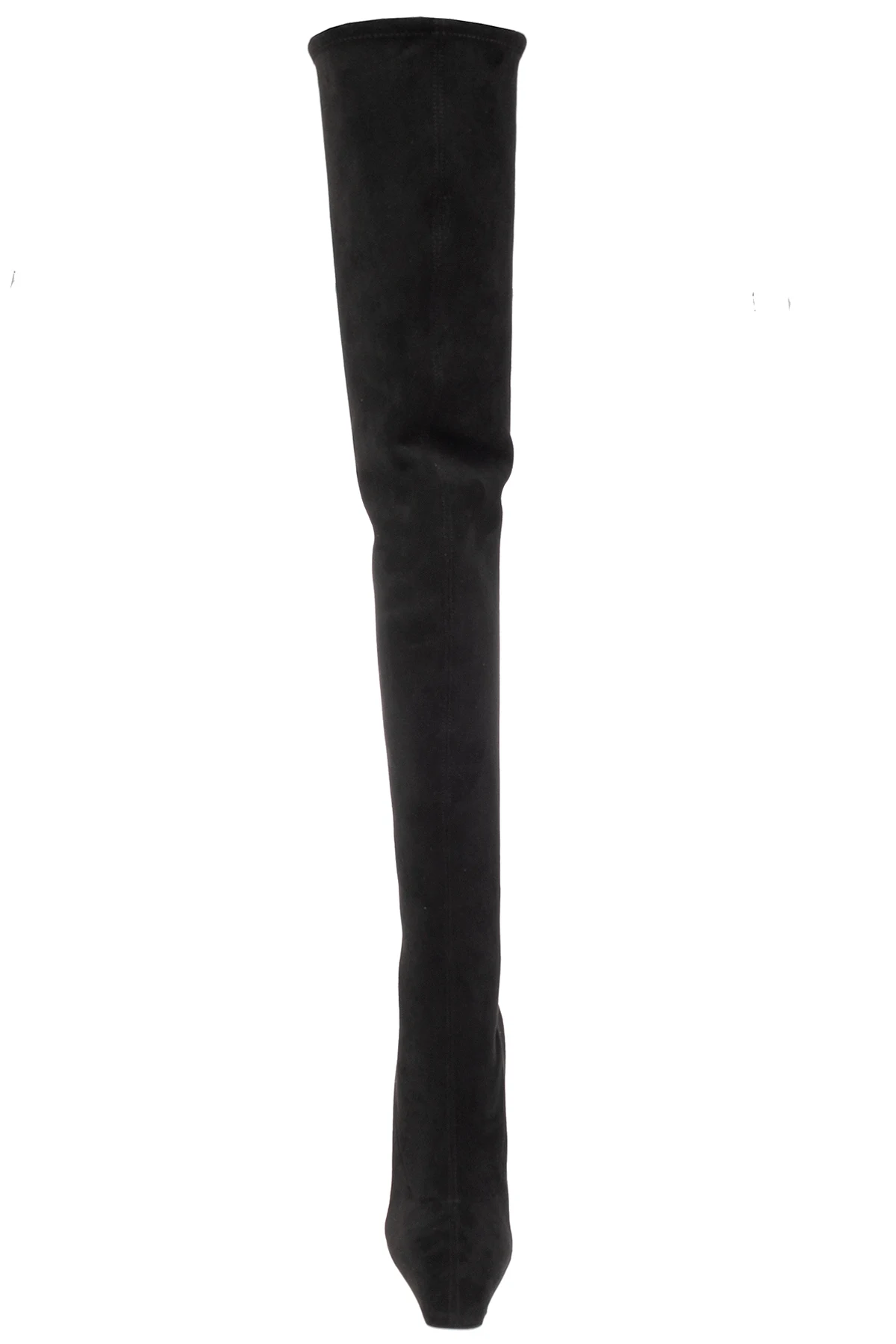 Czarne, wsuwane kozaki na obcasie Casadei. Wykonane z zamszu. Cholewka o długości za kolano. Wydłużony, zwężany nosek. Czarna, skórzana podeszwa.