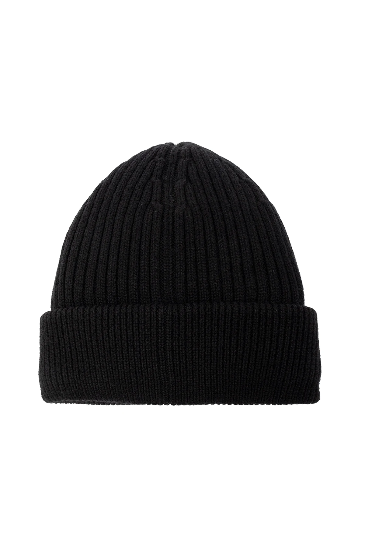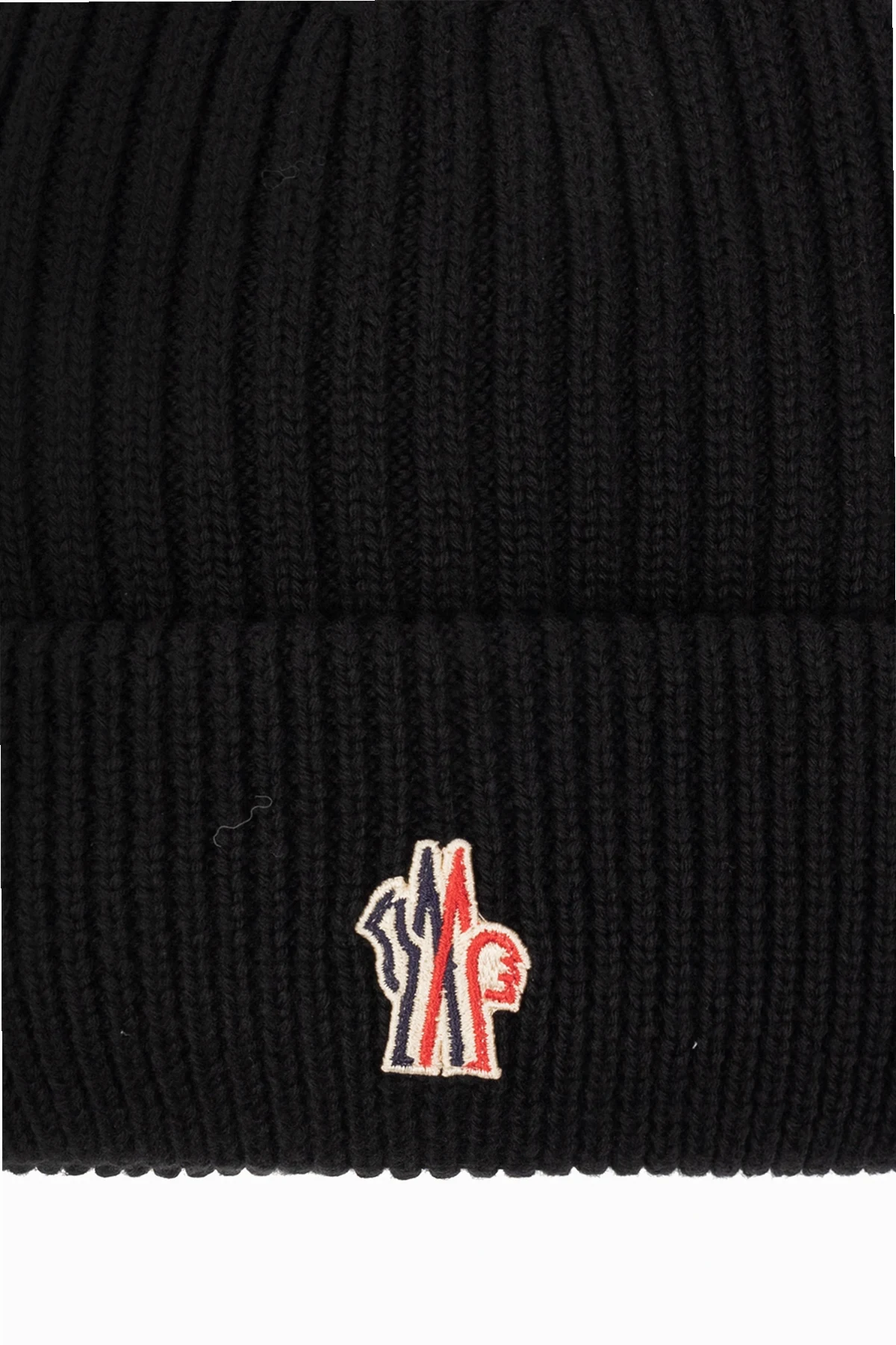 Czarna czapka Moncler Grenoble, kolekcja ‘Apres-Ski’. Wykonana z wełny o dekoracyjnym splocie. Ozdobiona kolorową naszywką z logo. Puchowe wypełnienie.